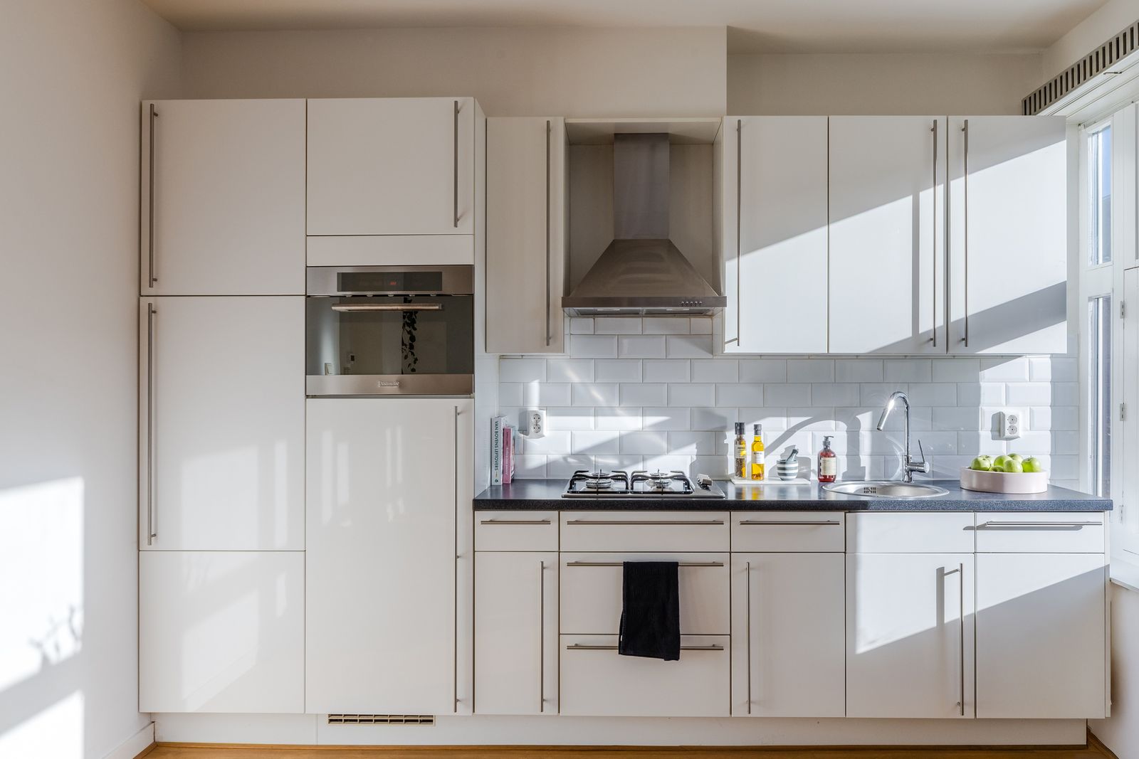- Luxe tijdloze keuken met combioven, koel-vriescombinatie, vaatwasser en kookplaat.