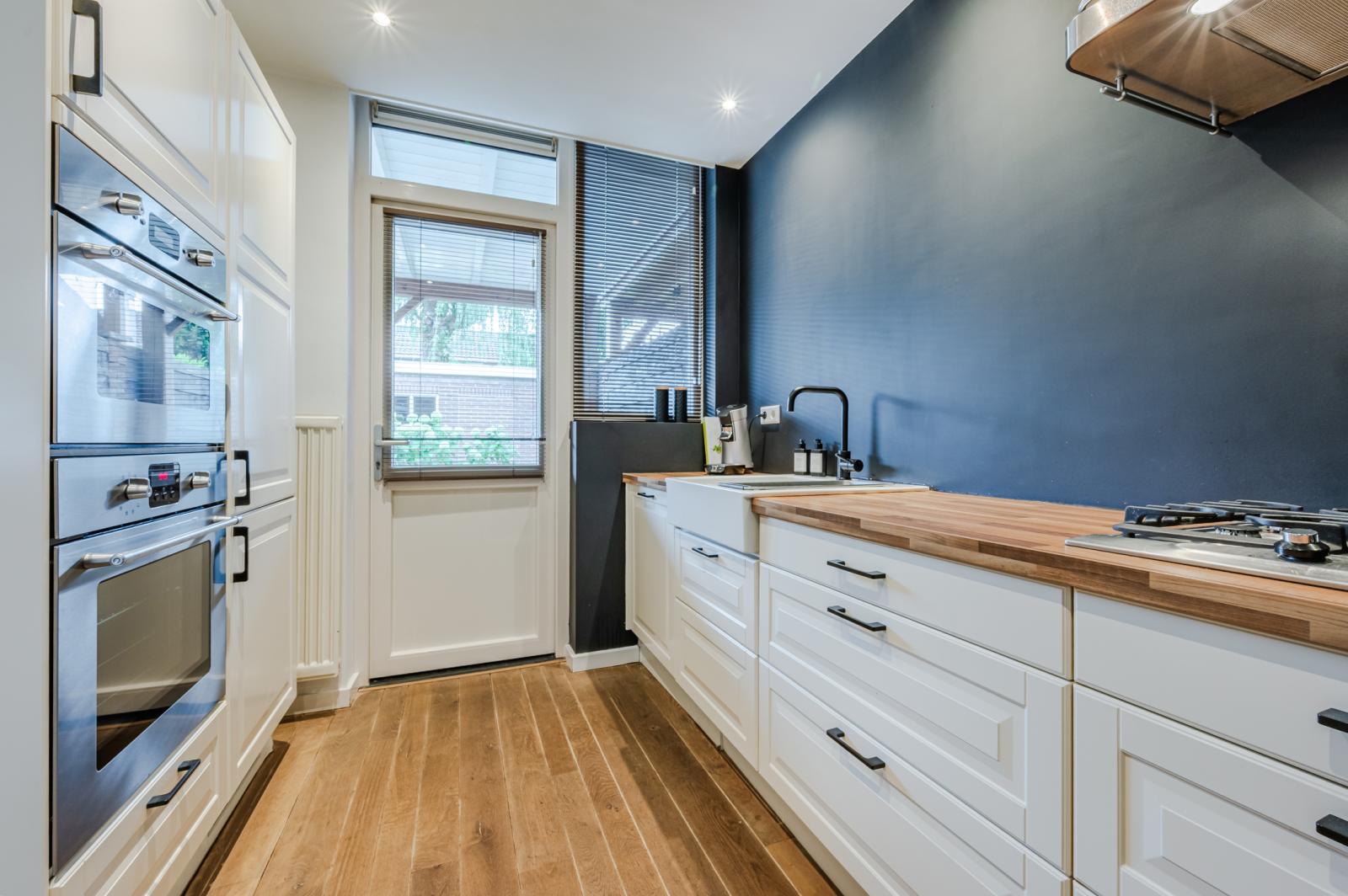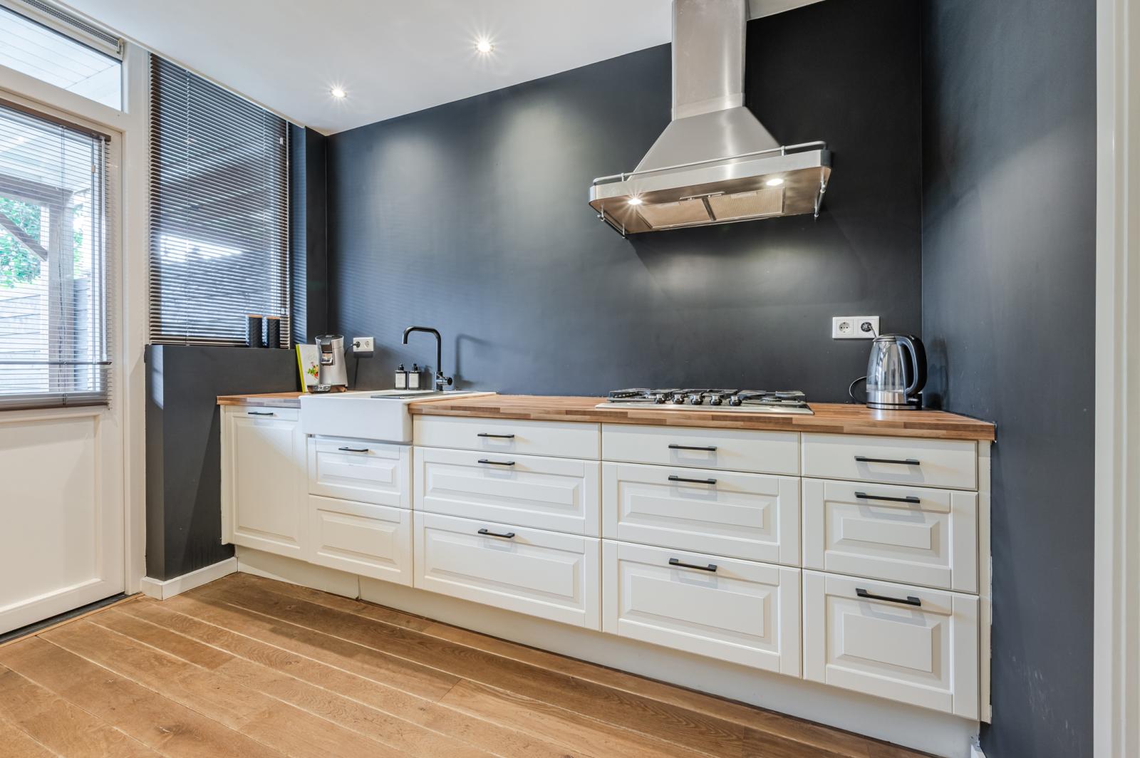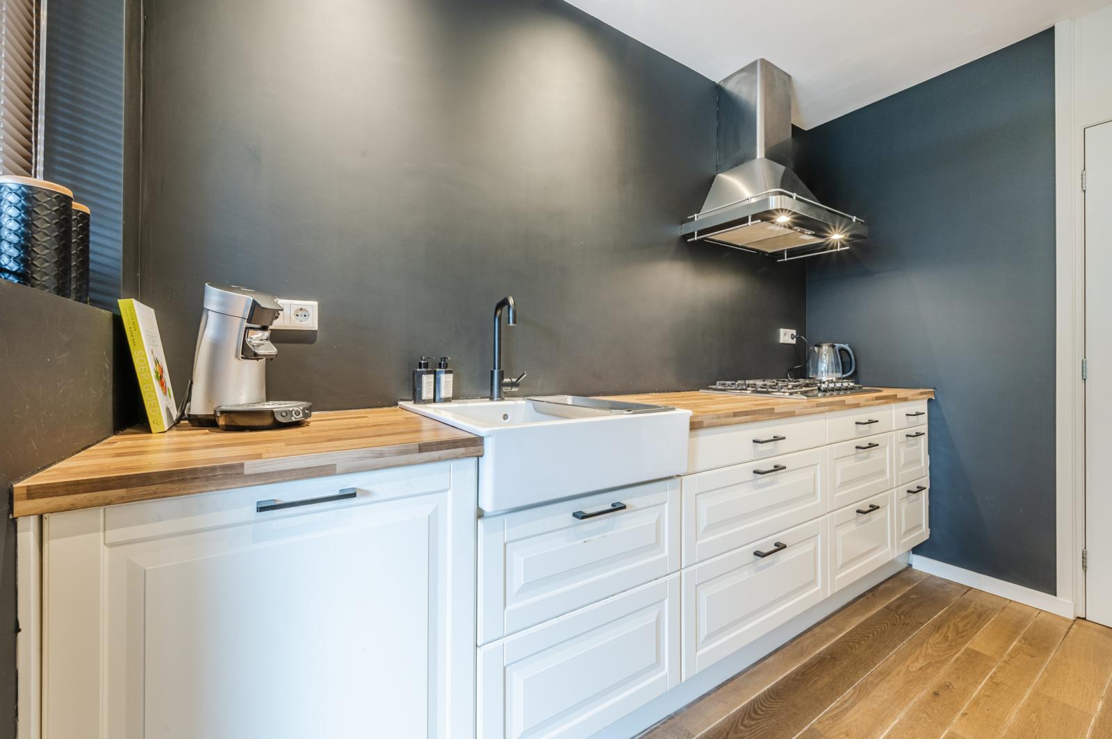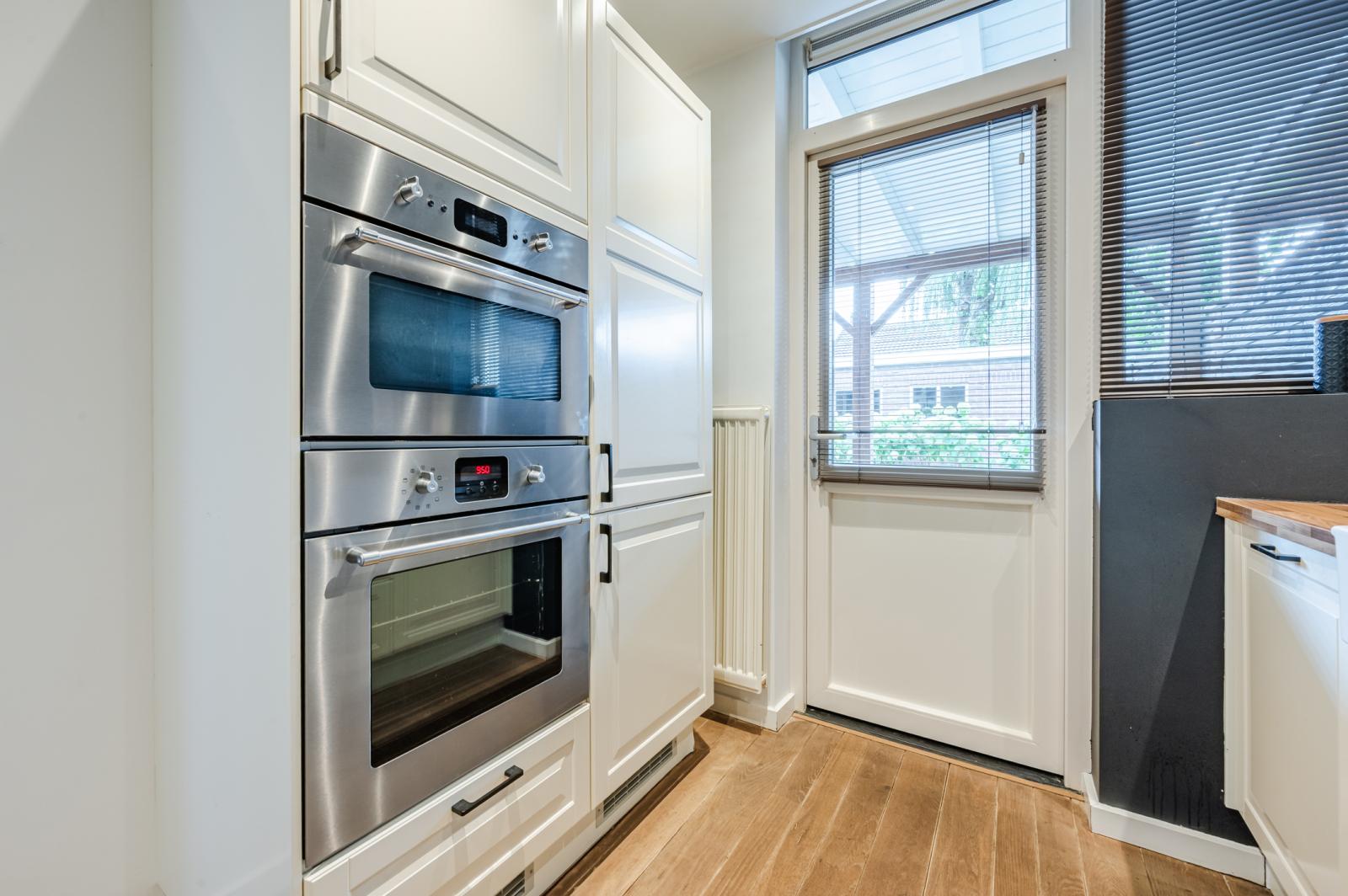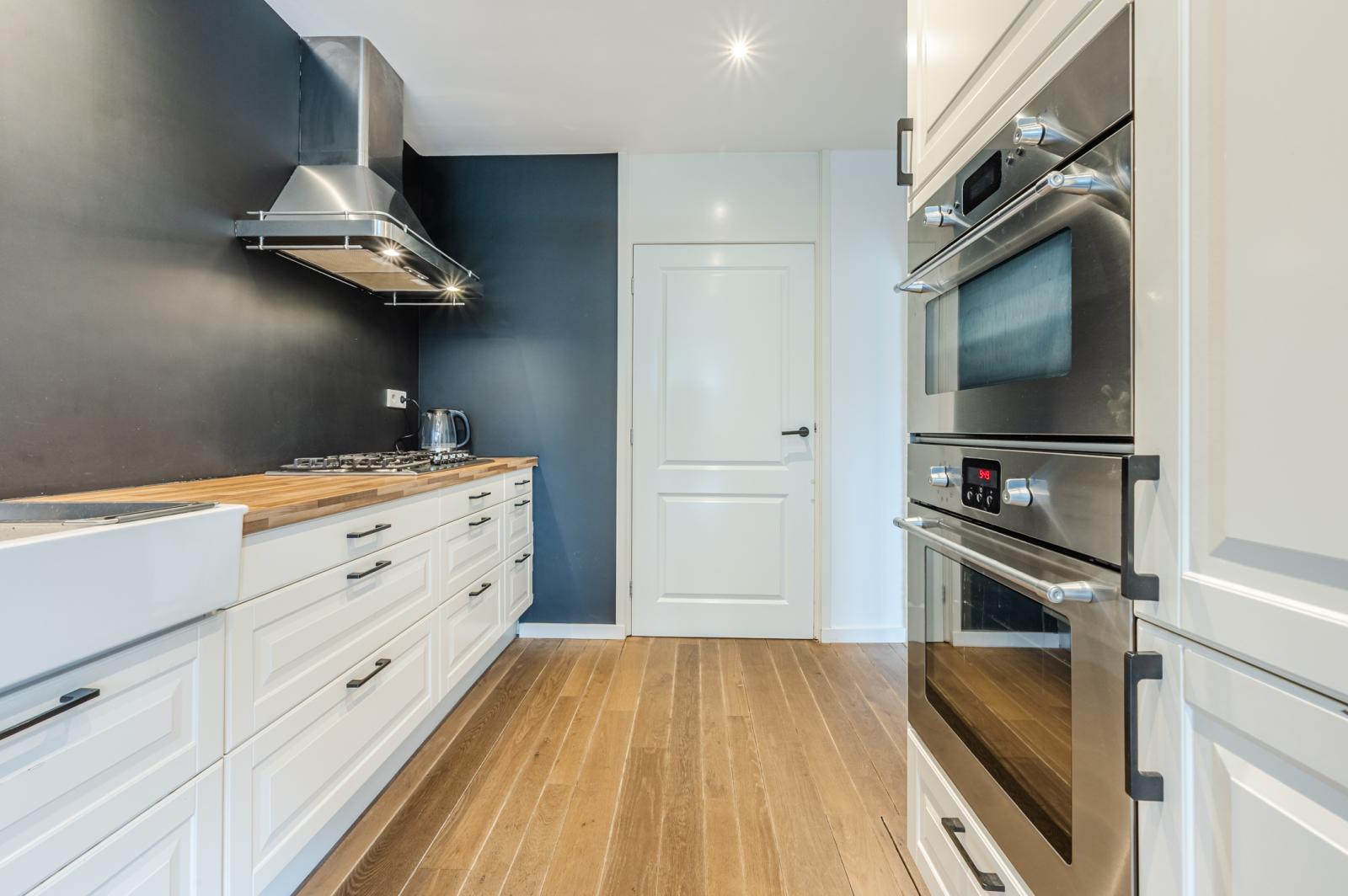 De mooie keuken bestaat uit een keukenblok en een kastenwand. Het heeft een fraai design met witte keukenkastjes en een houtkleurig werkblad. Deze keuken is uitgerust met de volgende apparatuur: vaatwasser, gasfornuis, afzuigkap, oven, magnetron, koelkast en vriezer. Dankzij de brede raampartij met openslaande deur naar de tuin geniet je hier van veel daglicht. Verder wordt de keuken verlicht met inbouwspots.
