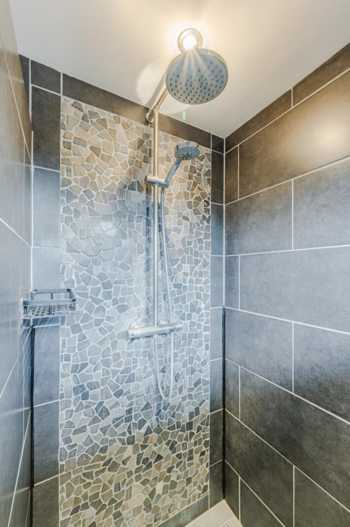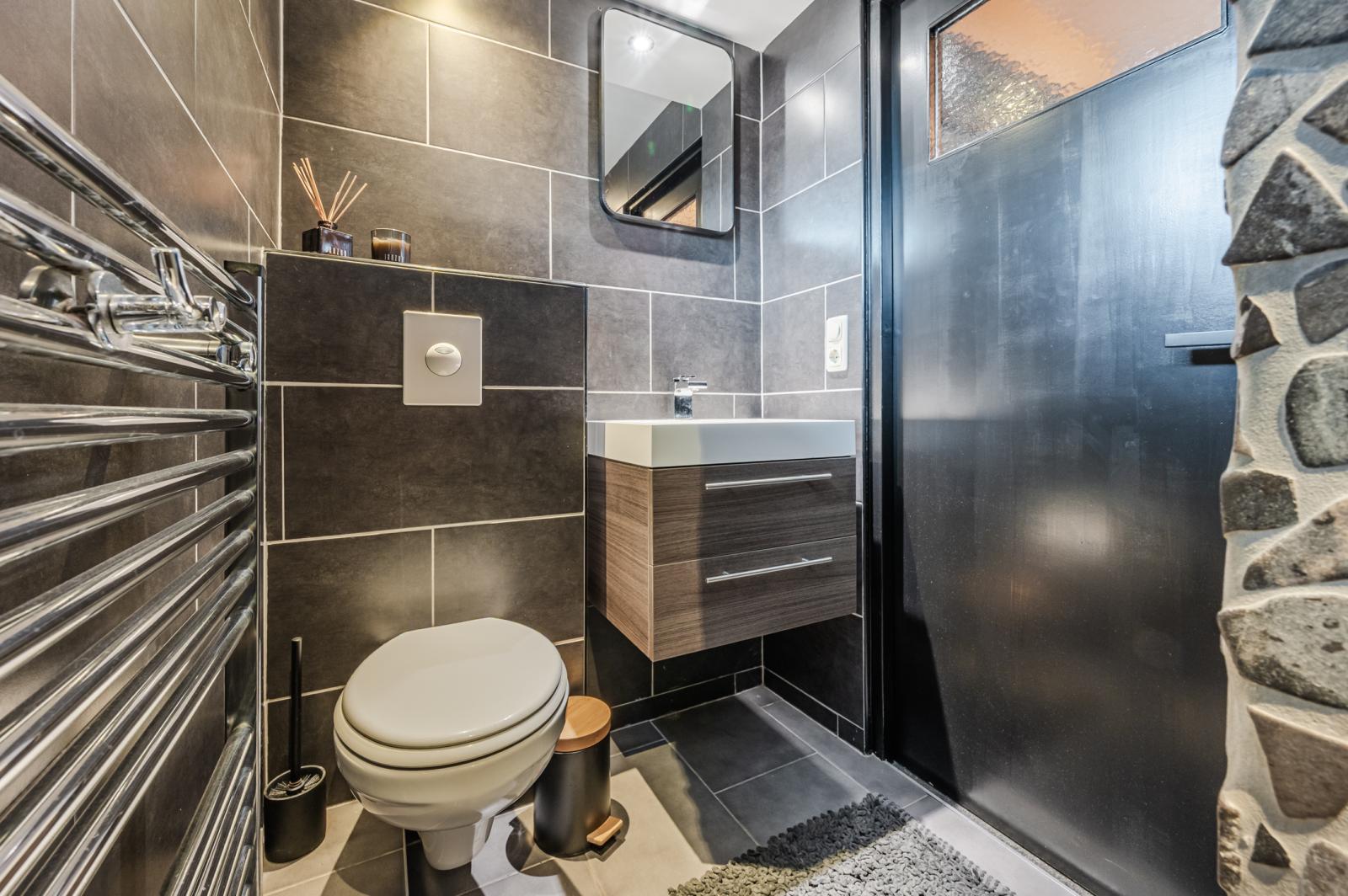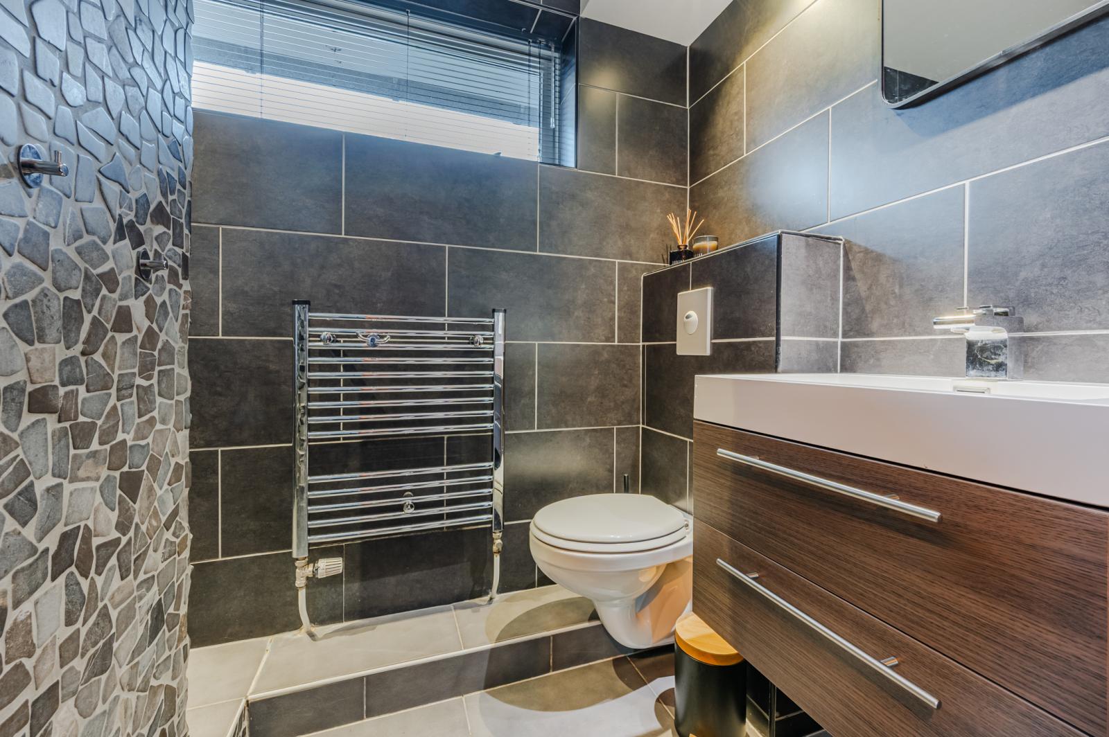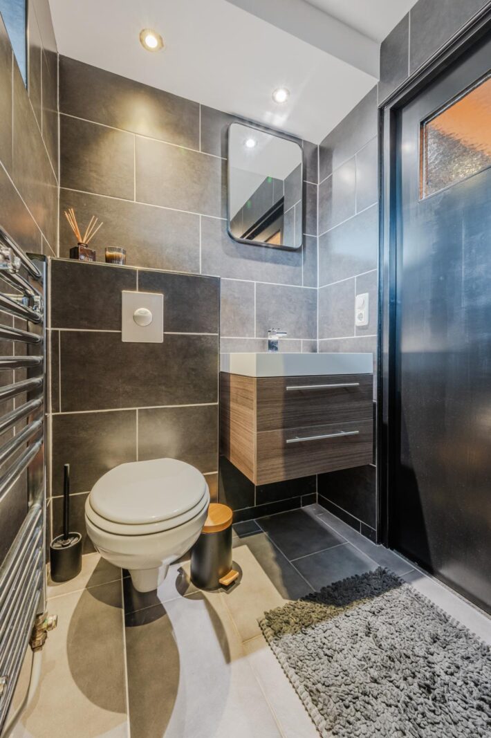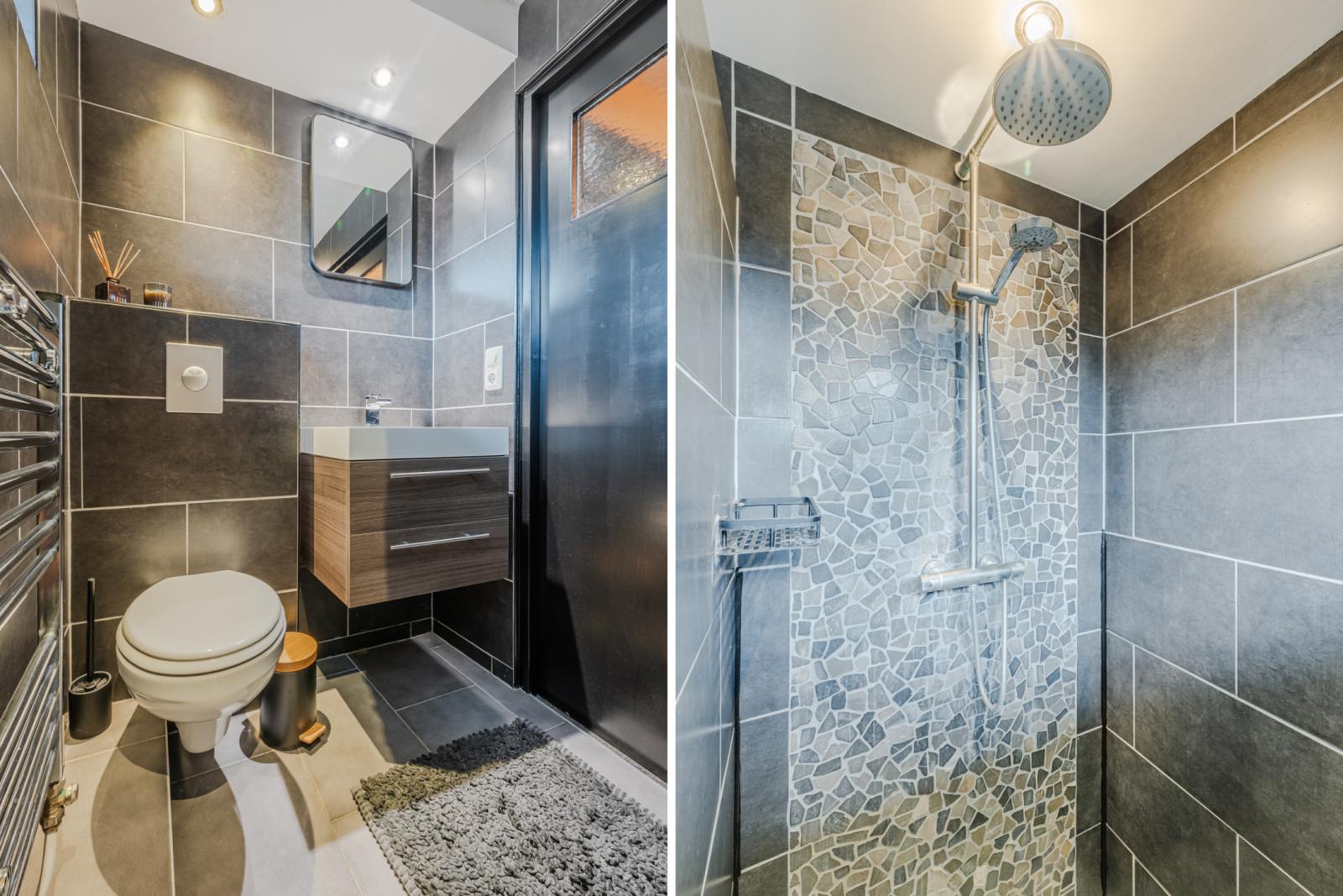 De nette badkamer is afgewerkt met zwarte tegels en uitgerust met een zwevend toilet, badmeubel met wastafel en inloopdouche met regendouche. Deze ruimte wordt verlicht met inbouwspots.