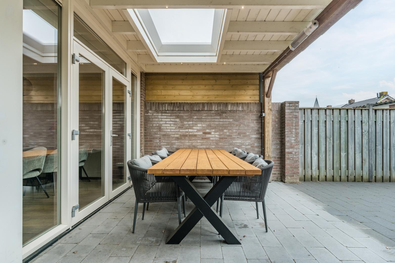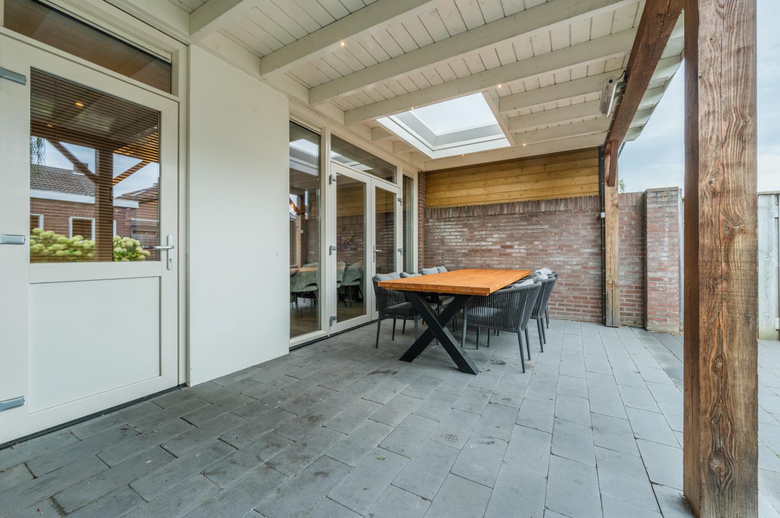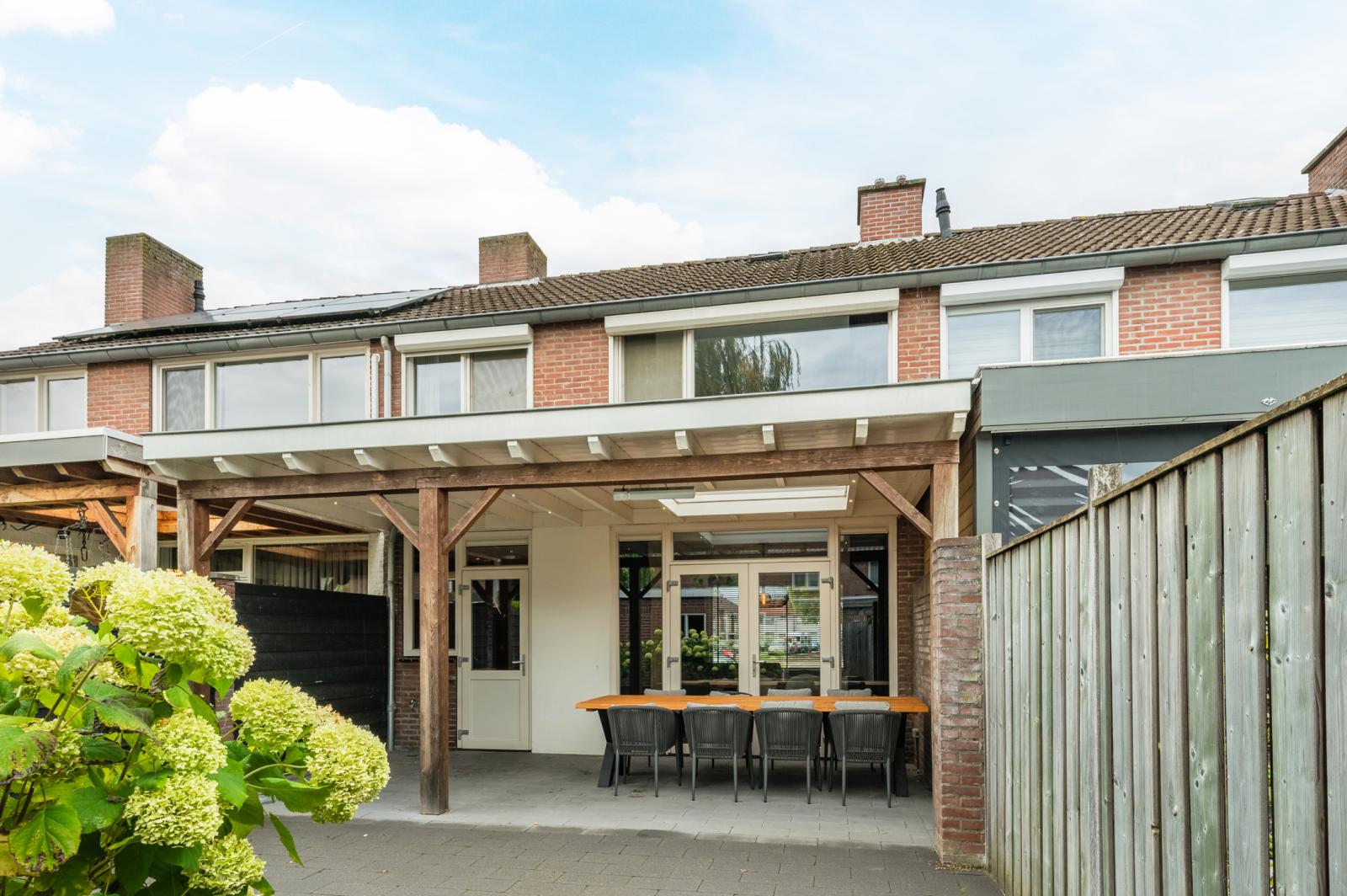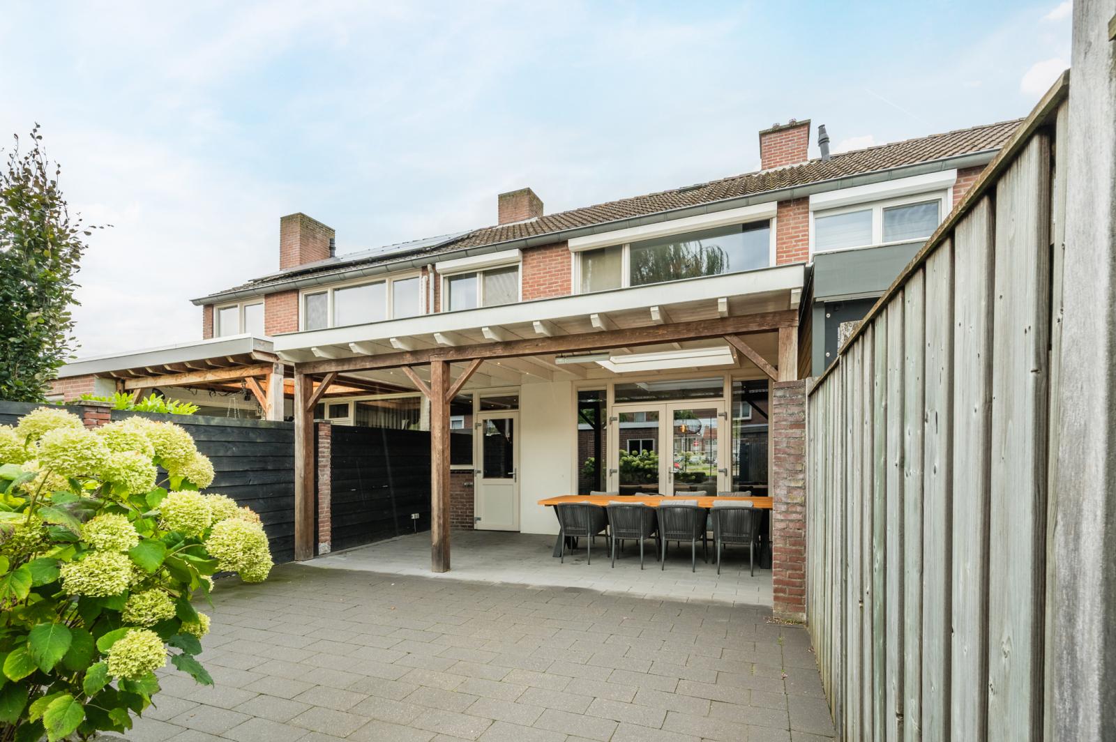 The house has a well-maintained backyard. The garden is tiled and therefore easy to maintain. Adjacent to the house is a large, beautiful canopy with lighting and a skylight. Here you can lounge covered and enjoy the outdoors. There is also enough space in the rest of the garden to create a lounge area. Thanks to the fence on both sides, you will enjoy plenty of privacy.
