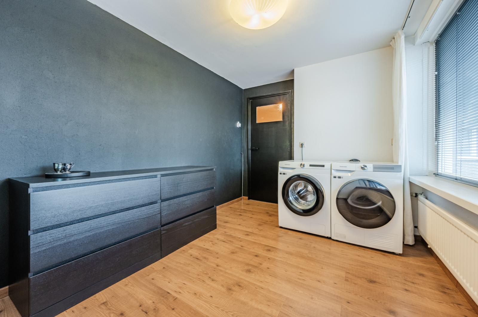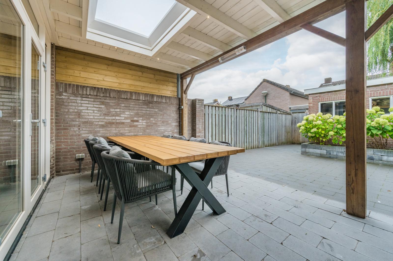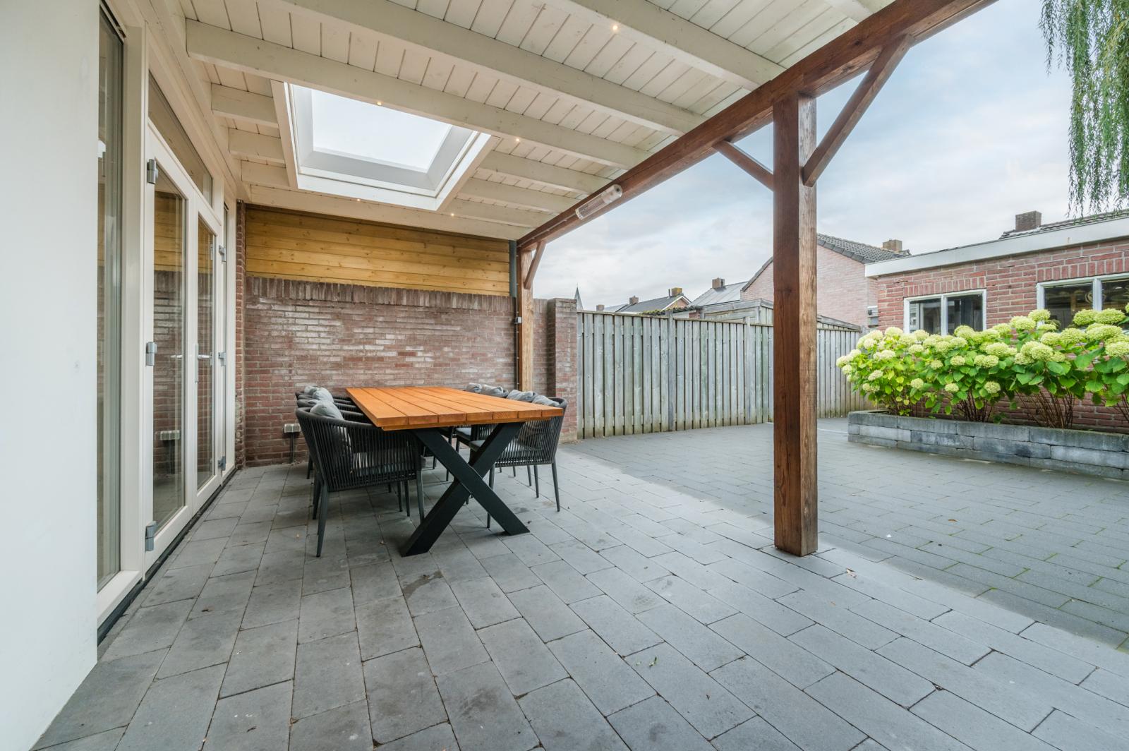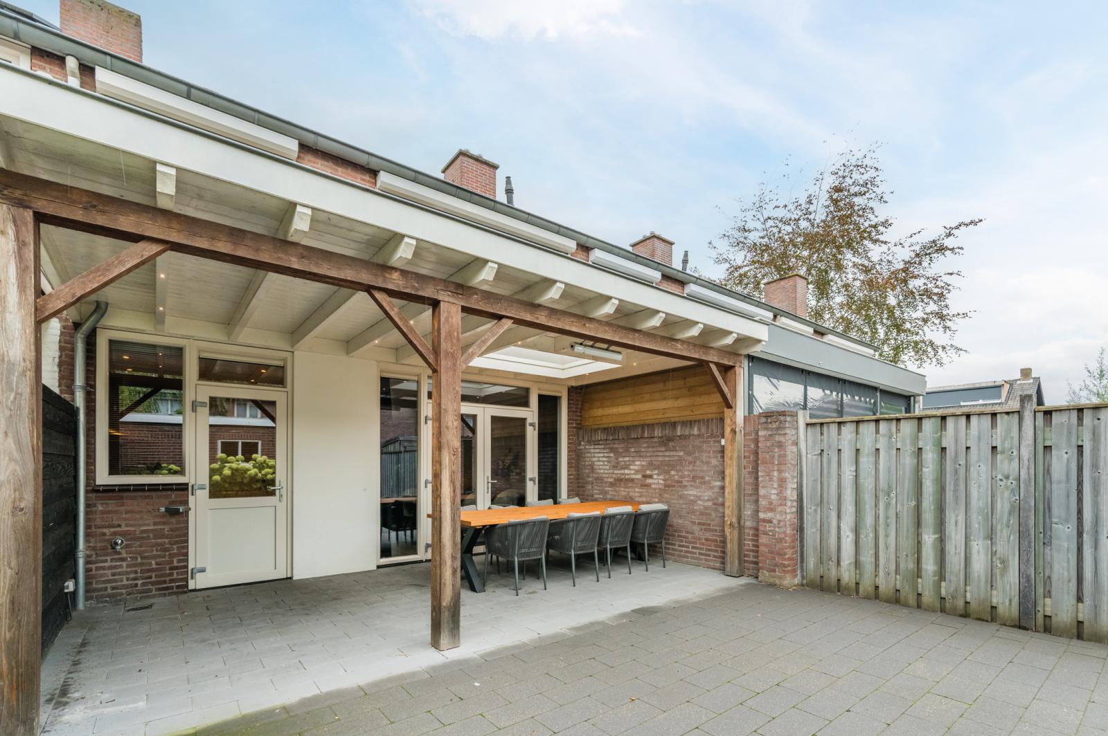 The house has a well-maintained backyard. The garden is tiled and therefore easy to maintain. Adjacent to the house is a large, beautiful canopy with lighting and a skylight. Here you can lounge covered and enjoy the outdoors. There is also enough space in the rest of the garden to create a lounge area. Thanks to the fence on both sides, you will enjoy plenty of privacy.