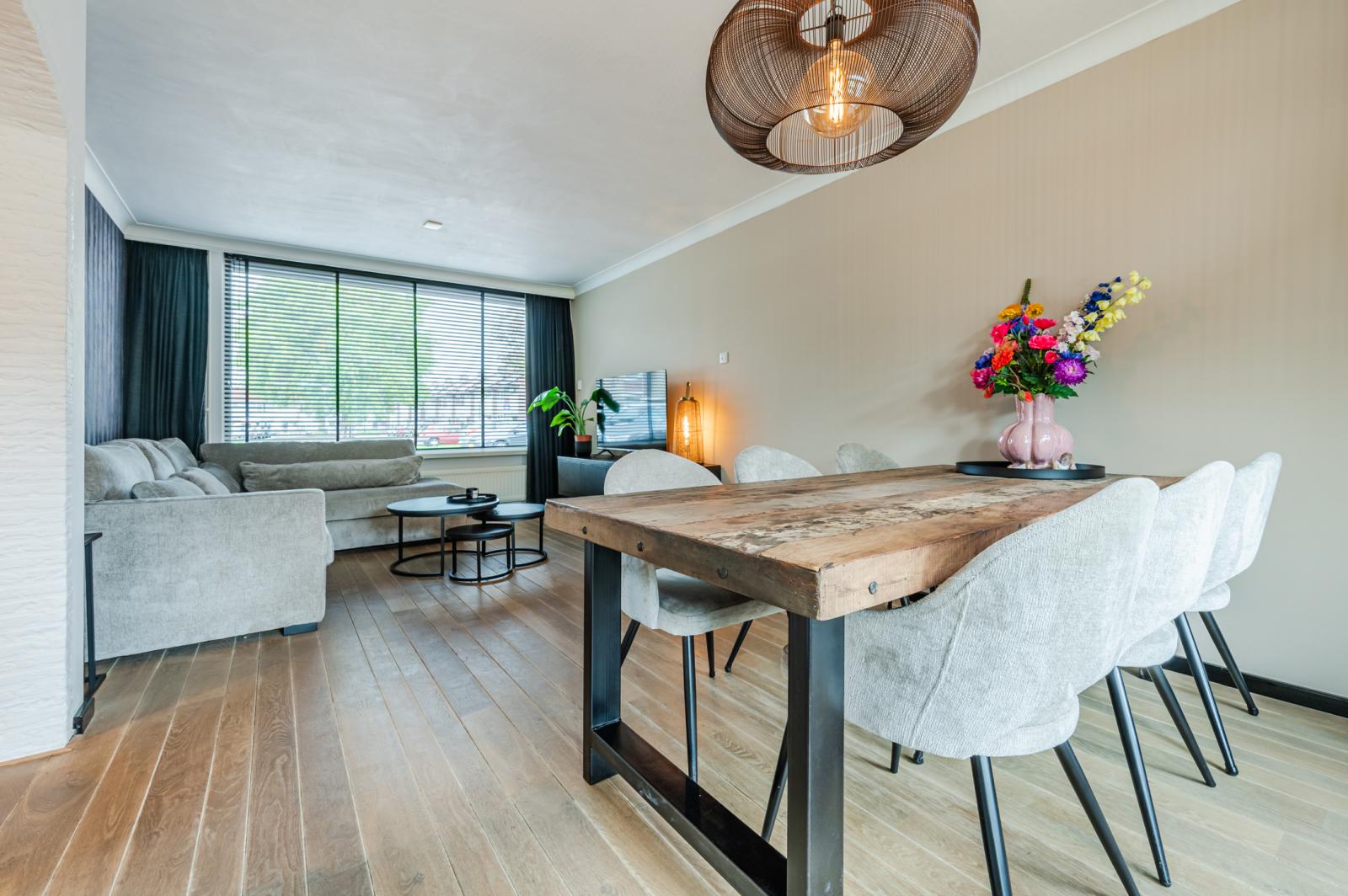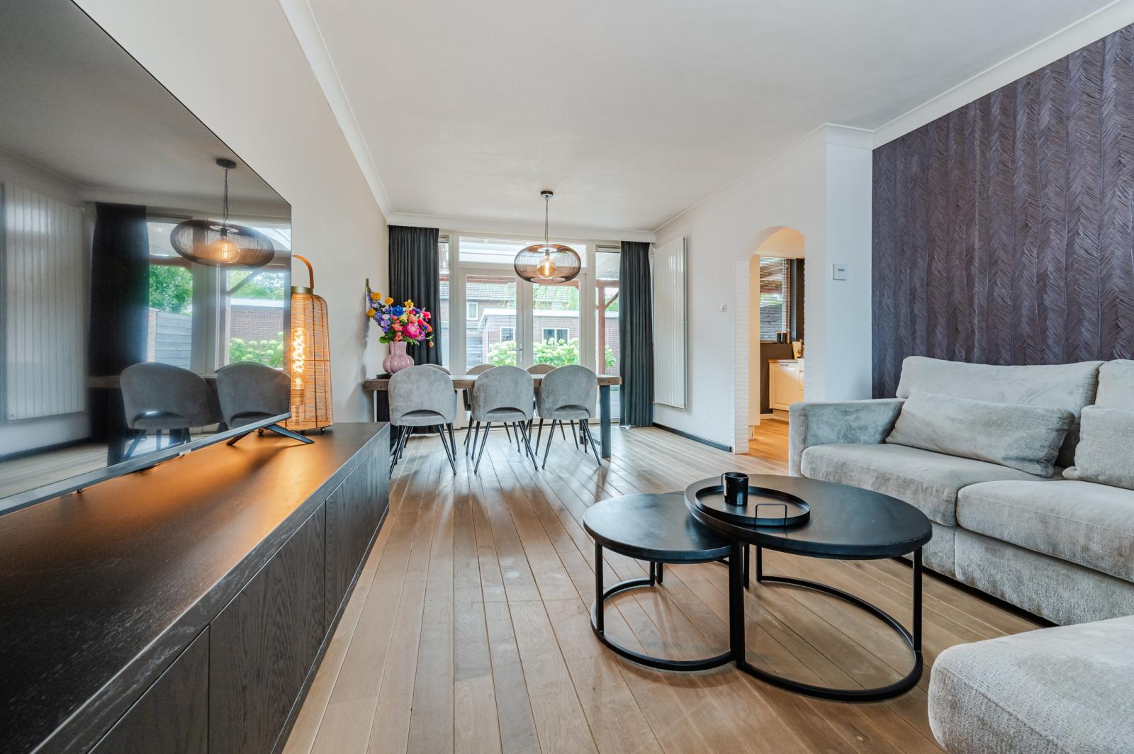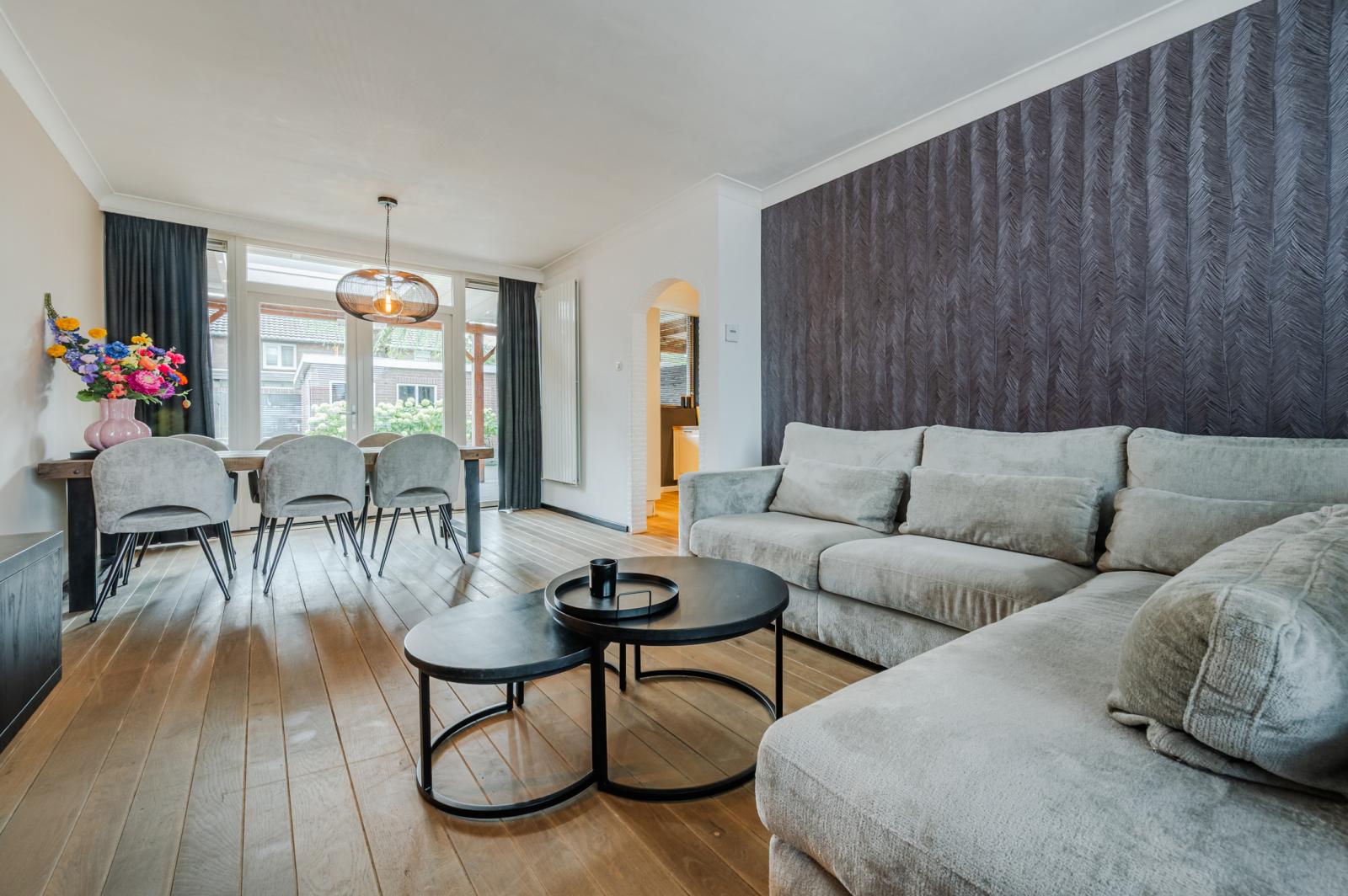 In de ruime doorzonwoonkamer ligt een prachtige houten vloer en zijn de wanden fraai afgewerkt in rustige en warme kleuren. De grote raampartij aan de voorzijde en de openslaande tuindeuren aan de achterzijde maken de woonkamer heerlijk licht en ruimtelijk.