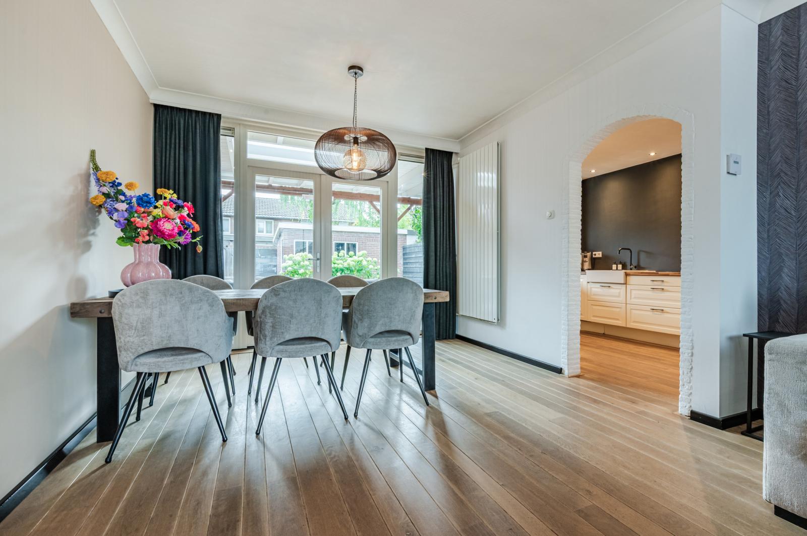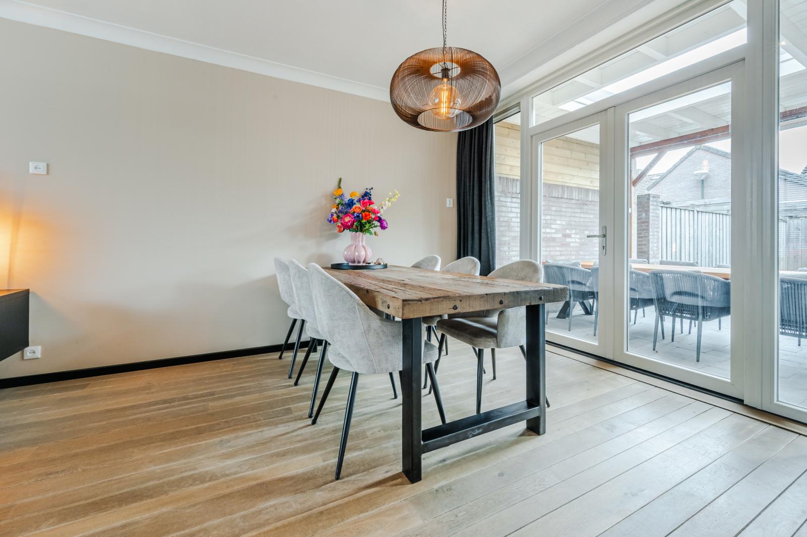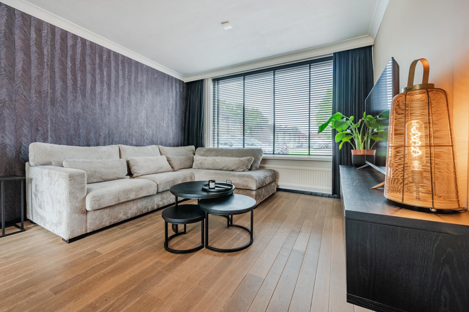 In de ruime doorzonwoonkamer ligt een prachtige houten vloer en zijn de wanden fraai afgewerkt in rustige en warme kleuren. De grote raampartij aan de voorzijde en de openslaande tuindeuren aan de achterzijde maken de woonkamer heerlijk licht en ruimtelijk.