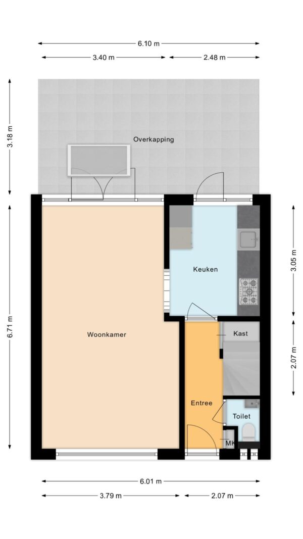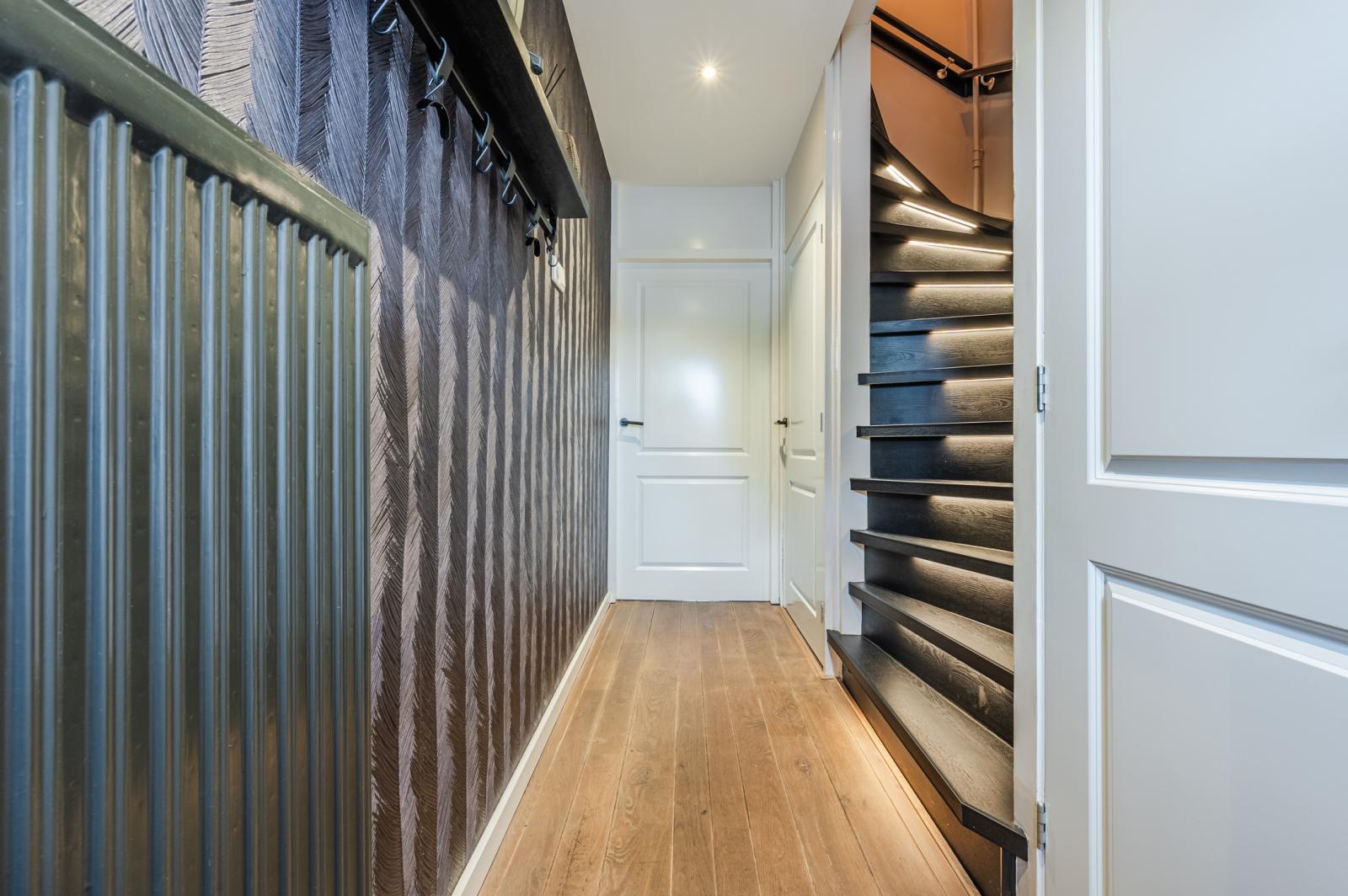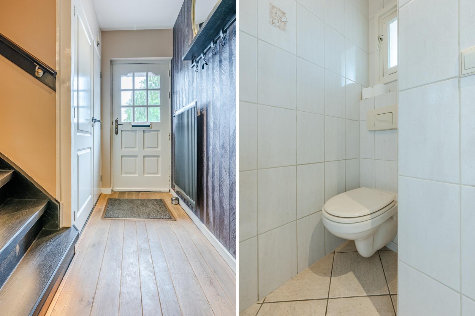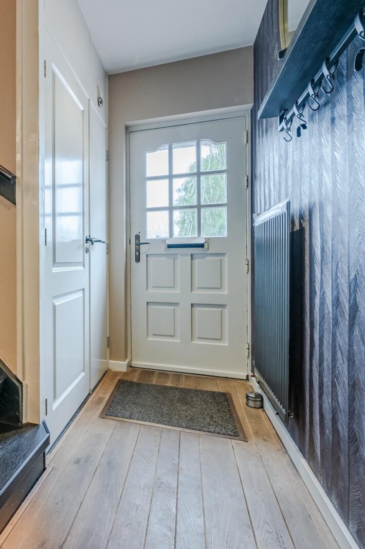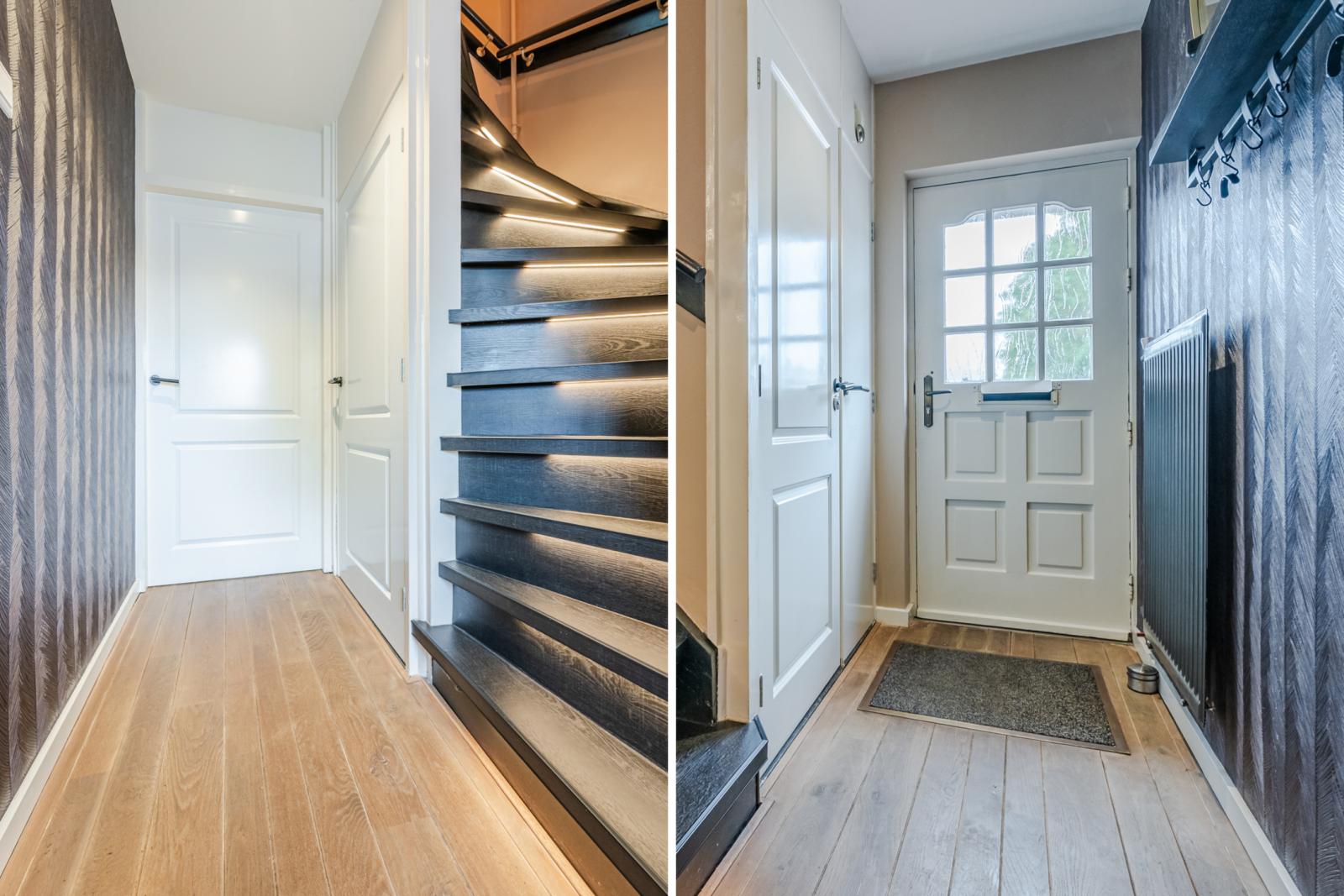 Via de straat bereik je de overdekte voordeur van deze prachtige woning. Na binnenkomst word je verwelkomd in een ruime en fraai afgewerkte entreehal. Vanuit hier bereik je de meterkast, een toiletruimte met zwevend toilet en fonteintje, de trapopgang met verlichting, trapkast en de keuken.