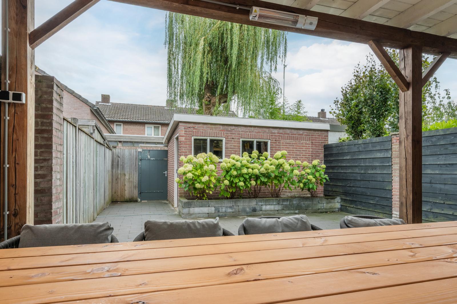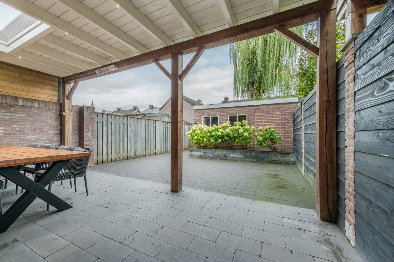 Het huis beschikt over een netjes verzorgde achtertuin. De tuin is ingericht met tegels en daardoor onderhoudsvriendelijk. Direct aan het huis grenst een grote, prachtige overkapping met verlichting en een lichtstraat. Hier kun je heerlijk overdekt loungen en genieten van het buitenleven. Ook in de rest van de tuin is genoeg ruimte om een loungeplek in te richten. Dankzij de schutting aan beide kanten ervaar je veel privacy.