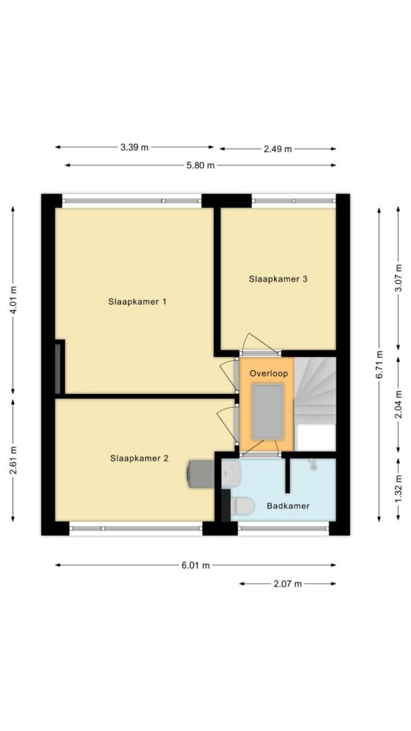 De eerste verdieping telt drie slaapkamers en een badkamer. Van de drie slaapkamers liggen er twee aan de achterzijde en één aan de voorzijde. Alle kamers zijn voorzien van een mooie laminaatvloer en keurig afgewerkte wanden. Elke slaapkamer is uitgerust met een brede raampartij, waardoor de lichtinval uitstekend is.