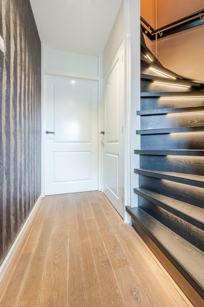 The covered front door of this beautiful home is accessible from the street. Upon entering, you are welcomed into a spacious and beautifully finished entrance hall. From here, you can access the meter cupboard, a toilet room with a floating toilet and sink, the staircase with lighting, stair cupboard and the kitchen.