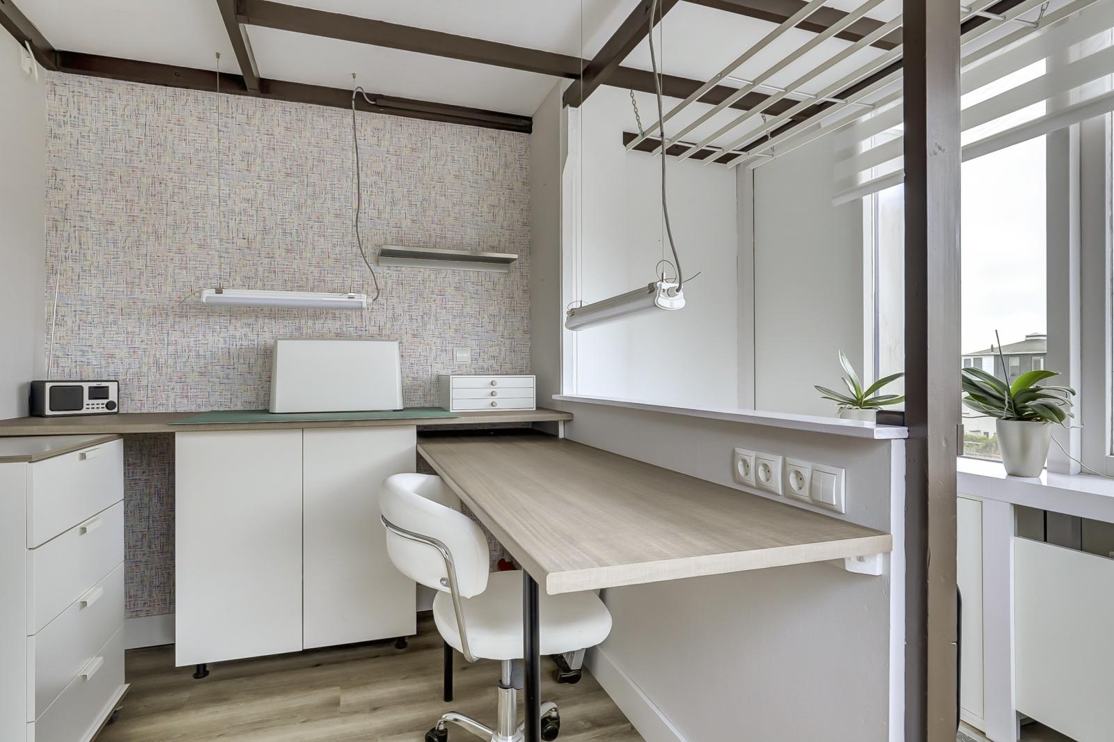 The attic floor is set up as a bright hobby or office space, with natural light coming in from two sides. An ideal area for working, guests or study.