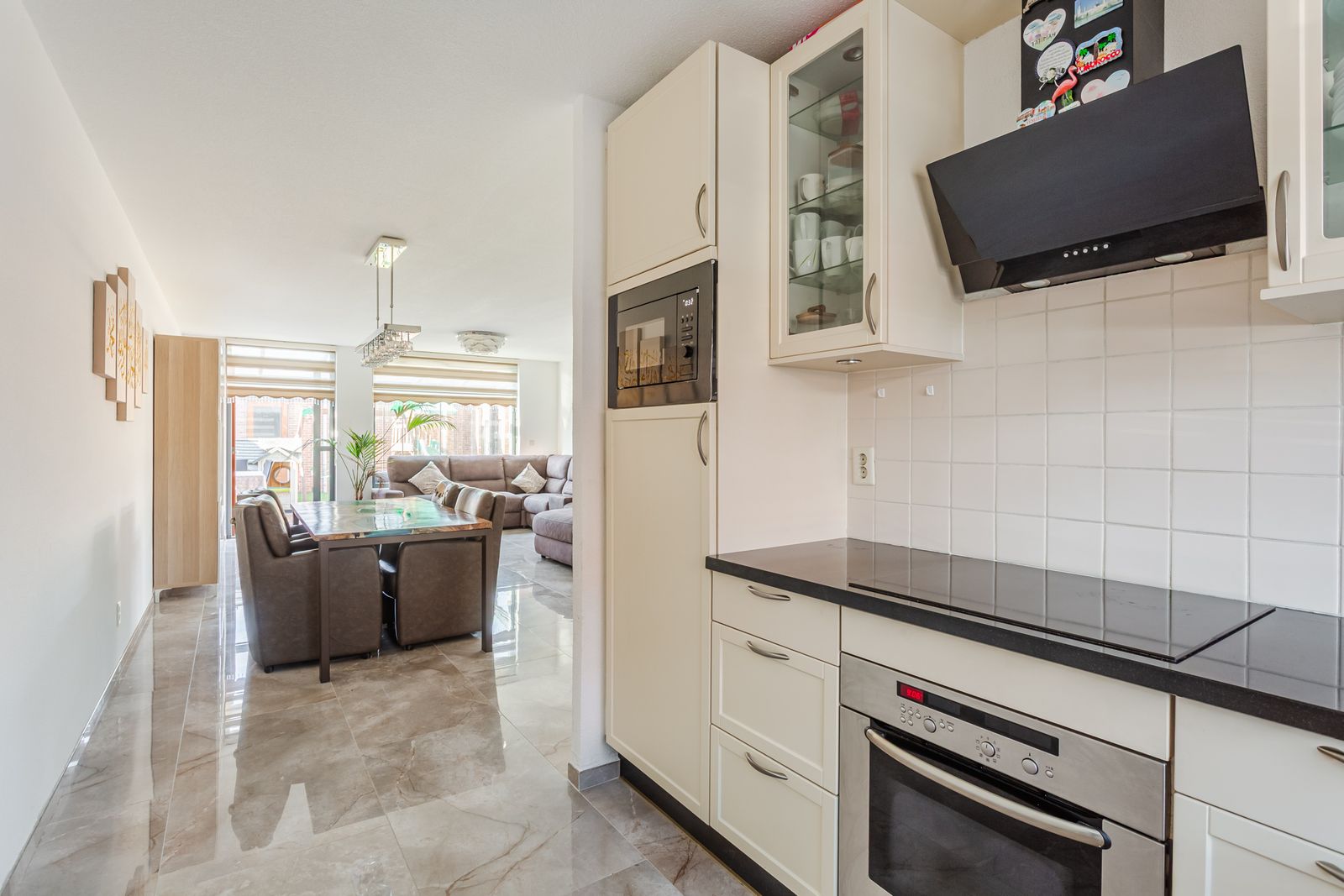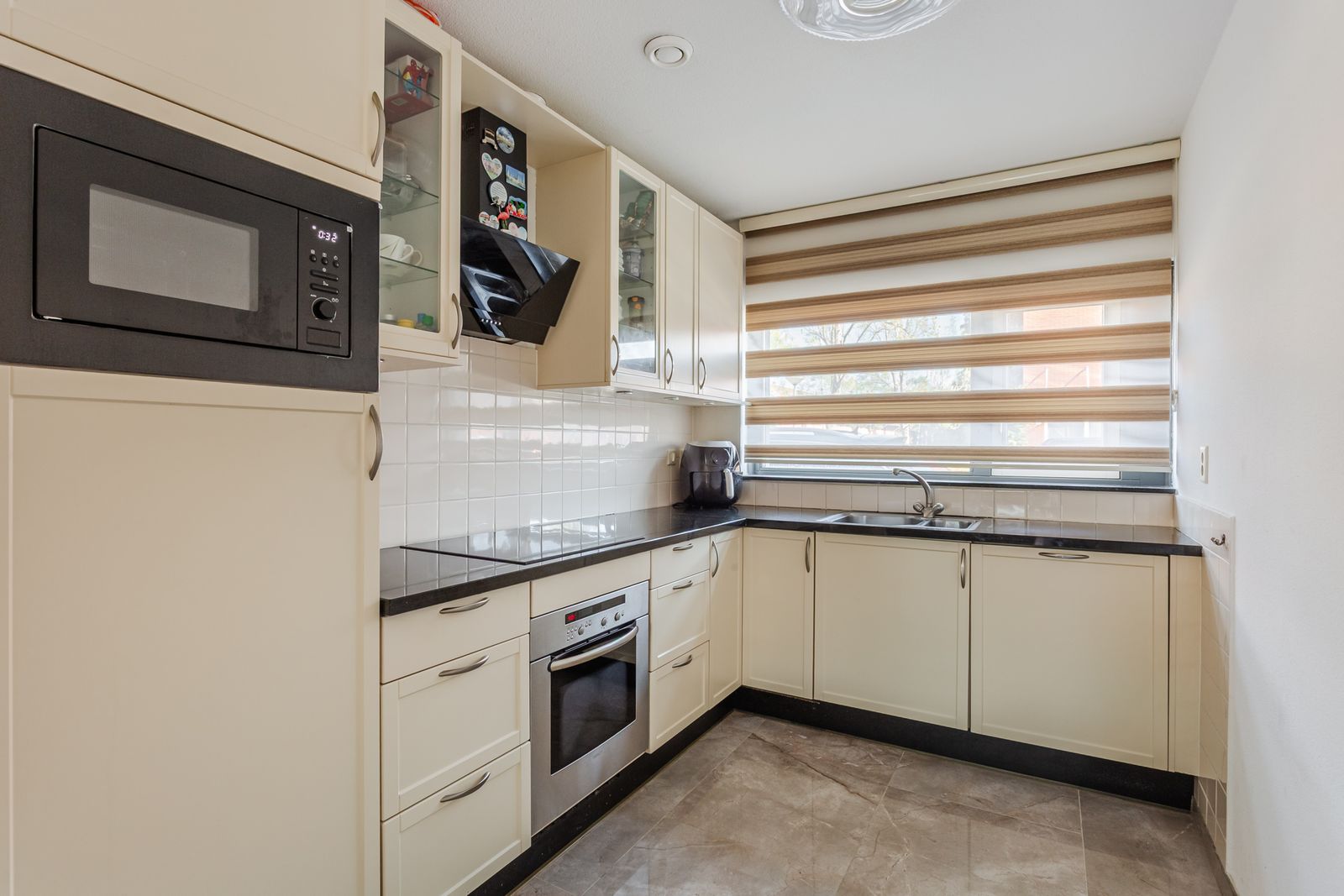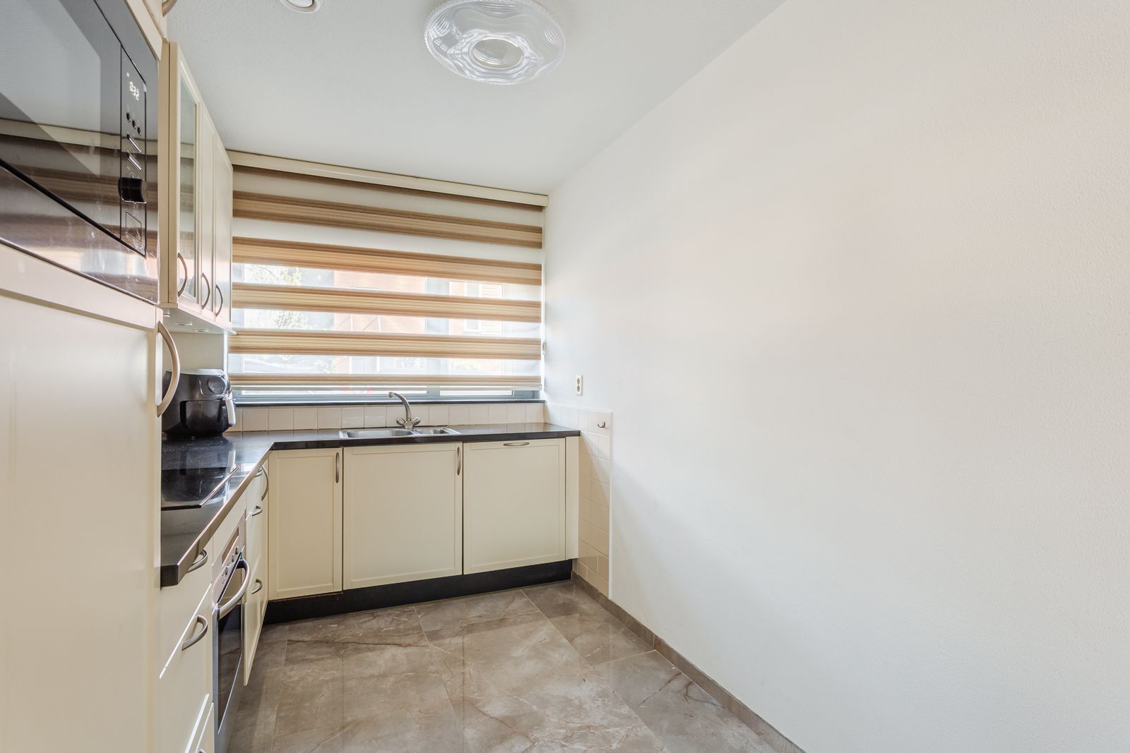 De keuken bevindt zich aan de voorzijde van de woning en is functioneel ingericht, met uitzicht op de rustige straat.