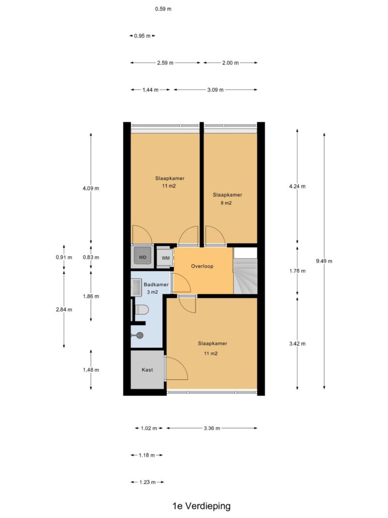 Op de eerste verdieping vind je drie slaapkamers, die flexibel in te delen zijn, bijvoorbeeld als slaap-, werk- of hobbykamer. Twee kamers beschikken over handige inbouwkasten en in één van deze kasten bevindt zich de wasmachineaansluiting.