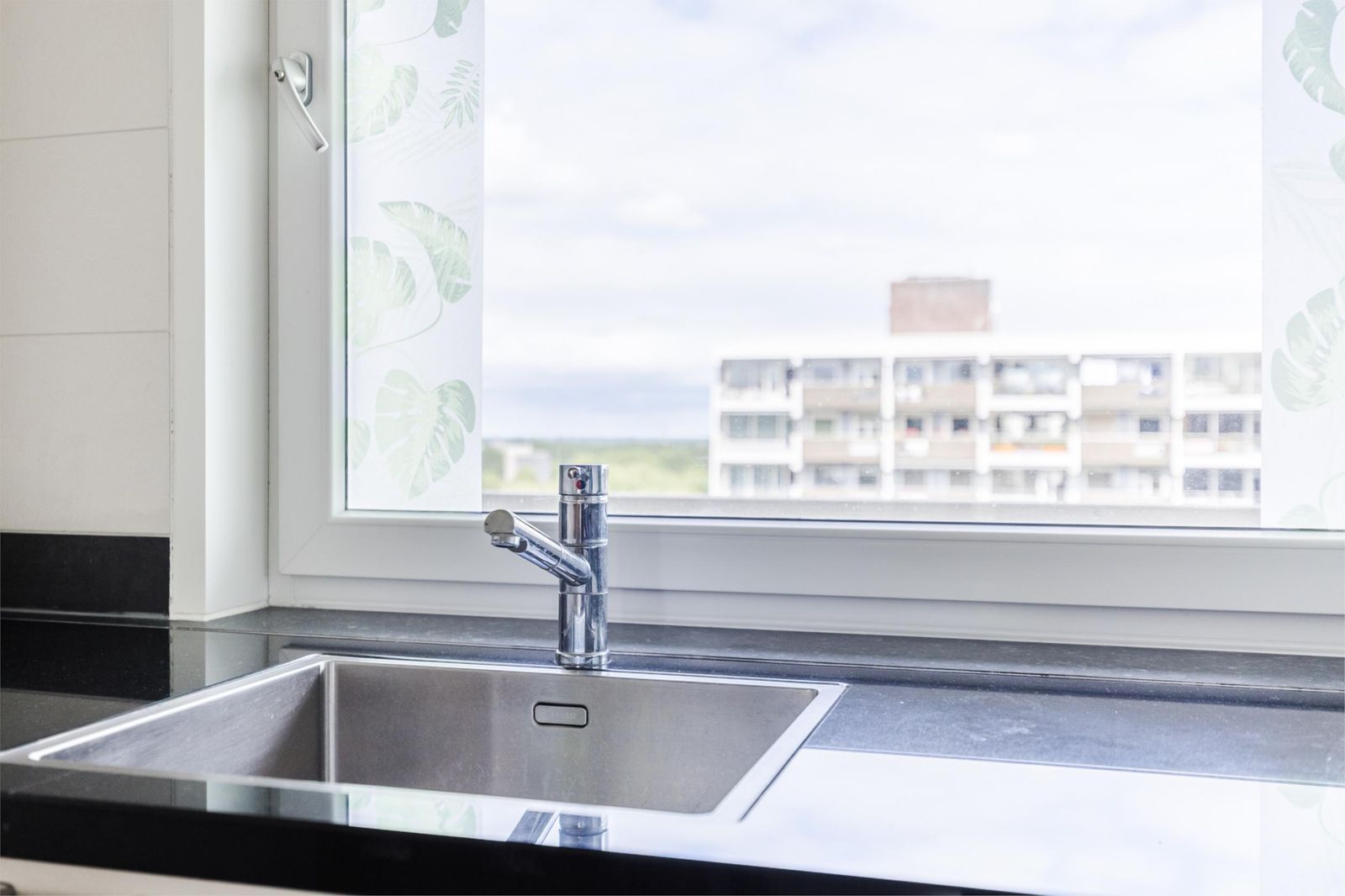 Het appartement ligt op de 10e verdieping van de 11 etage, en kijkt vrij uit over Amsterdam van de Zuid as tot het westelijke havengebied.
