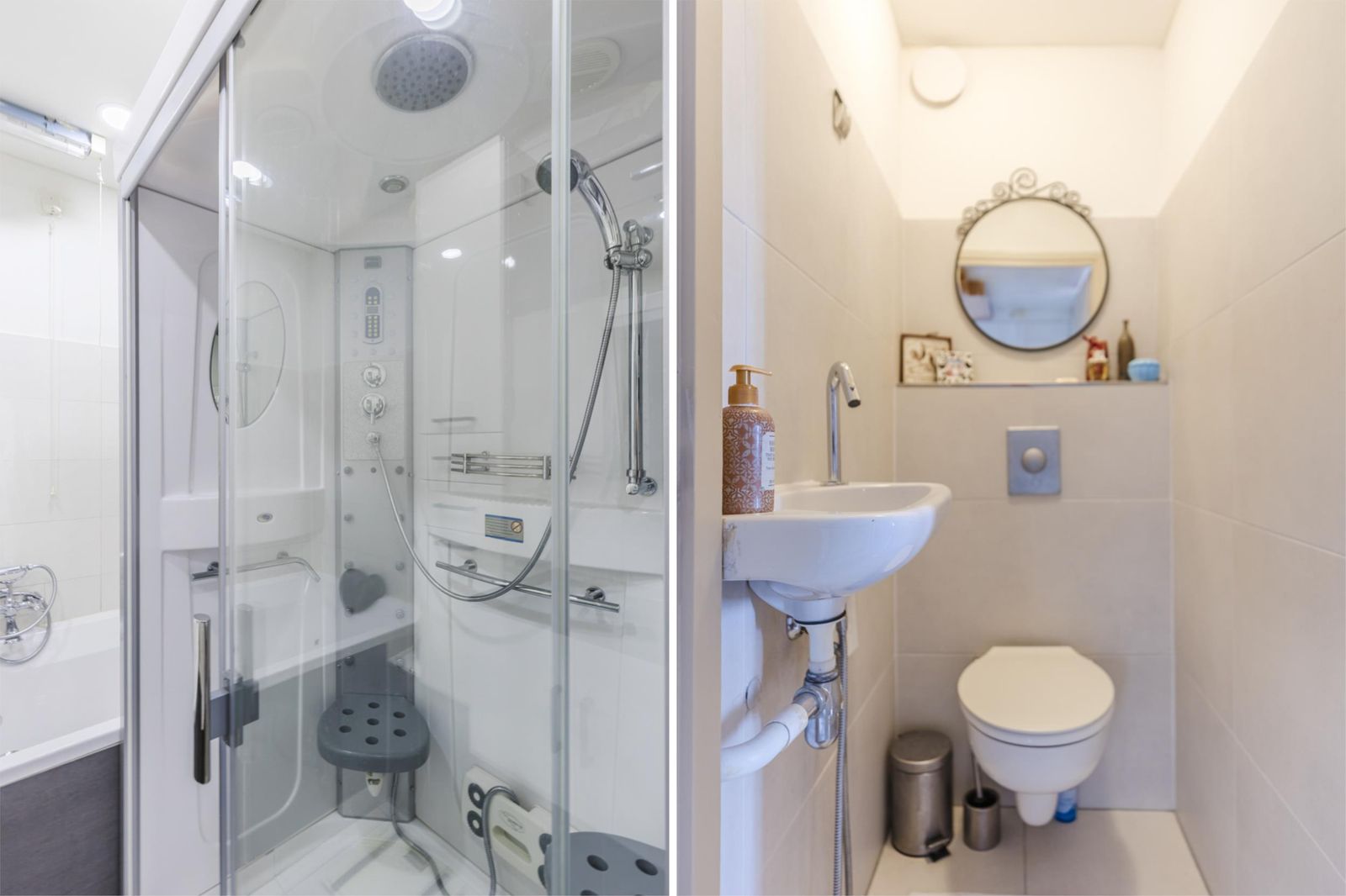 De badkamer is volledig betegeld met dubbele automatische afzuiging en wasmachine.