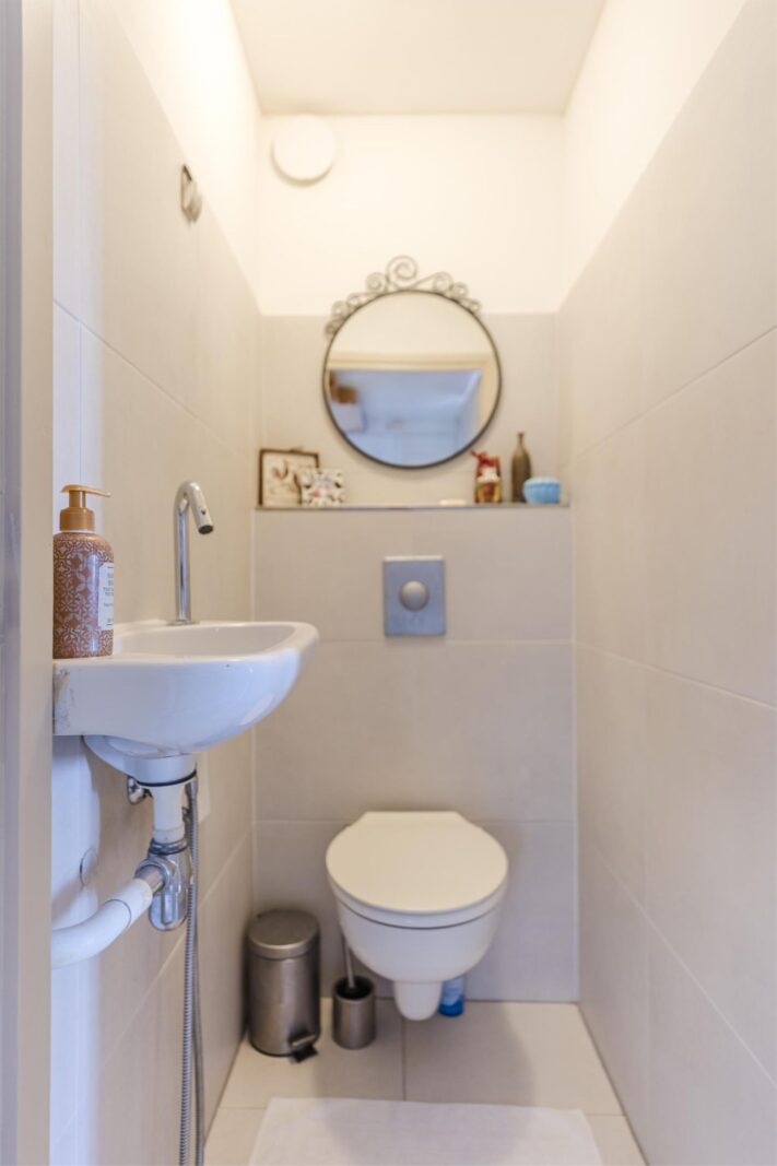 De toilet ruimte heeft een ingebouwde toilet en een fontein en is volledig betegeld .