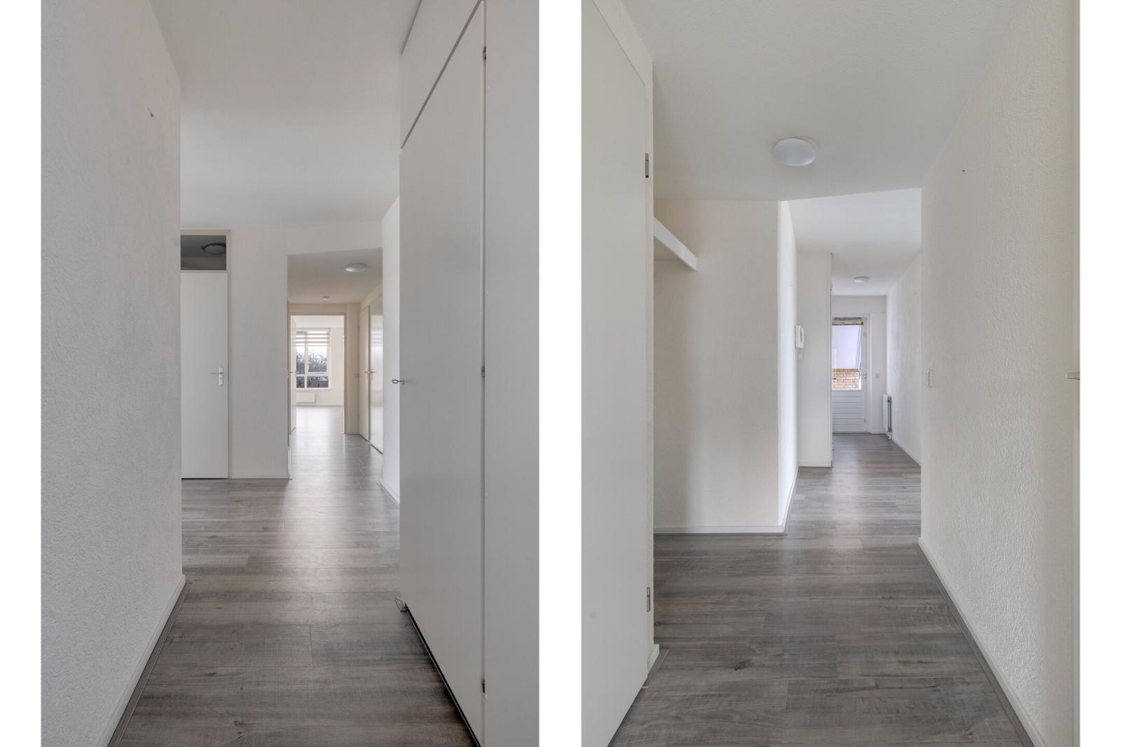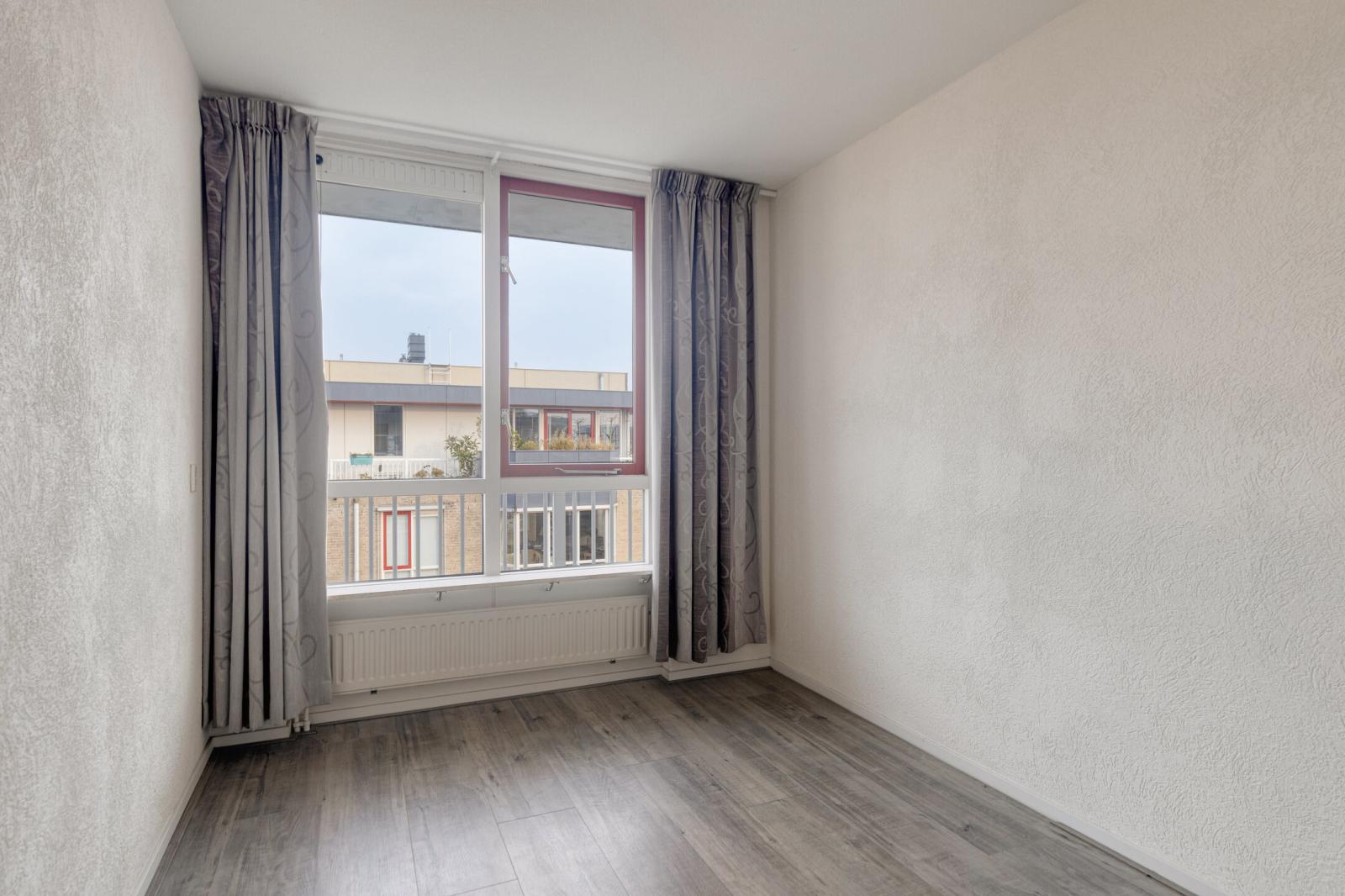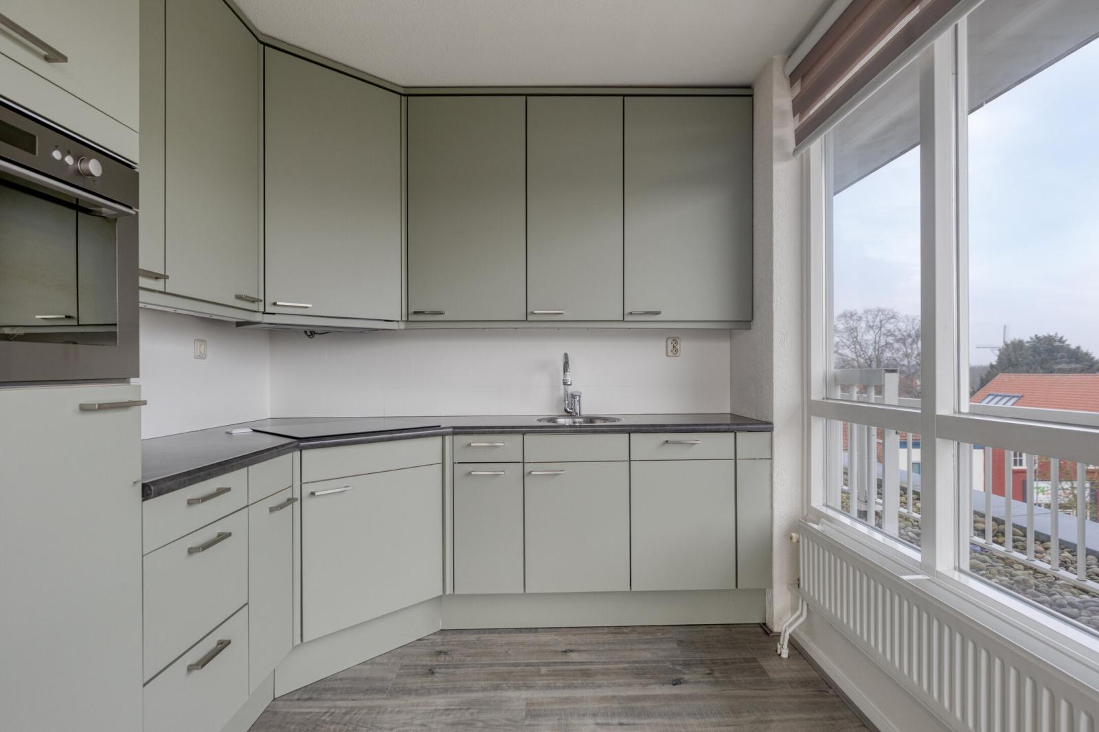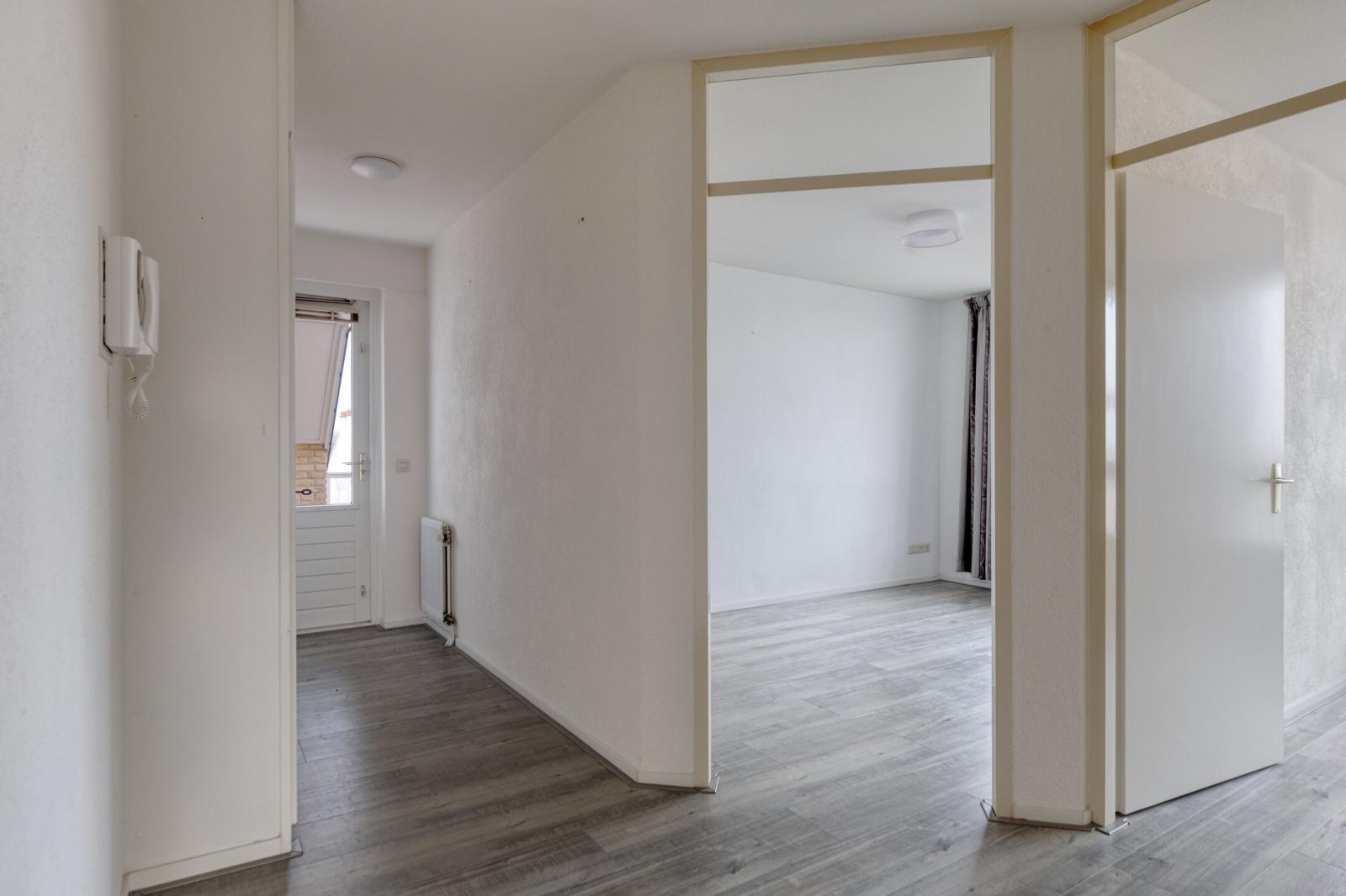 Achter de eigen voordeur bevindt zich de hal met meterkast en toilet. Vanuit de hal is tevens het balkon aan de voorzijde toegankelijk. De woonkamer is opvallend licht en biedt een vrij uitzicht. Via de schuifpui aan de zijkant is het tweede balkon bereikbaar, dat in directe verbinding staat met de woonkamer en de keuken. De halfopen keuken is netjes en functioneel uitgevoerd en voorzien van een hoekopstelling met inductiekookplaat, combimagnetron, recirculatie-afzuigkap en vaatwasser.