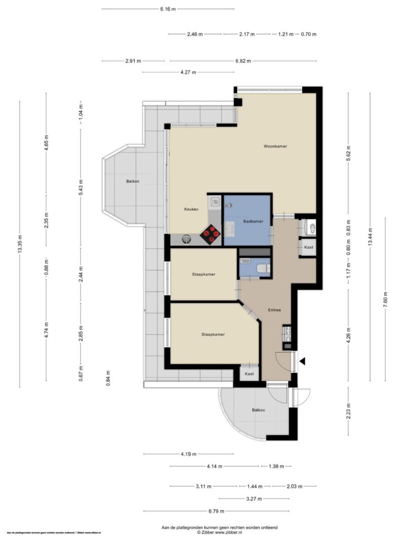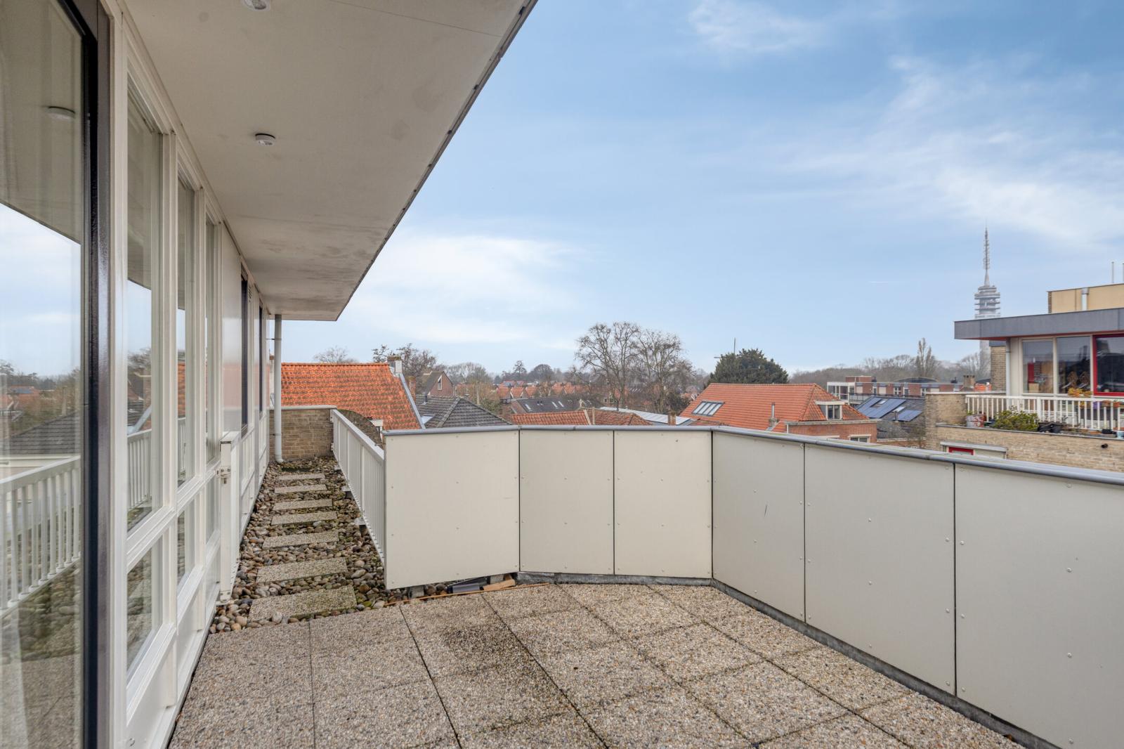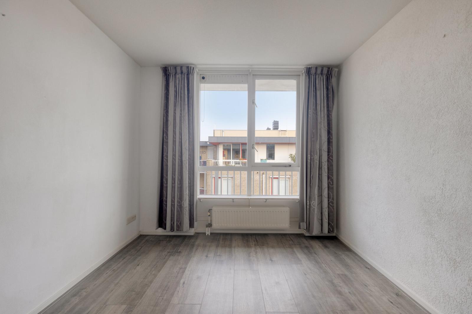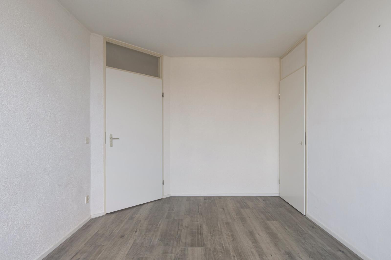 Achter de eigen voordeur bevindt zich de hal met meterkast en toilet. Vanuit de hal is tevens het balkon aan de voorzijde toegankelijk. De woonkamer is opvallend licht en biedt een vrij uitzicht. Via de schuifpui aan de zijkant is het tweede balkon bereikbaar, dat in directe verbinding staat met de woonkamer en de keuken. De halfopen keuken is netjes en functioneel uitgevoerd en voorzien van een hoekopstelling met inductiekookplaat, combimagnetron, recirculatie-afzuigkap en vaatwasser.