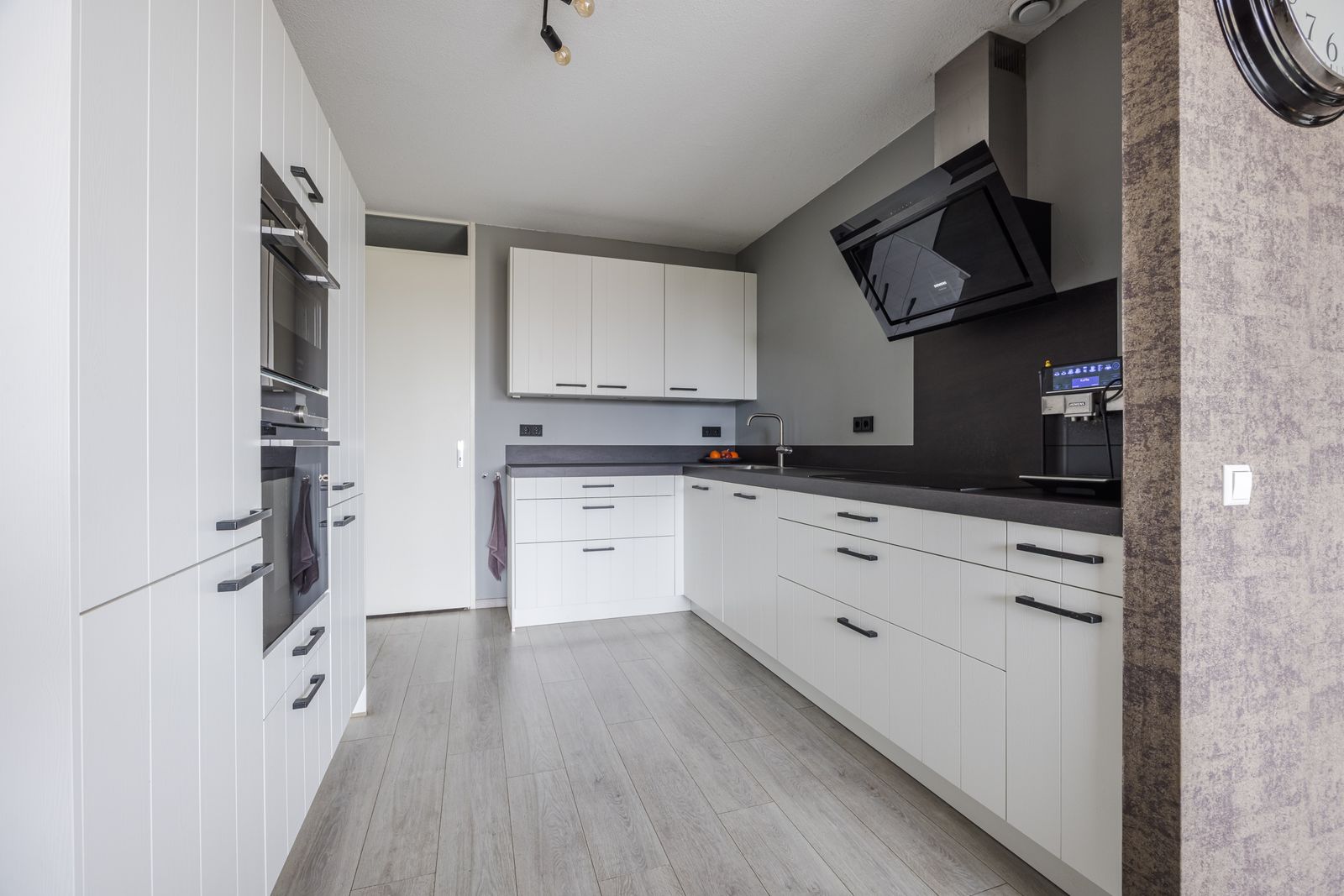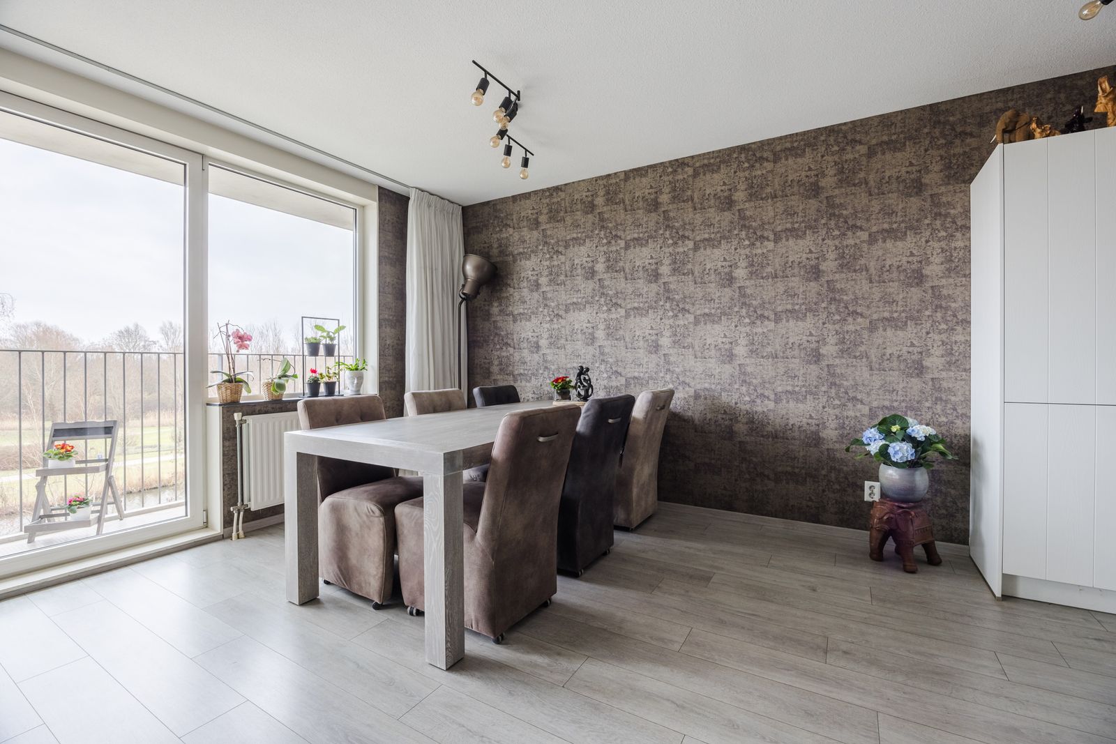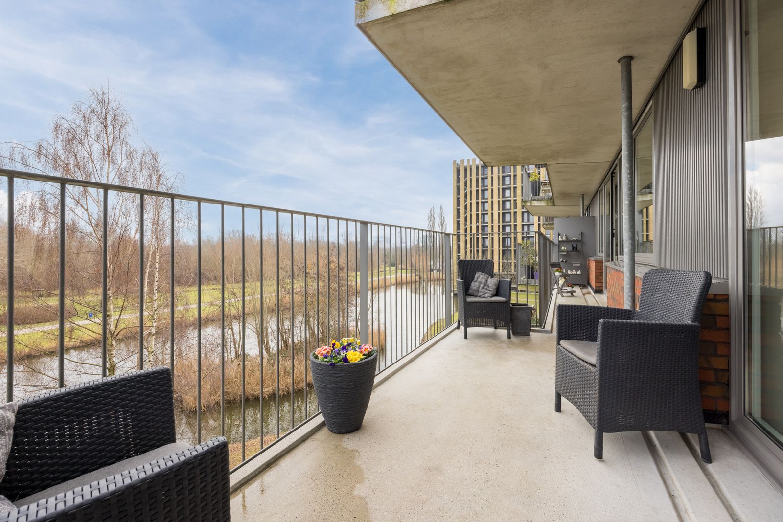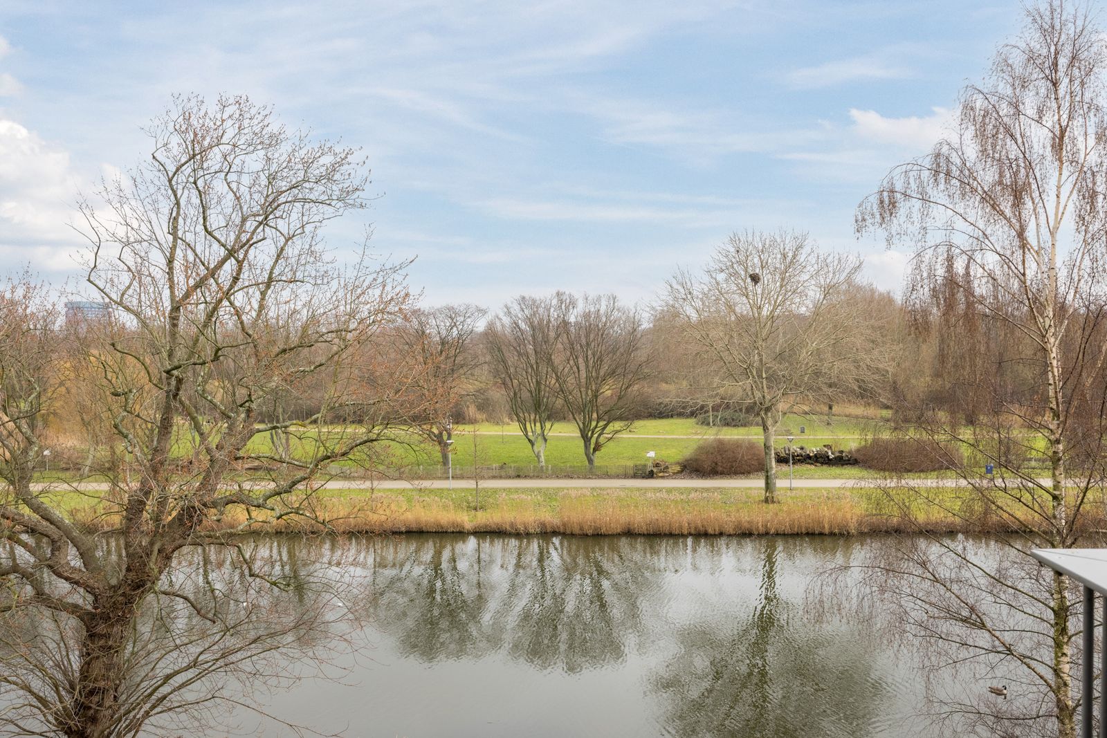De royale woonkamer met moderne open keuken heeft een totale oppervlakte van circa 48 m² en vormt het hart van de woning. Grote openslaande deuren geven toegang tot het balkon en bieden een prachtig vrij uitzicht over het stadspark en het water.