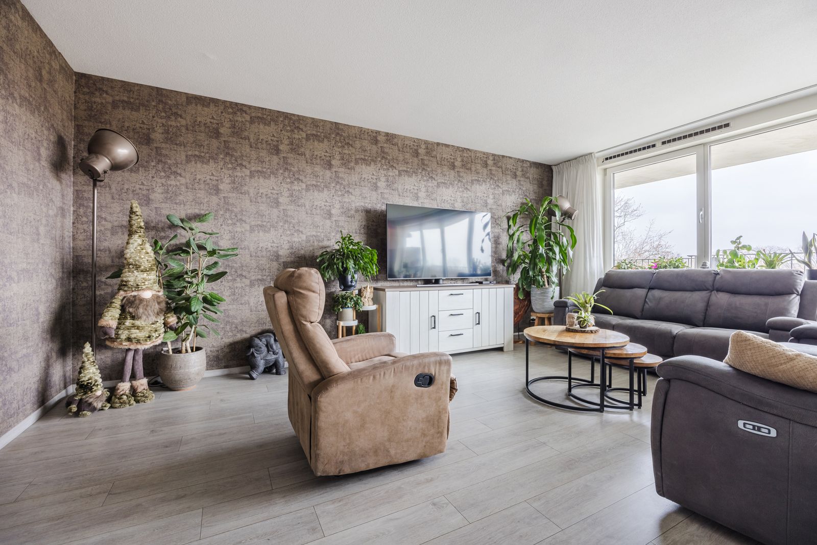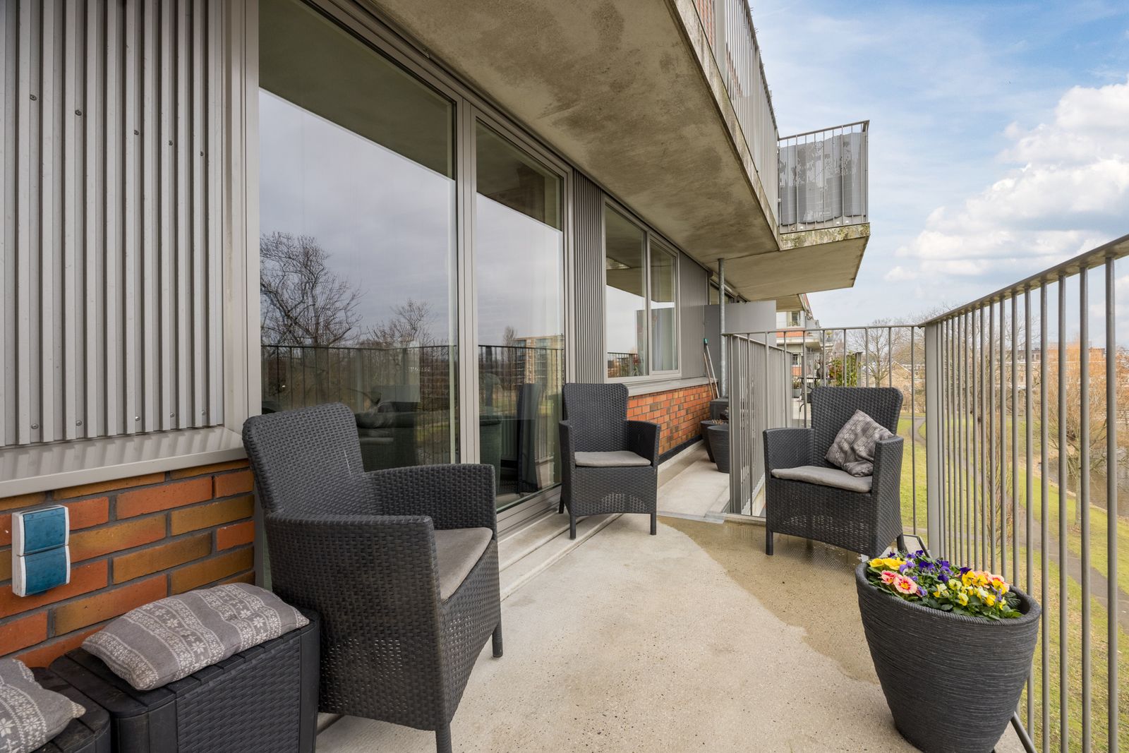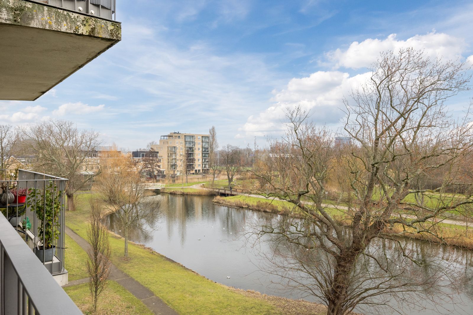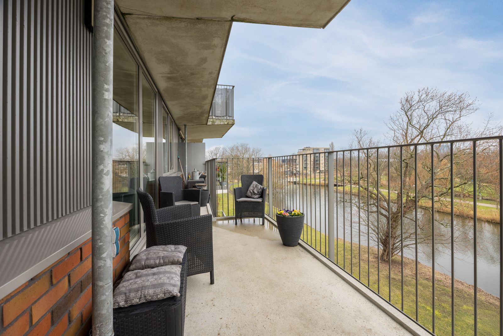 De royale woonkamer met moderne open keuken heeft een totale oppervlakte van circa 48 m² en vormt het hart van de woning. Grote openslaande deuren geven toegang tot het balkon en bieden een prachtig vrij uitzicht over het stadspark en het water.