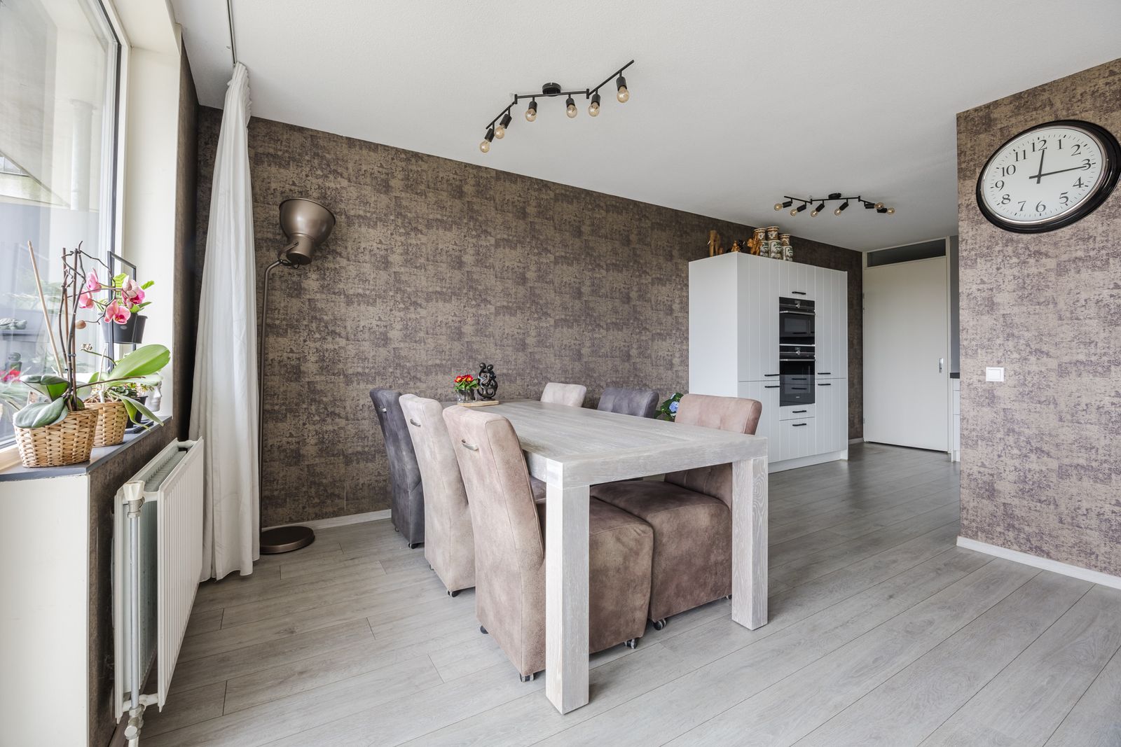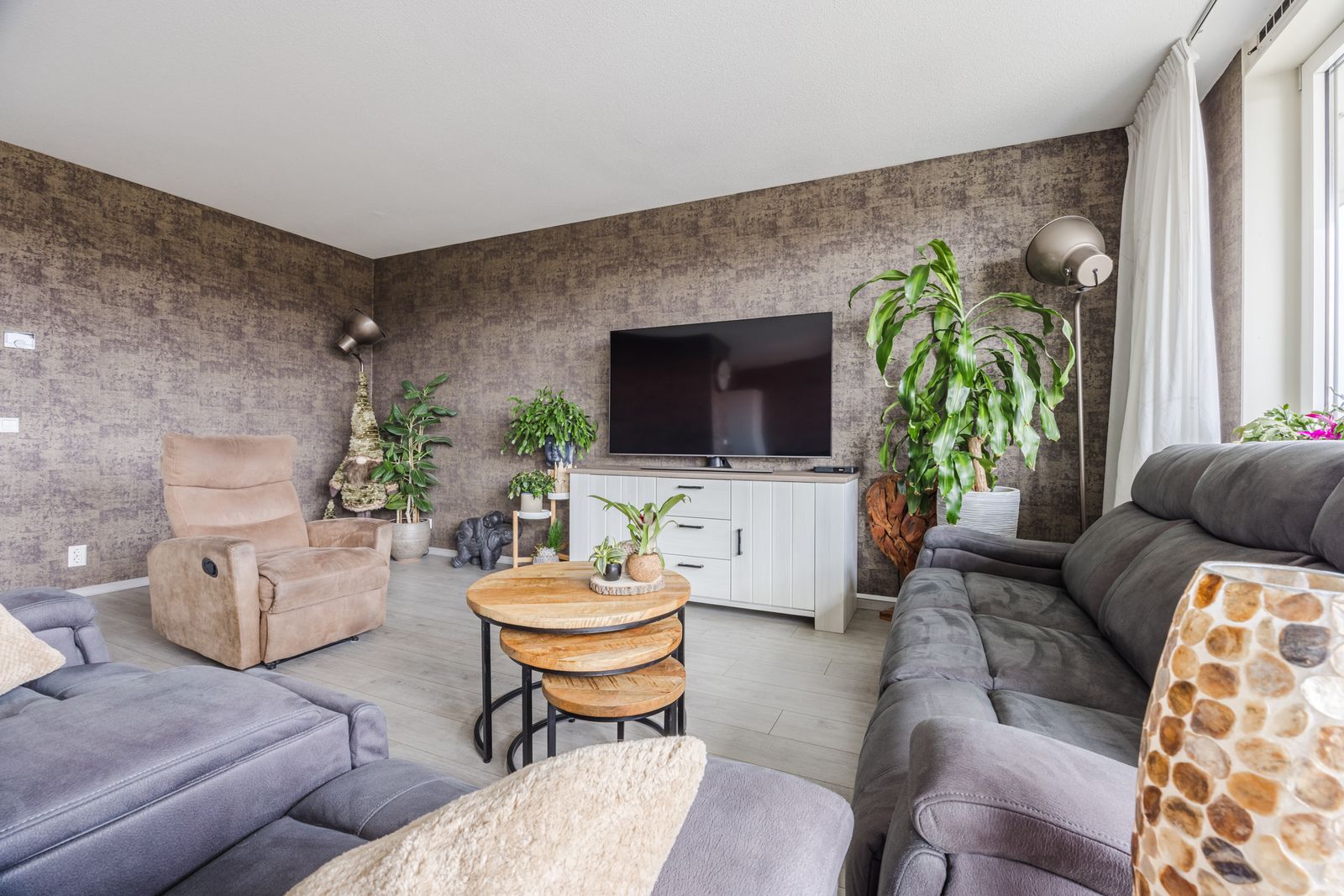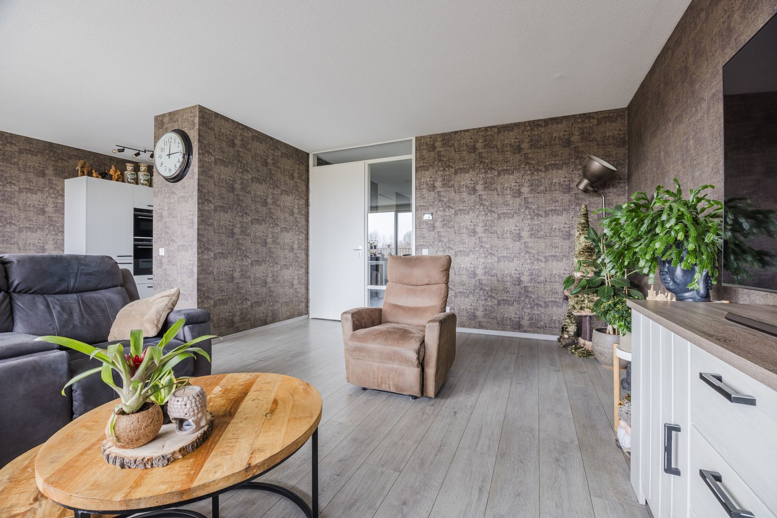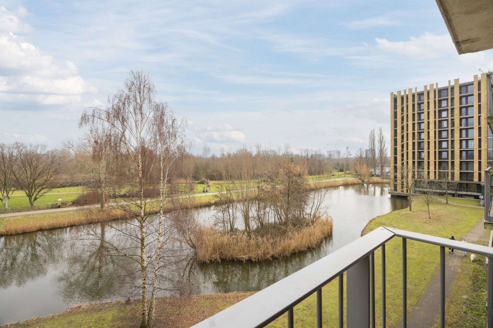 De royale woonkamer met moderne open keuken heeft een totale oppervlakte van circa 48 m² en vormt het hart van de woning. Grote openslaande deuren geven toegang tot het balkon en bieden een prachtig vrij uitzicht over het stadspark en het water.