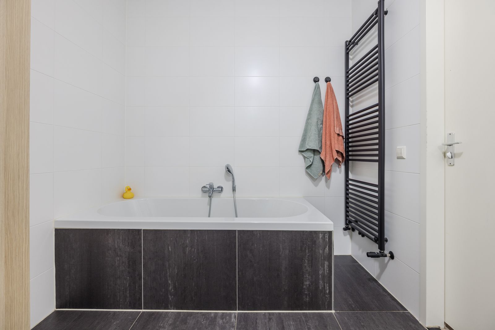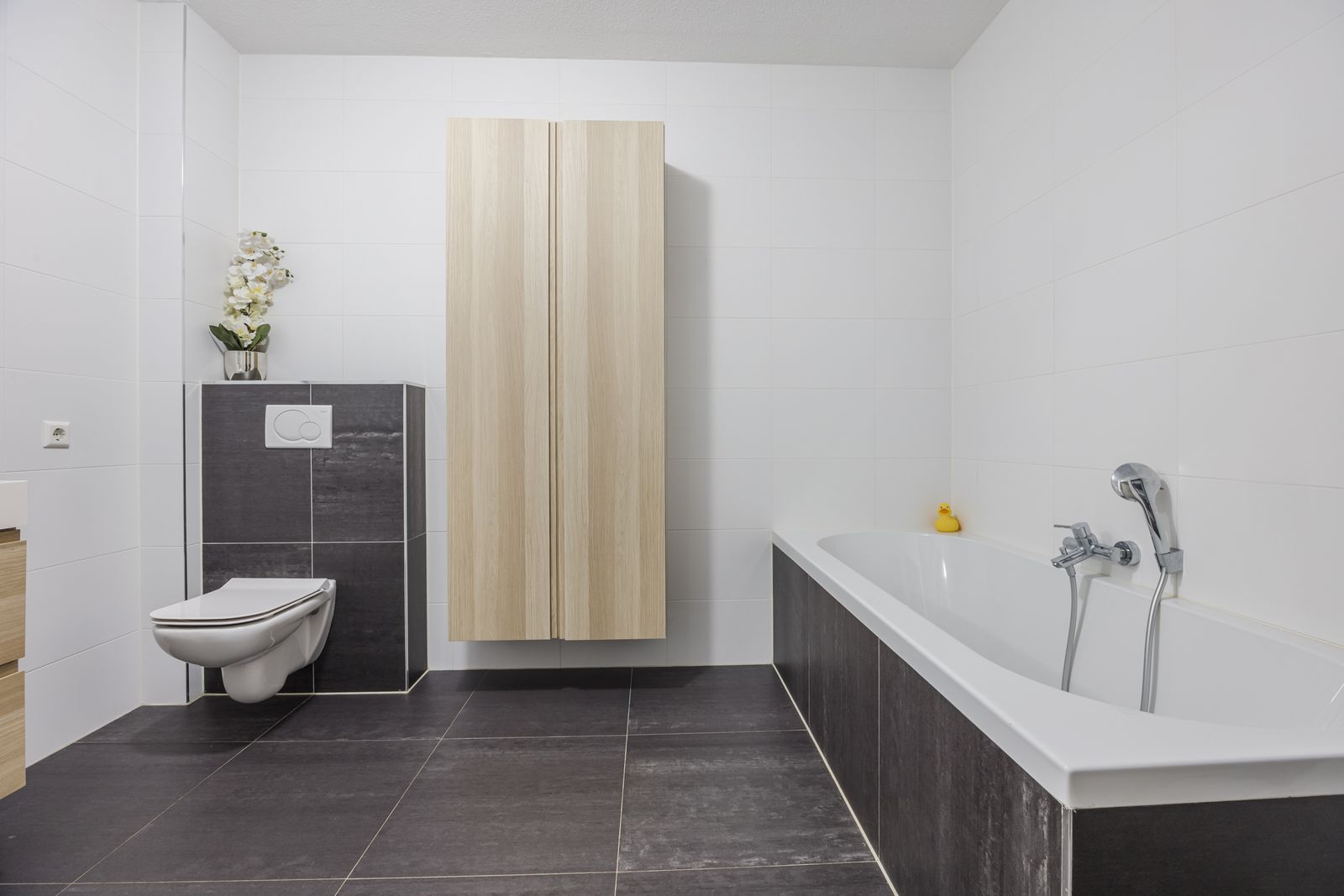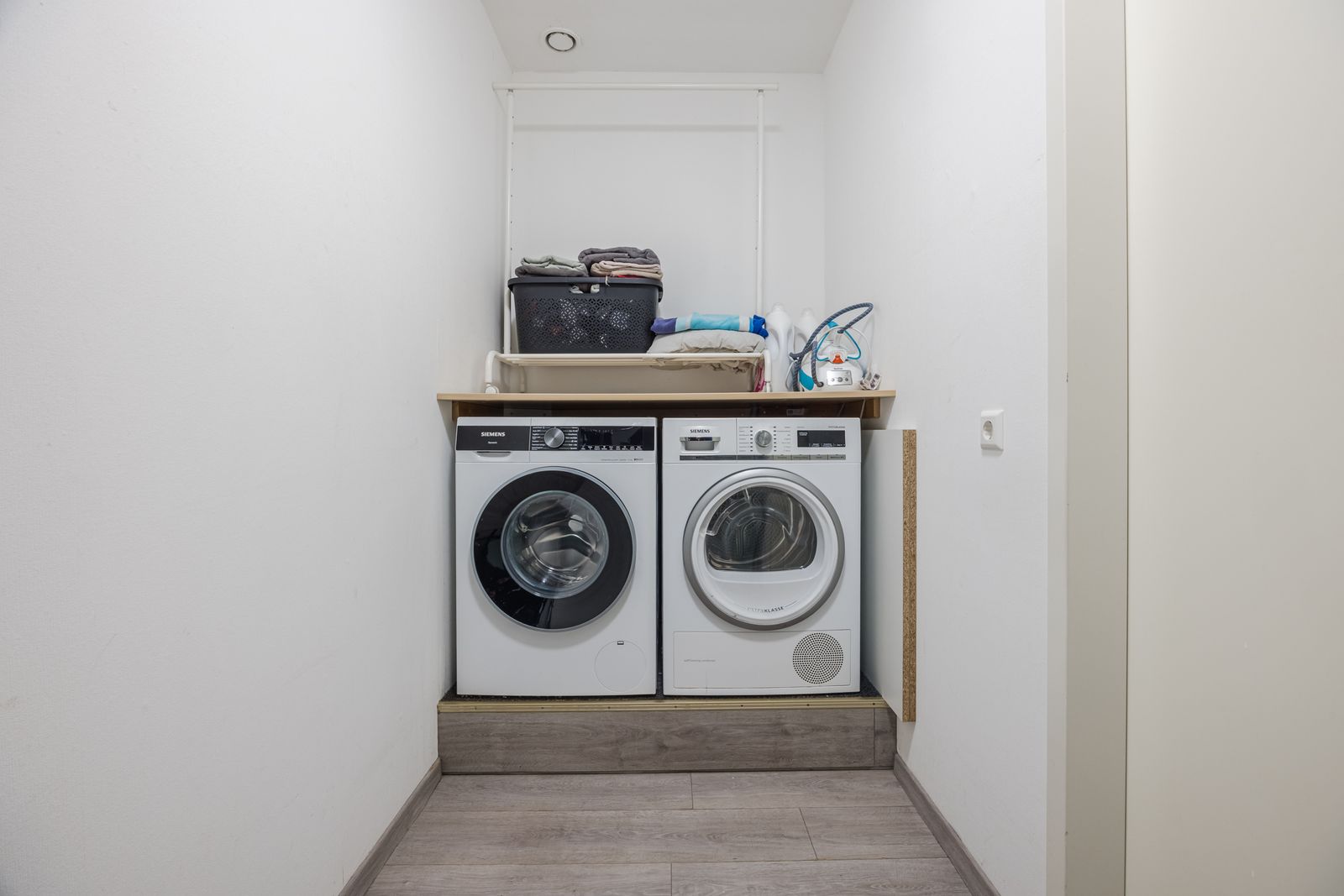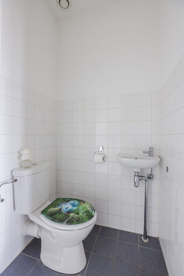 Daarnaast is er een aparte was-/opbergruimte van ca. 5 m² met aansluitingen voor wasmachine en droger. Het separate toilet in de hal is gedeeltelijk betegeld en voorzien van een fonteintje.