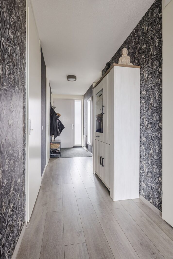 De woning wordt betreden via een ruime hal met videofoon, meterkast en een opbergkast met de CV-combiketel en unit voor mechanische ventilatie. In de hal bevindt zich tevens een diepe nis, ideaal als garderobe of extra opbergruimte.