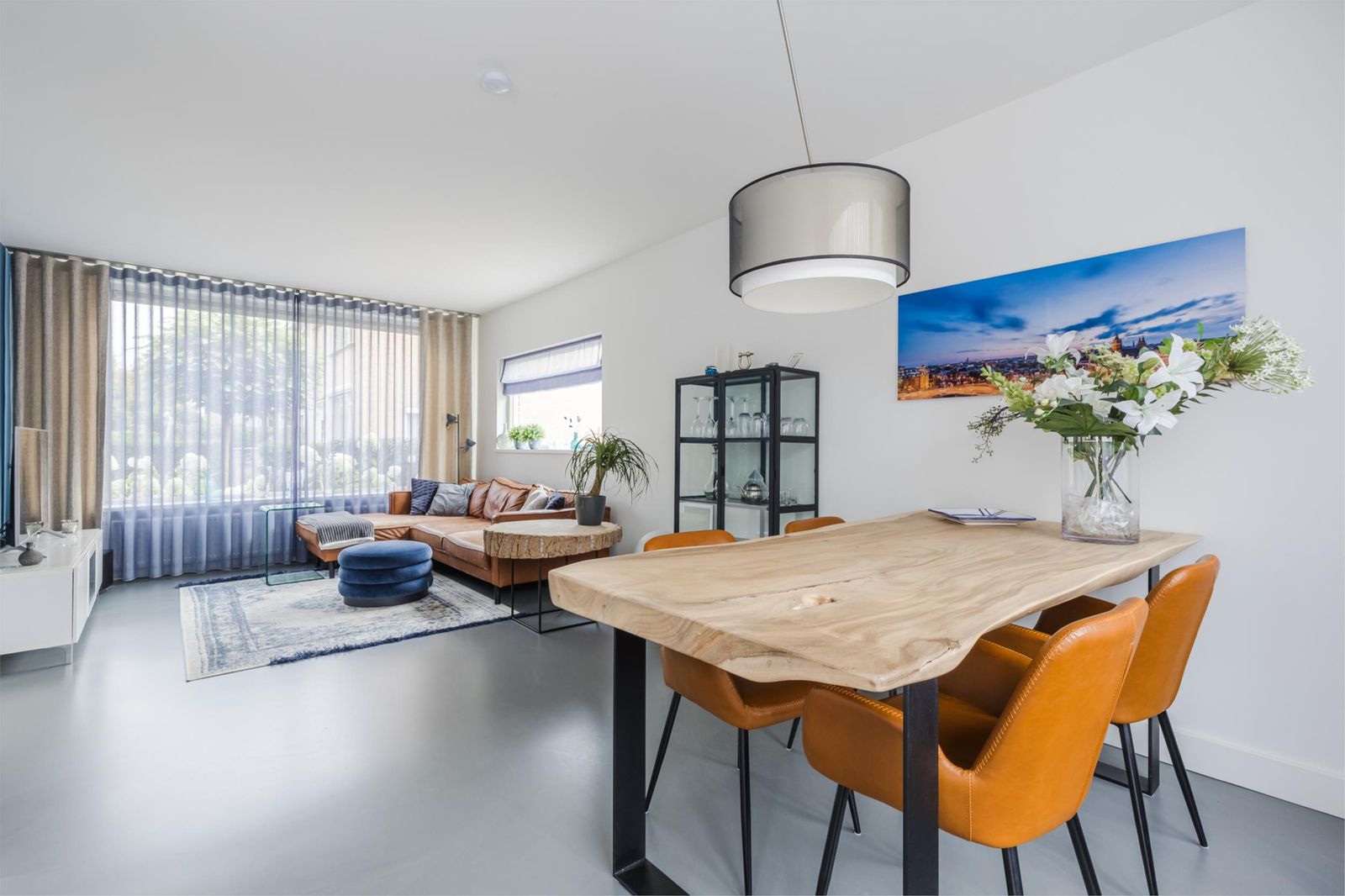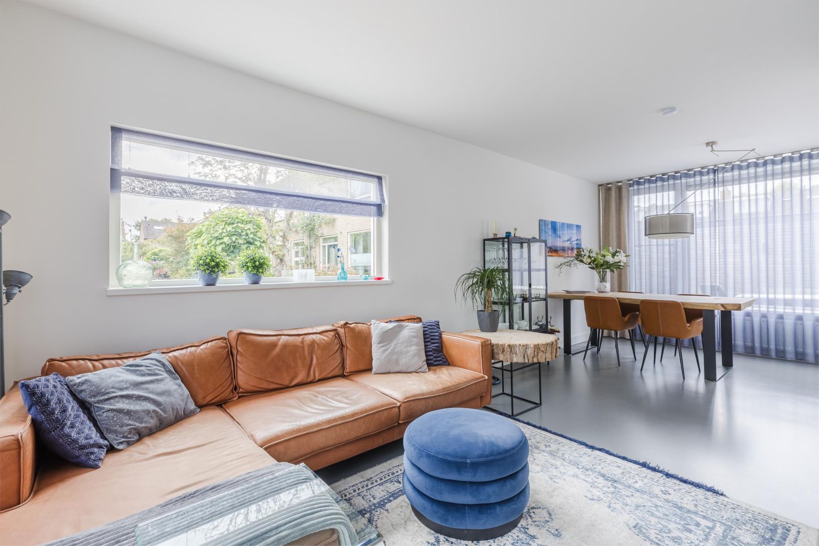 Strak afgewerkte en ruime woonkamer met een halfopen keuken.