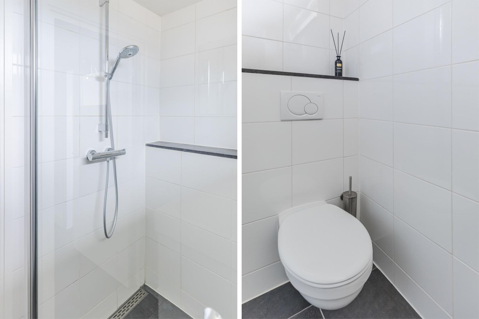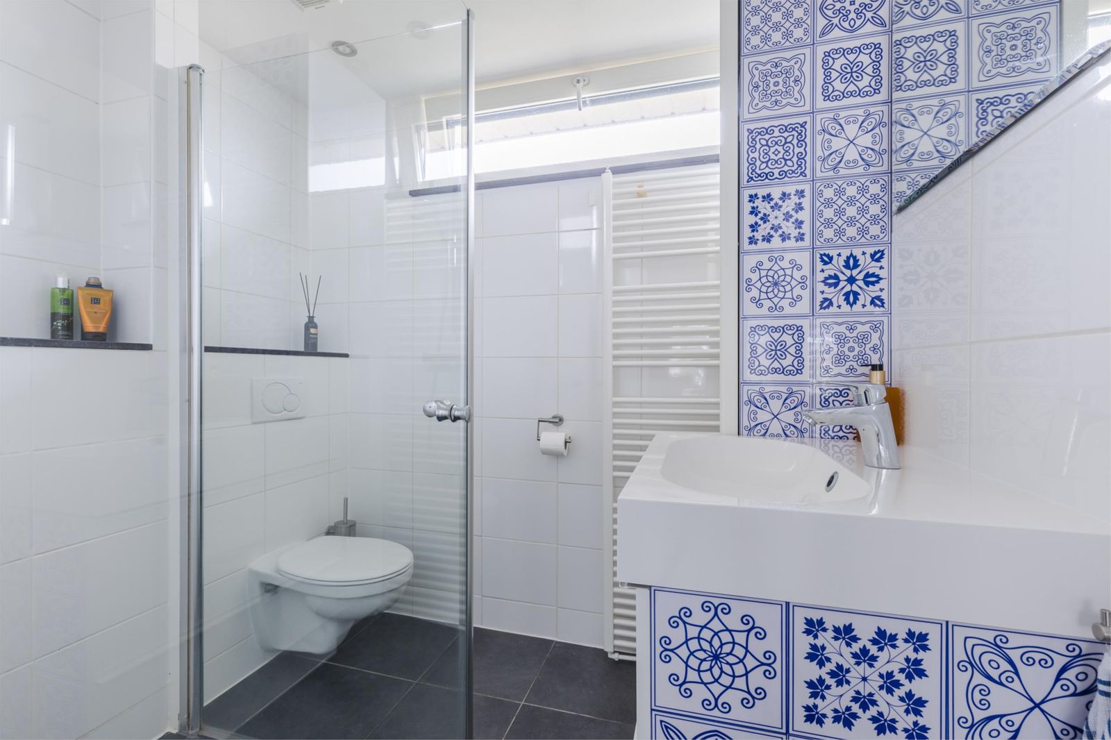 Verzorgde badkamer is voorzien van een douche, wastafel en toilet.