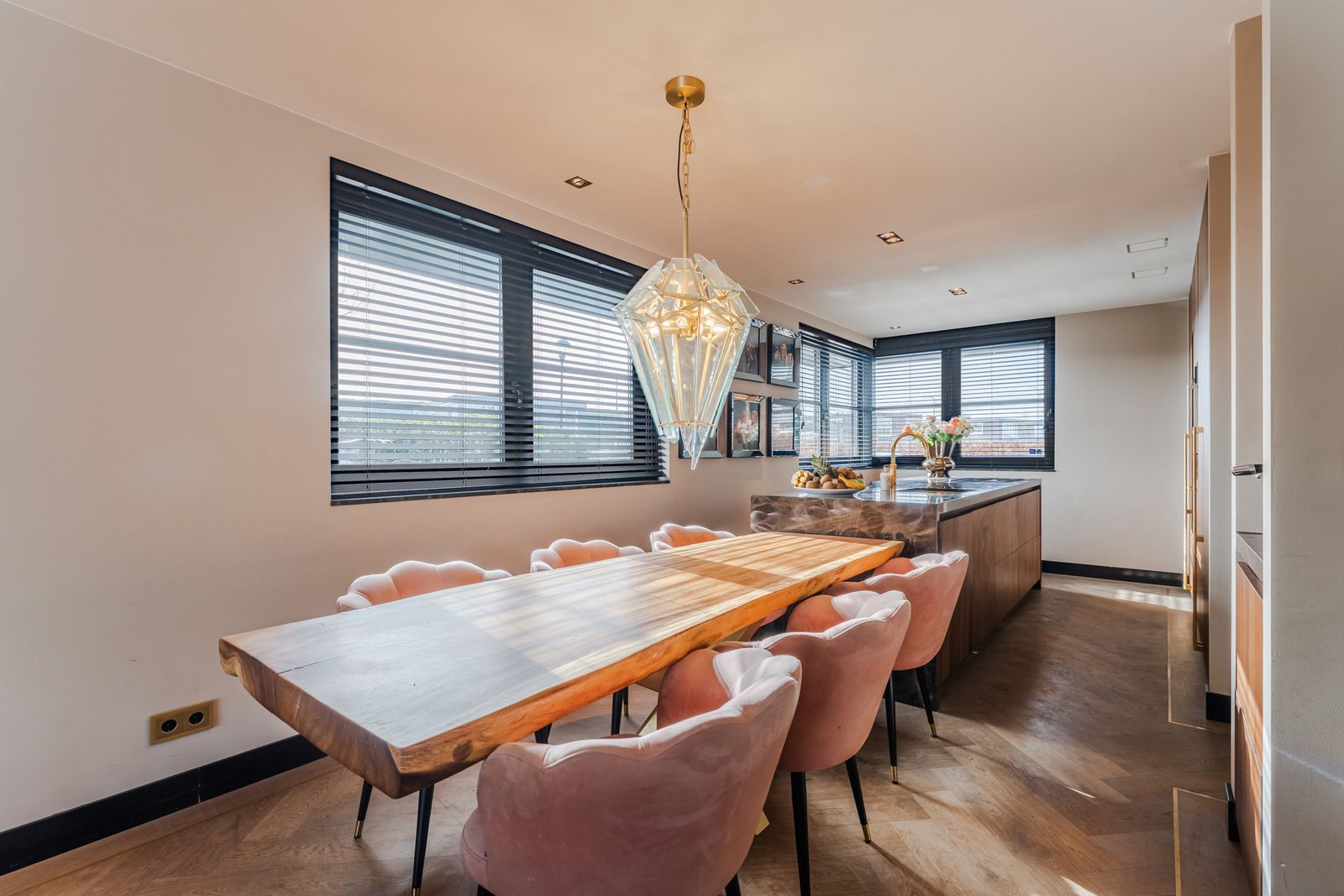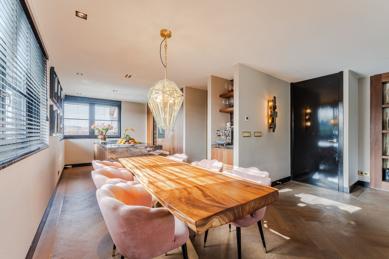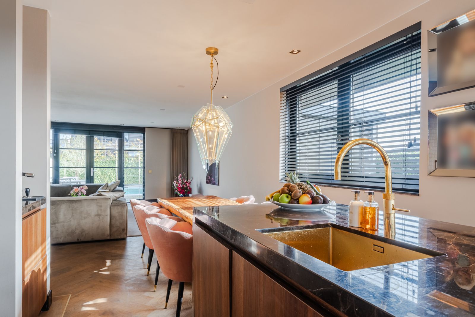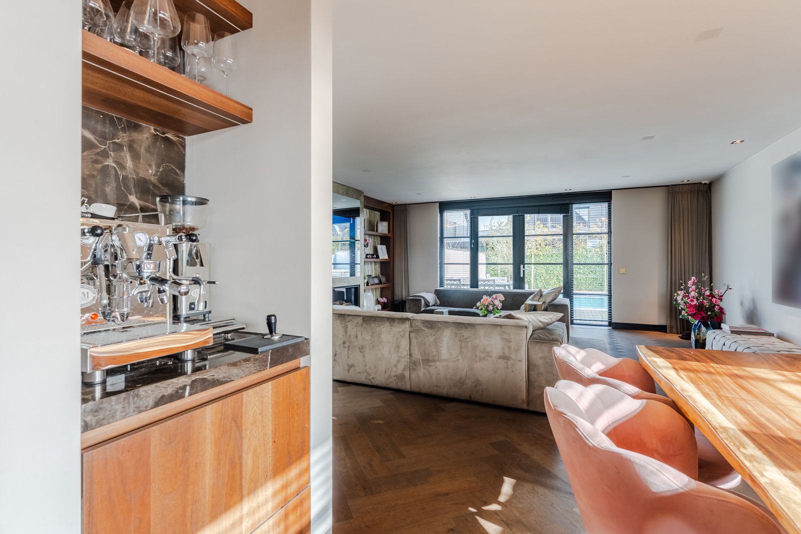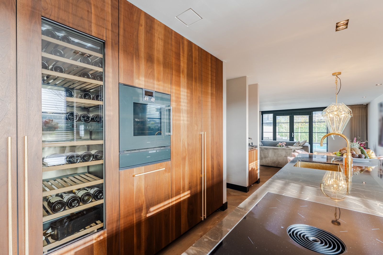De royale woonkamer is een echte eyecatcher, afgewerkt met exclusief marmer epoxy uit Iran, doorgetrokken in zowel de living als het toilet, wat zorgt voor een unieke en luxe uitstraling. De open design keuken is uitgerust met hoogwaardige Gaggenau-apparatuur en vormt het hart van de woning.