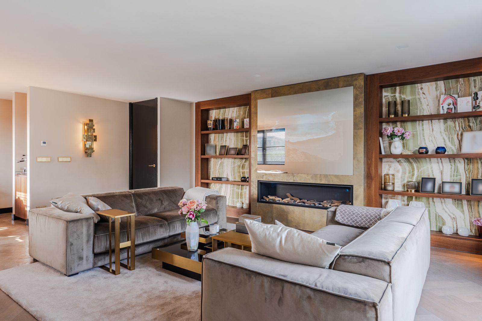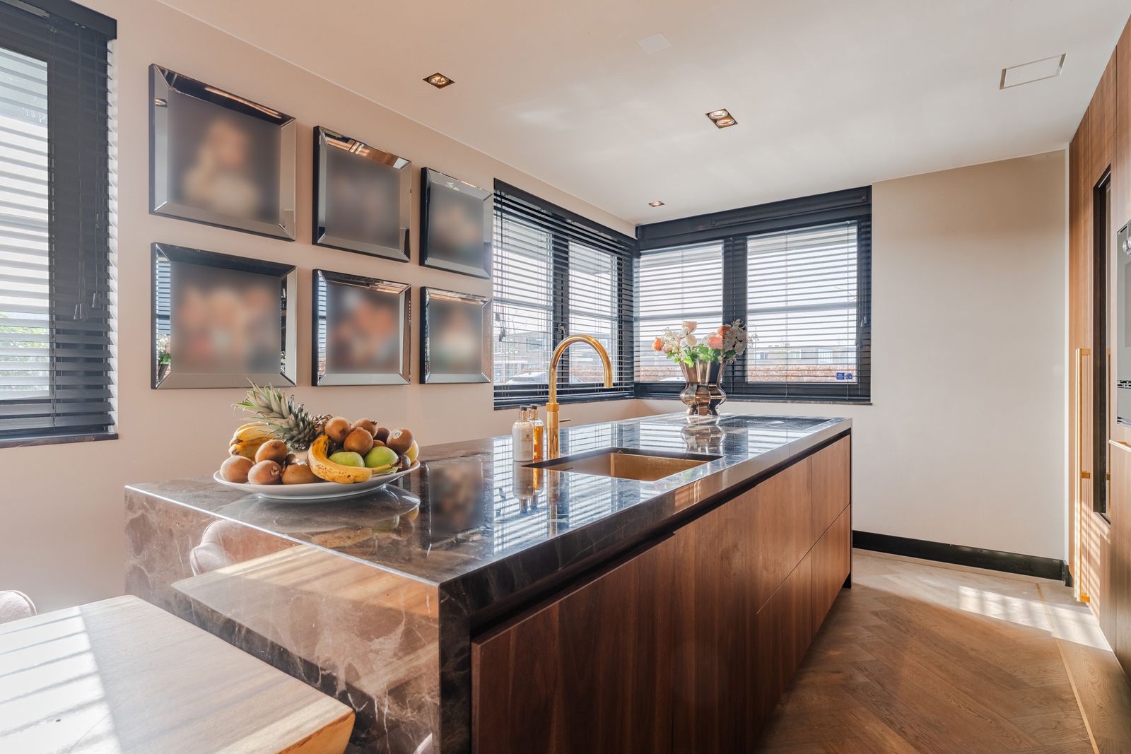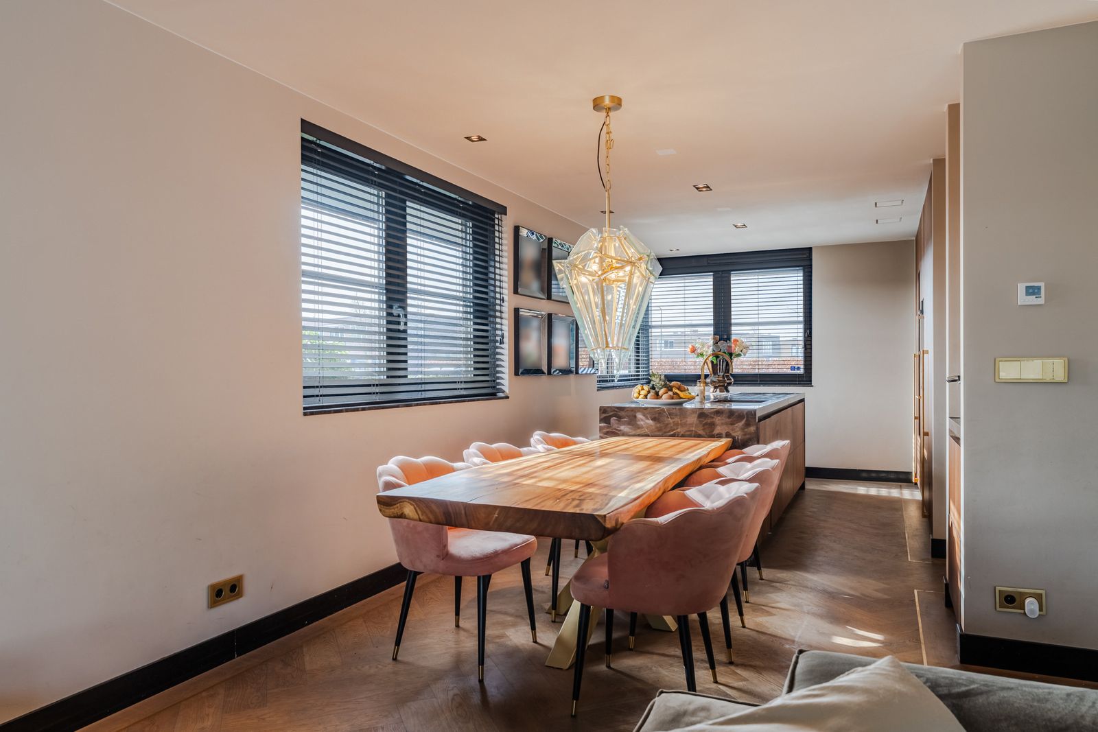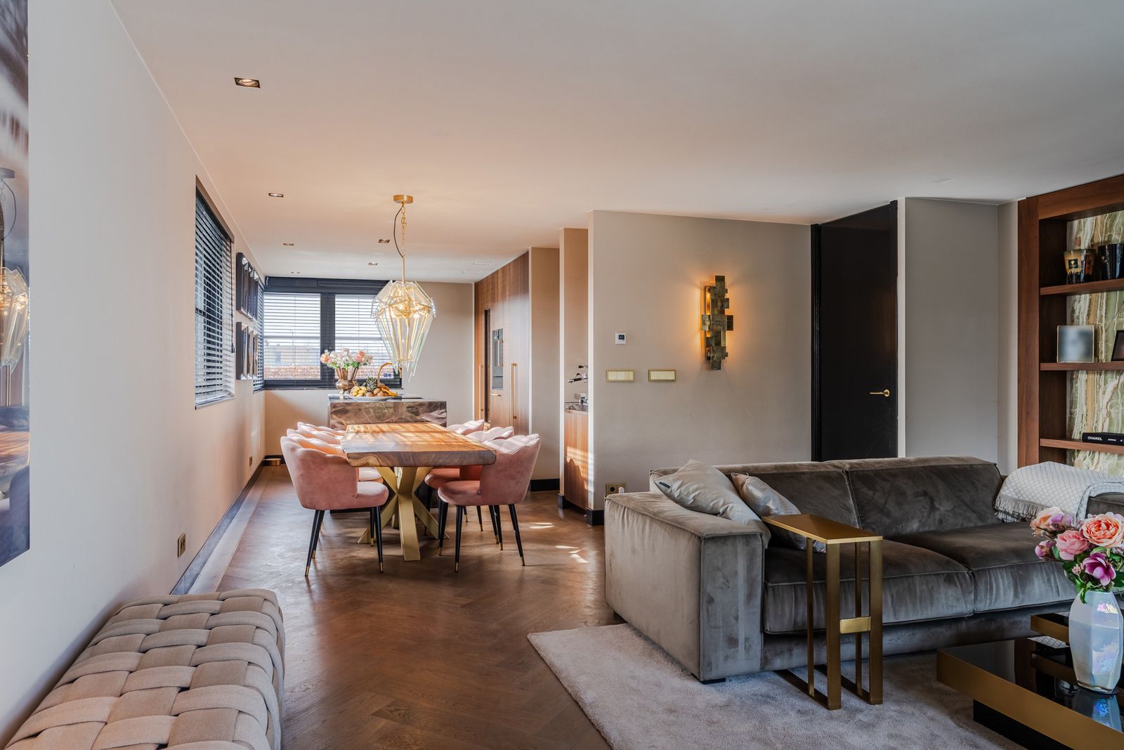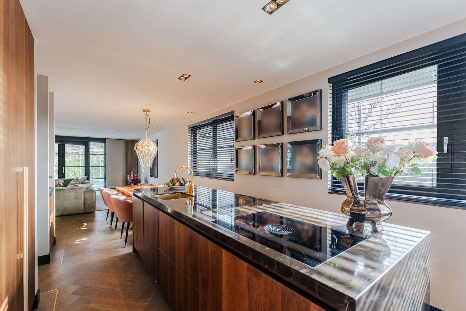 De royale woonkamer is een echte eyecatcher, afgewerkt met exclusief marmer epoxy uit Iran, doorgetrokken in zowel de living als het toilet, wat zorgt voor een unieke en luxe uitstraling. De open design keuken is uitgerust met hoogwaardige Gaggenau-apparatuur en vormt het hart van de woning.