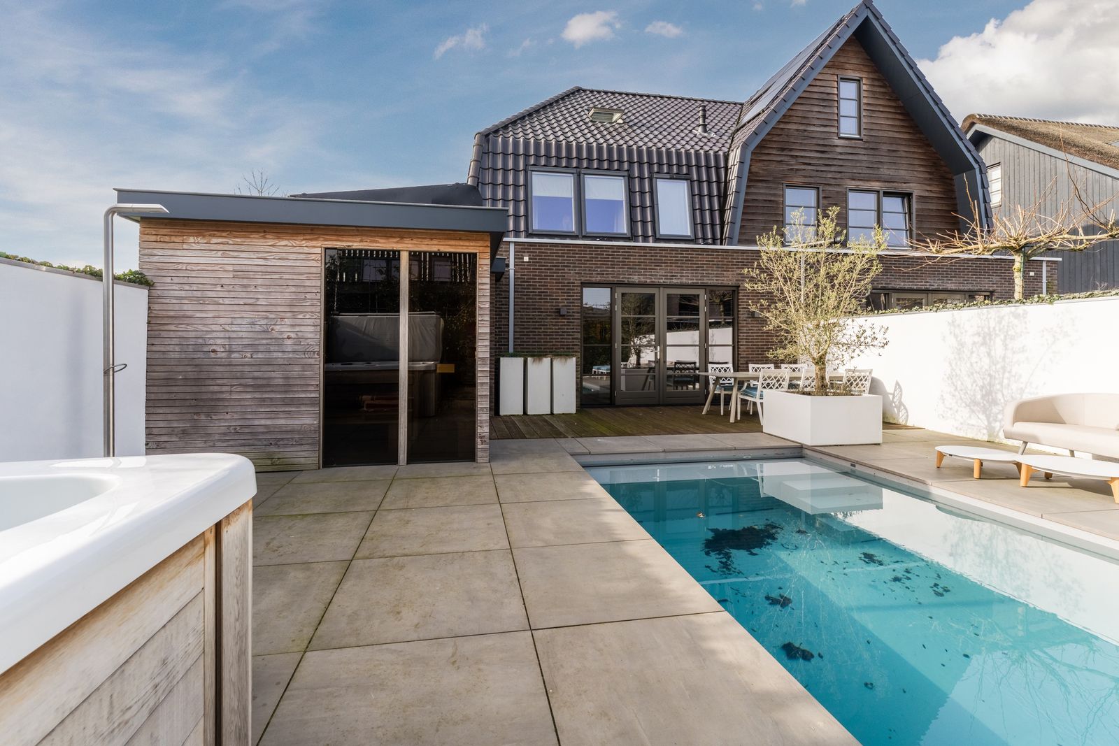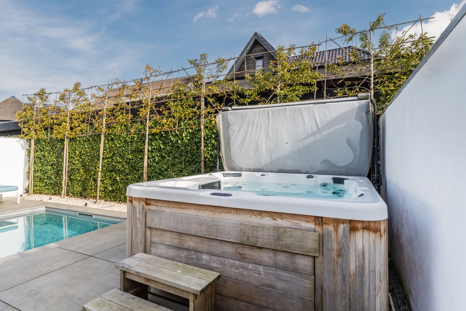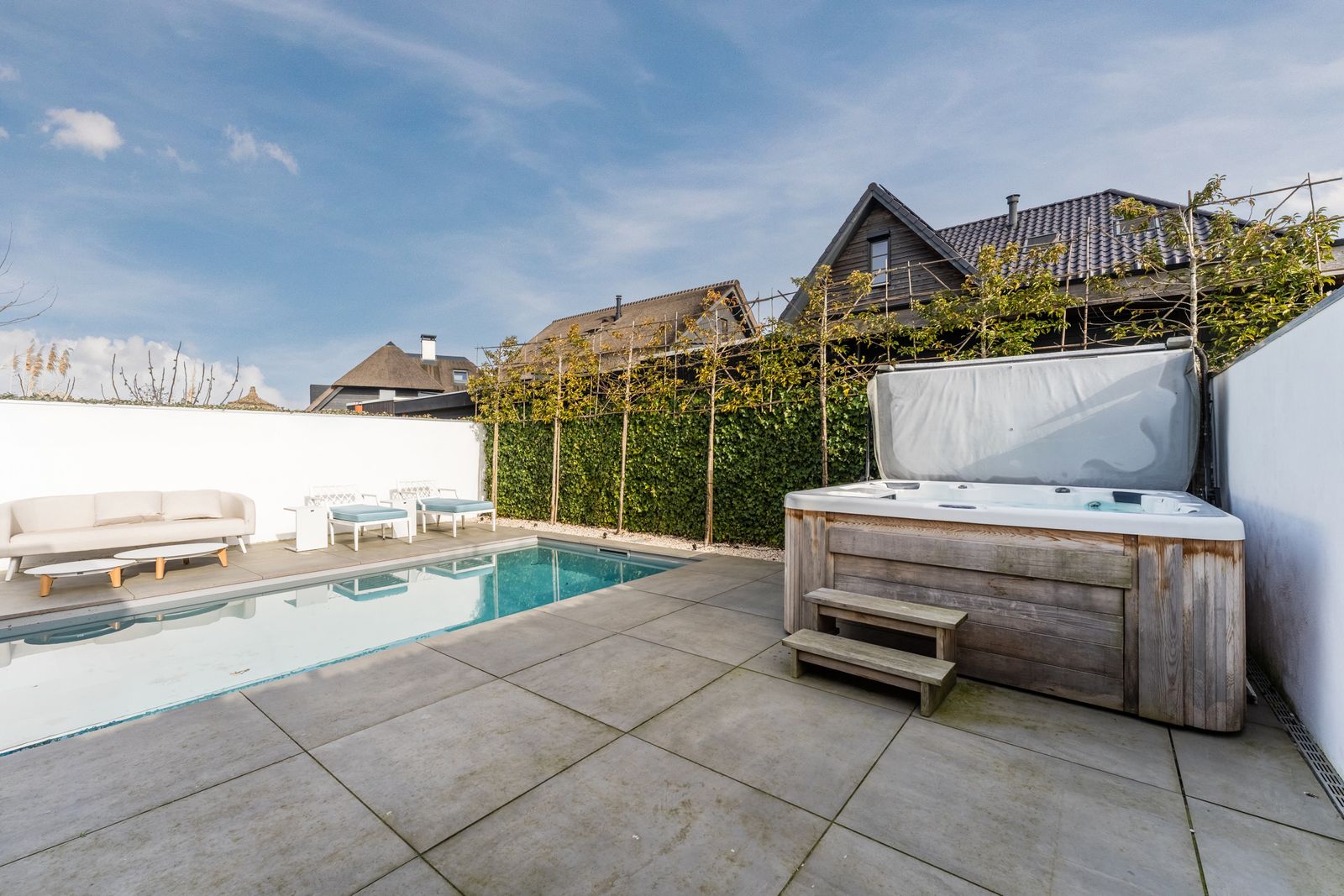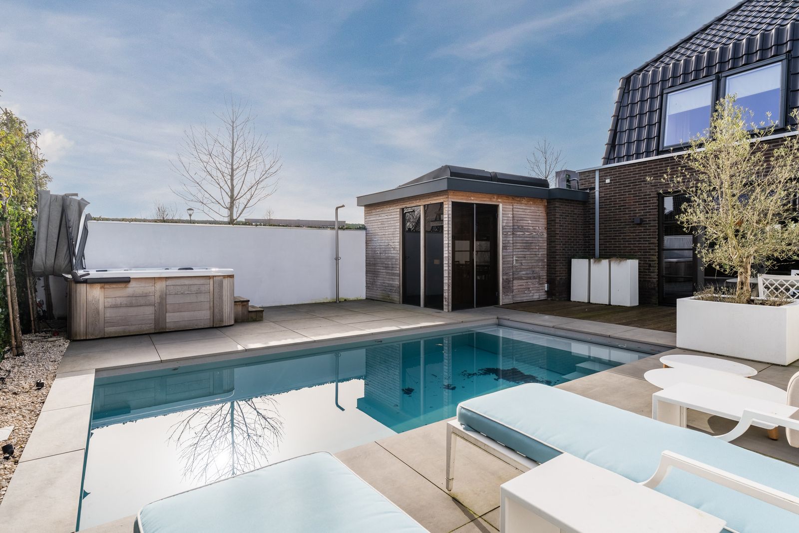 Via de openslaande deuren loopt u zo de fraai aangelegde tuin in, waar ontspanning en comfort centraal staan. Hier vindt u een zwembad dat veilig is voor kleine kinderen die nog niet kunnen zwemmen, evenals een jacuzzi en sauna. Een perfecte setting om in alle rust te ontspannen of juist te genieten met familie en vrienden.