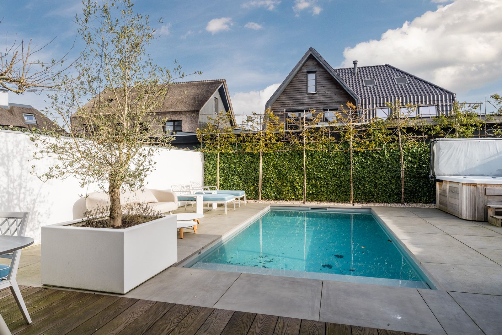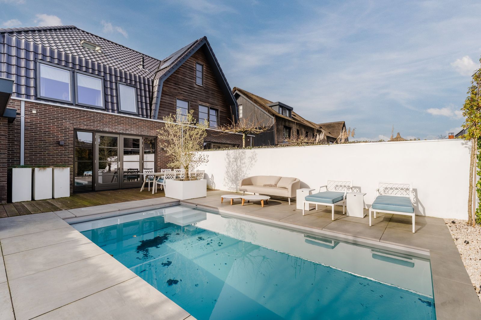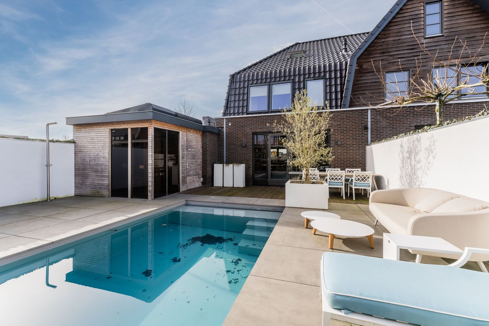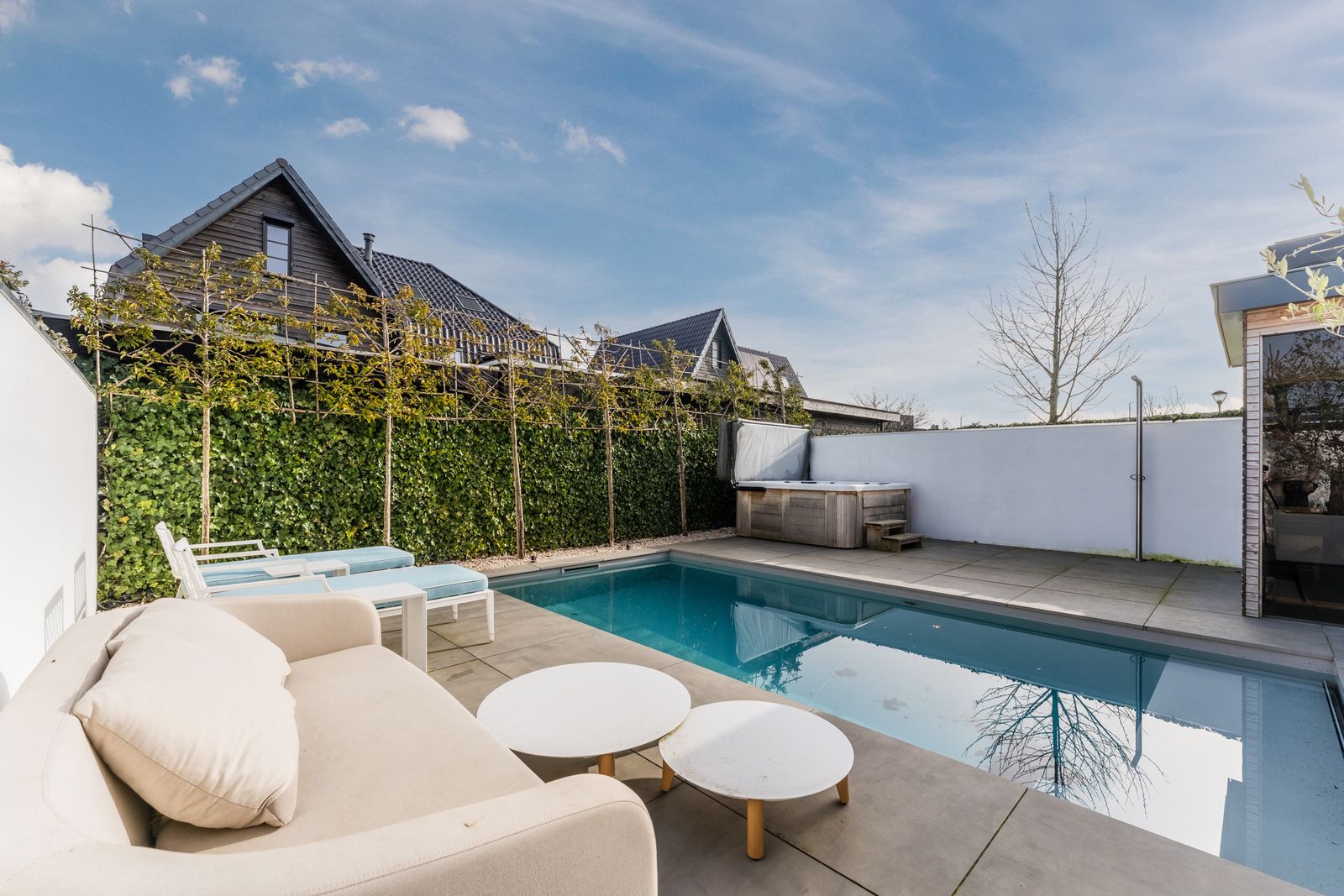 Via de openslaande deuren loopt u zo de fraai aangelegde tuin in, waar ontspanning en comfort centraal staan. Hier vindt u een zwembad dat veilig is voor kleine kinderen die nog niet kunnen zwemmen, evenals een jacuzzi en sauna. Een perfecte setting om in alle rust te ontspannen of juist te genieten met familie en vrienden.