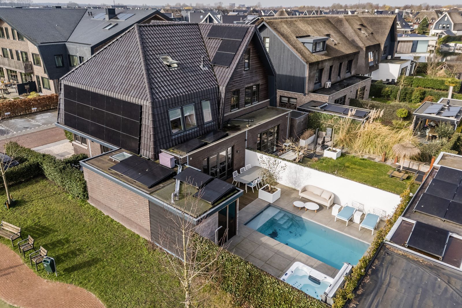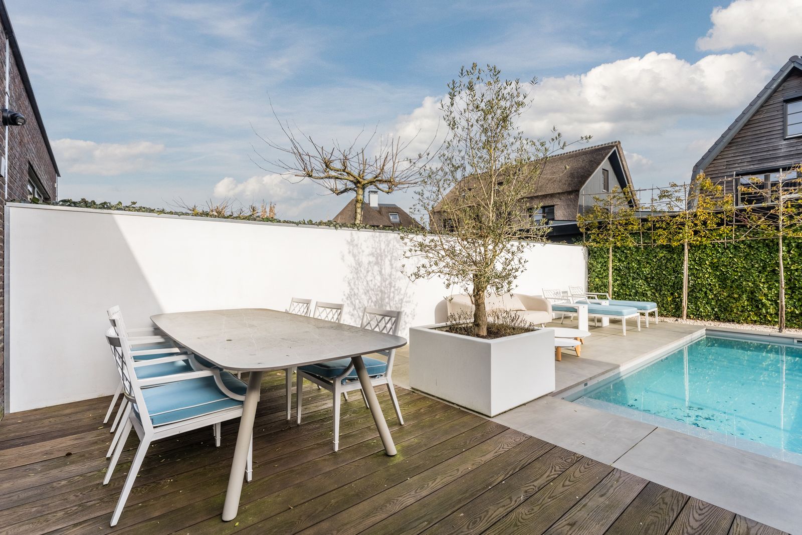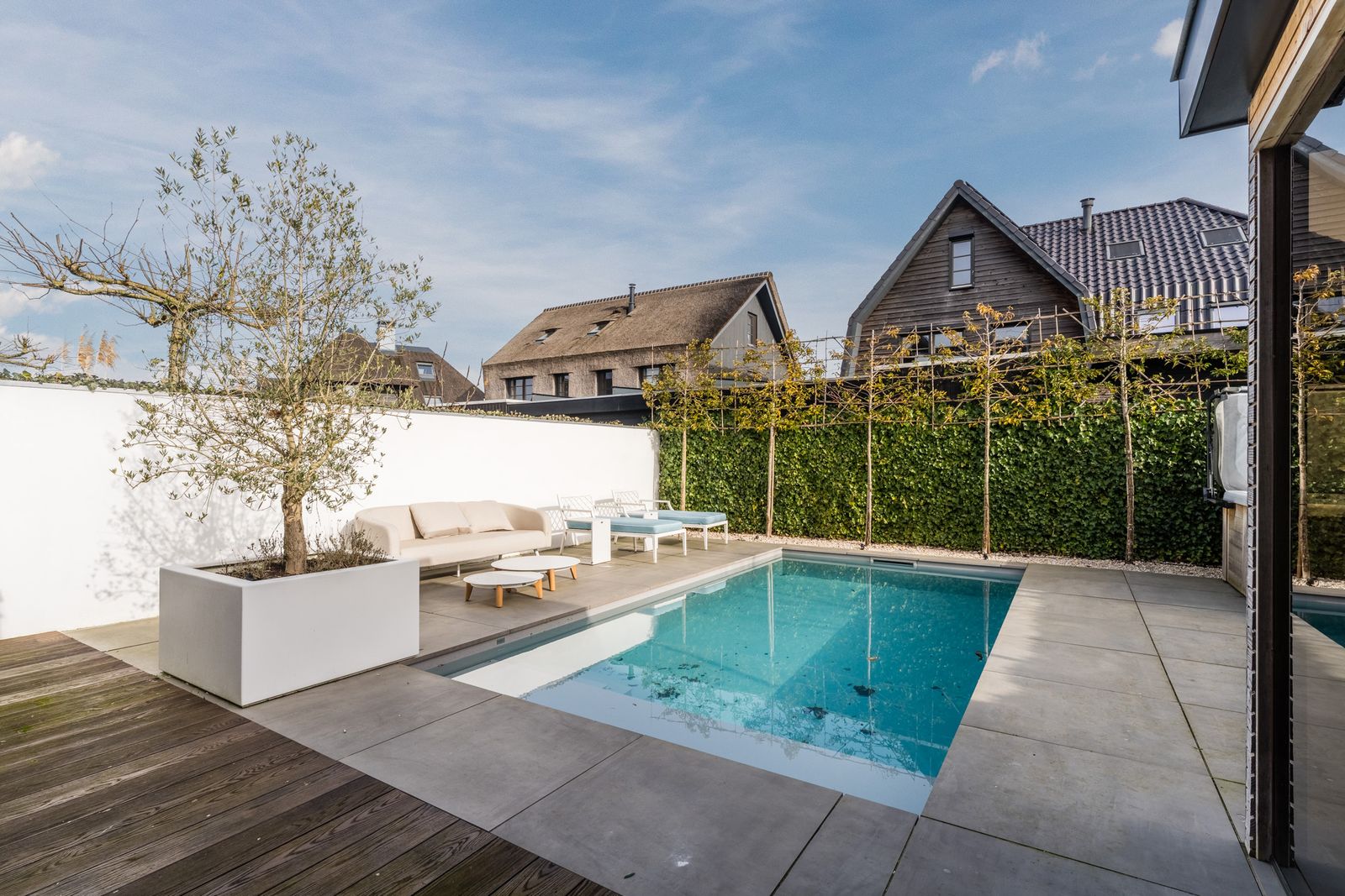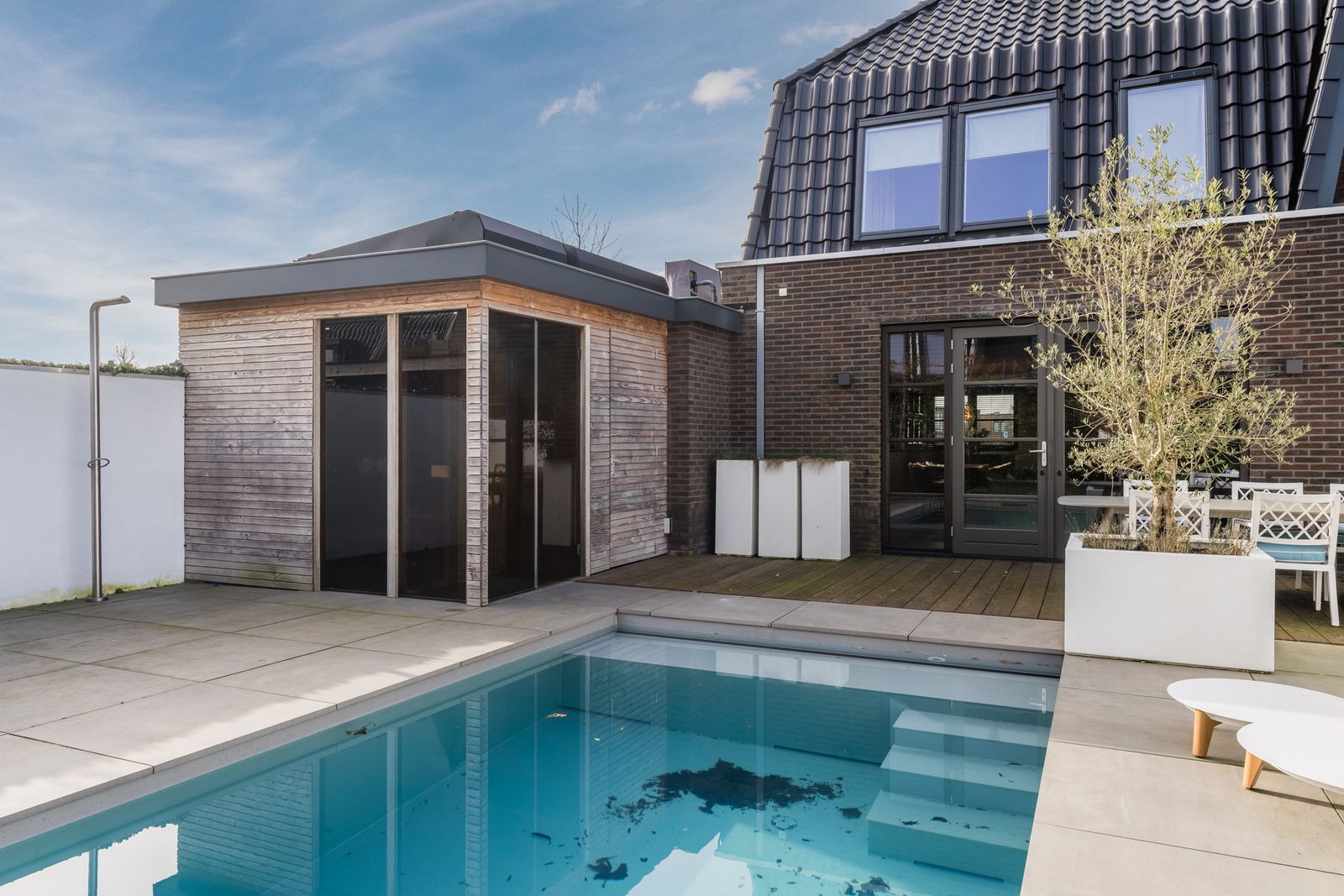Via de openslaande deuren loopt u zo de fraai aangelegde tuin in, waar ontspanning en comfort centraal staan. Hier vindt u een zwembad dat veilig is voor kleine kinderen die nog niet kunnen zwemmen, evenals een jacuzzi en sauna. Een perfecte setting om in alle rust te ontspannen of juist te genieten met familie en vrienden.