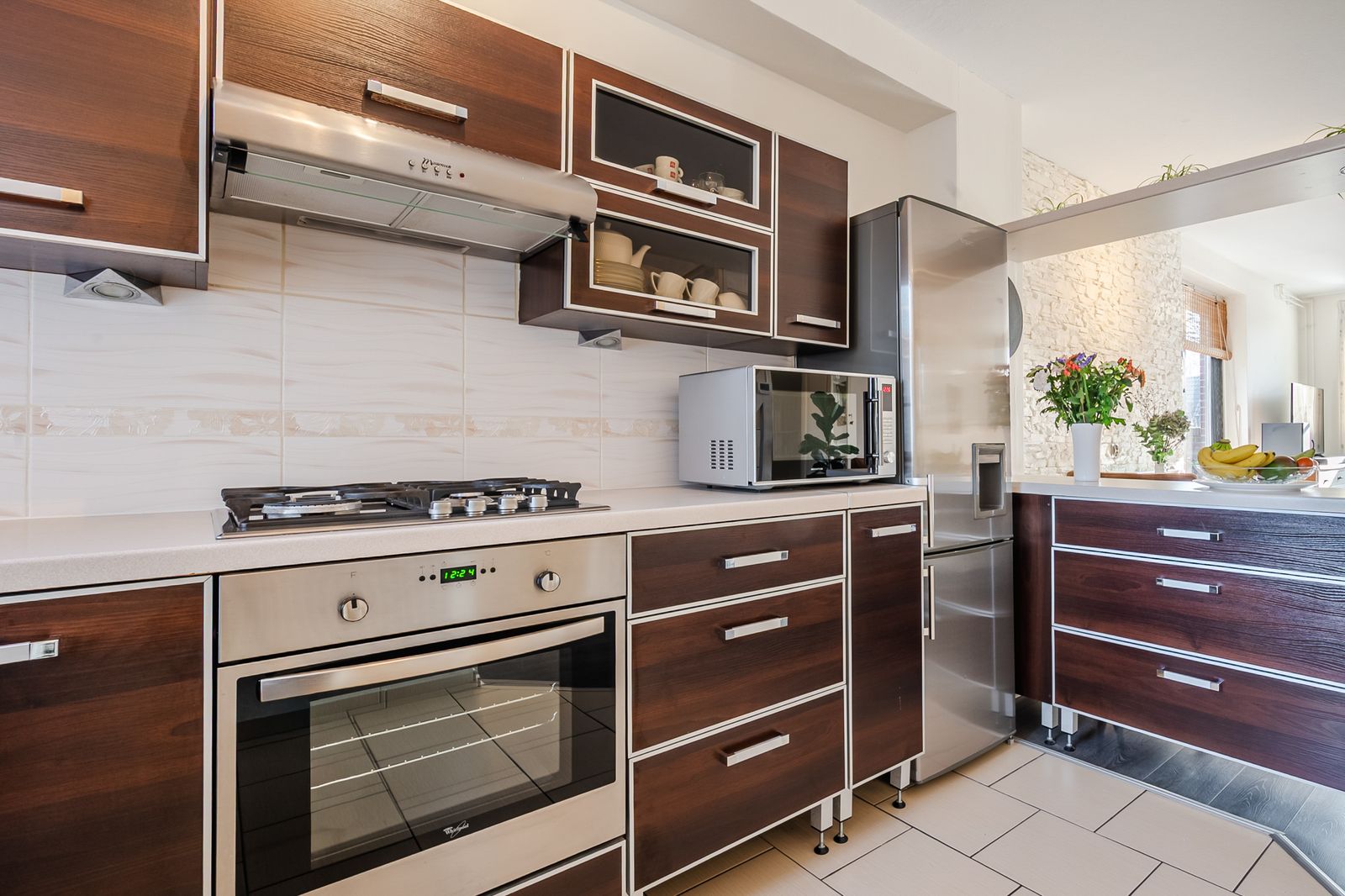 - Open kitchen (approx. 3.91 x 2.57 m) at the front of the apartment, fitted with an oven, dishwasher, gas hob and extractor hood;