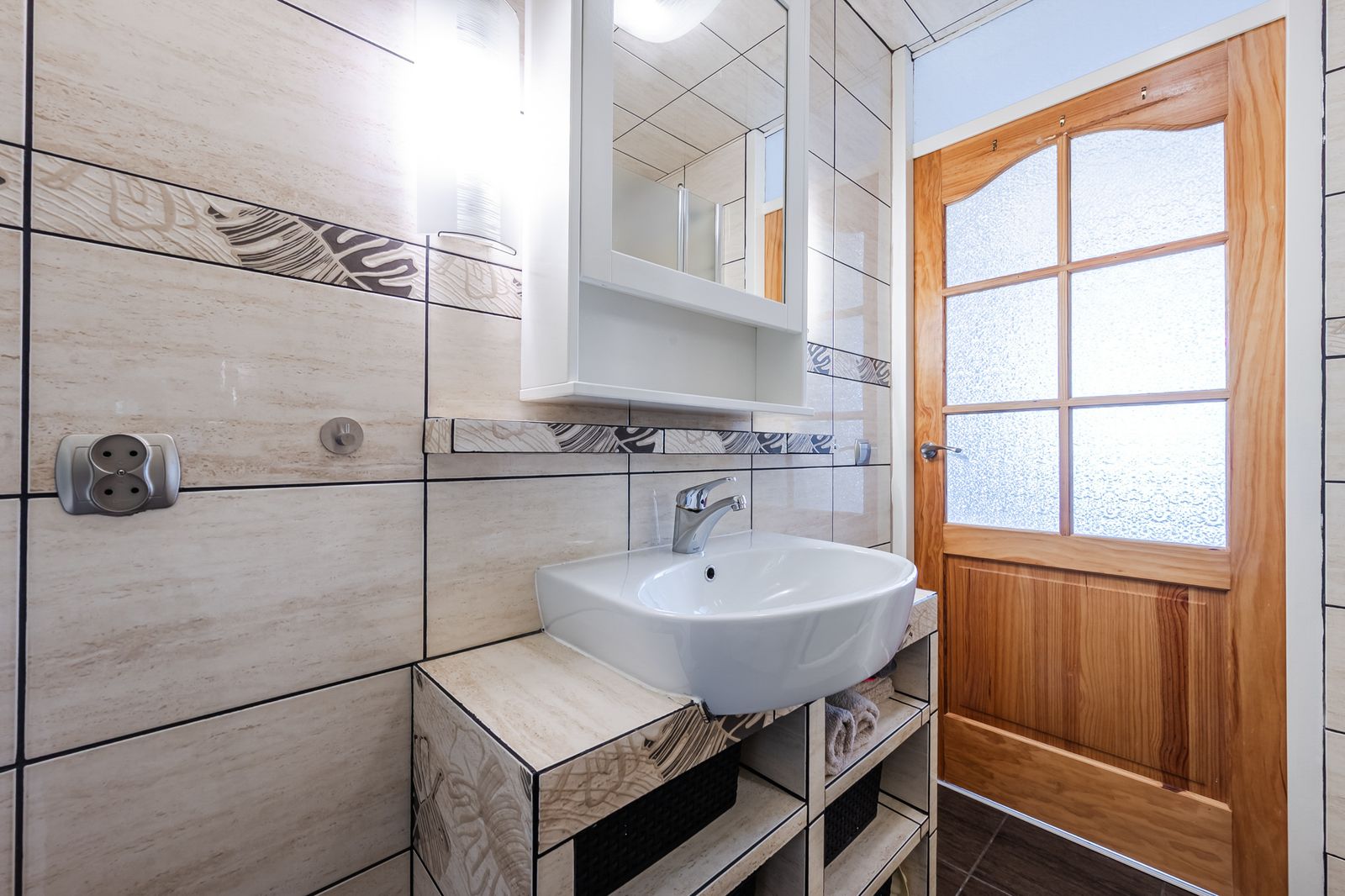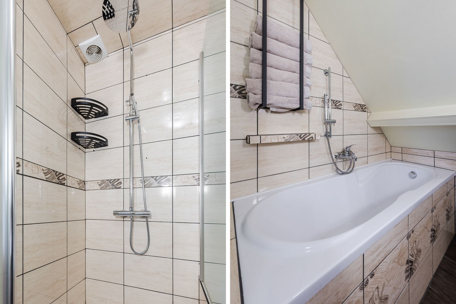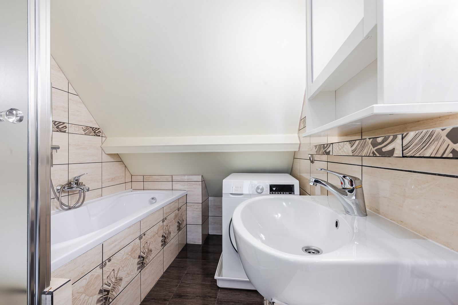 - Bathroom equipped with a bathtub, separate shower cabin, washbasin and space for a washing machine.