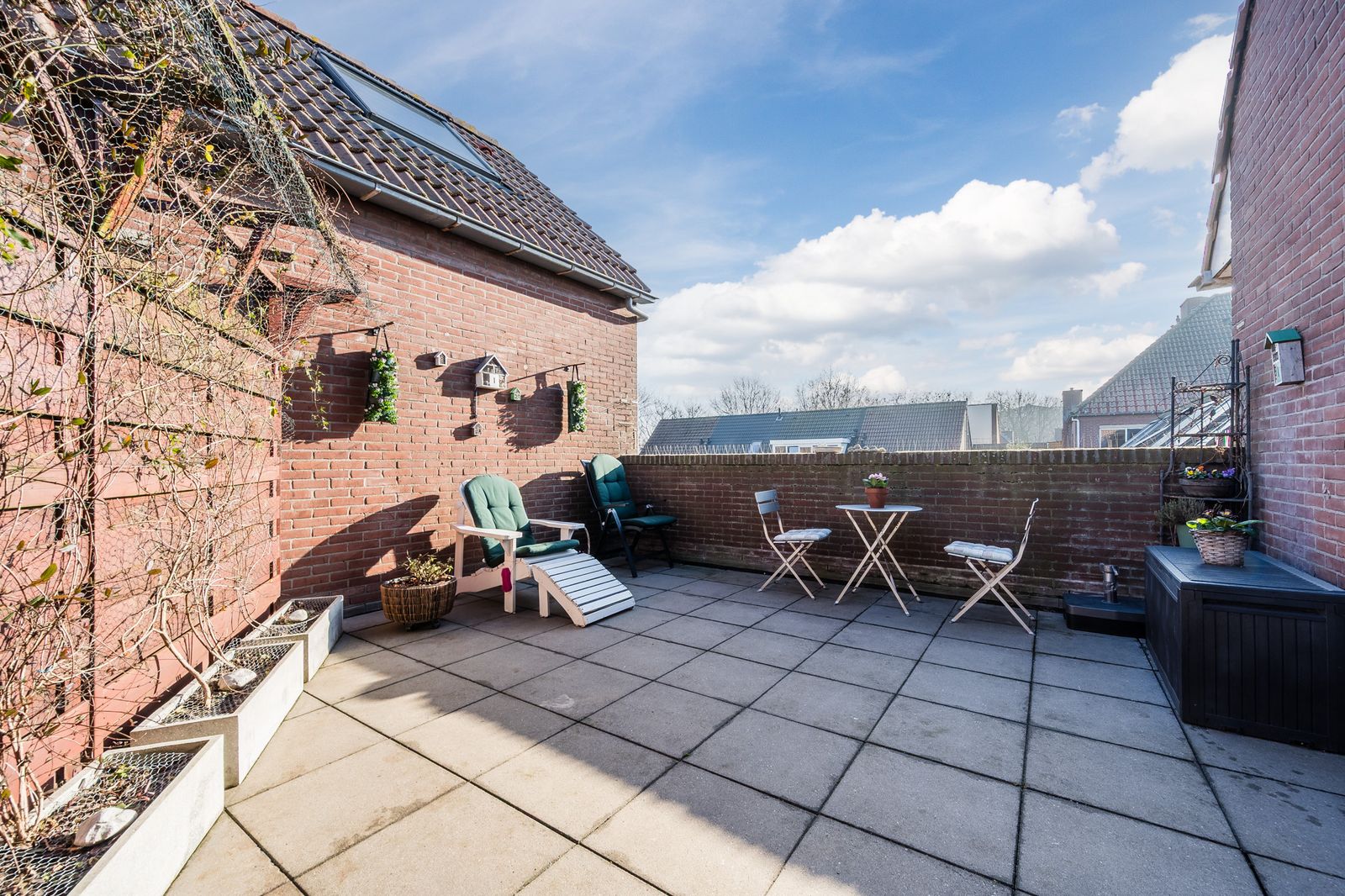 Maar het pareltje van deze woning is toch wel het zonnige dakterras, gelegen op het zuiden. In de zomer schijnt de zon van 's ochtends vroeg tot eind van de middag. Hierdoor voelt het terras als een tweede woonkamer. In de winter zie je de kleurrijke zonsopkomst tussen de bomen door. Nog een voordeel: Deze woning inclusief dakterras heeft geen inkijk, wat voor een prettig gevoel van privacy zorgt.