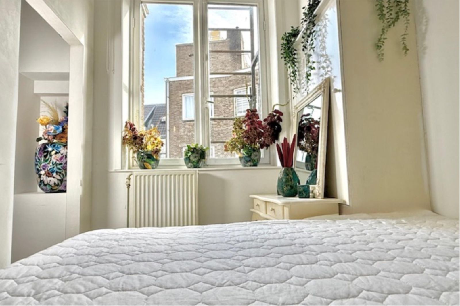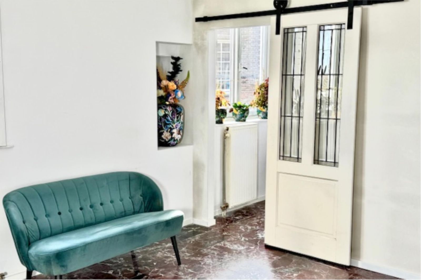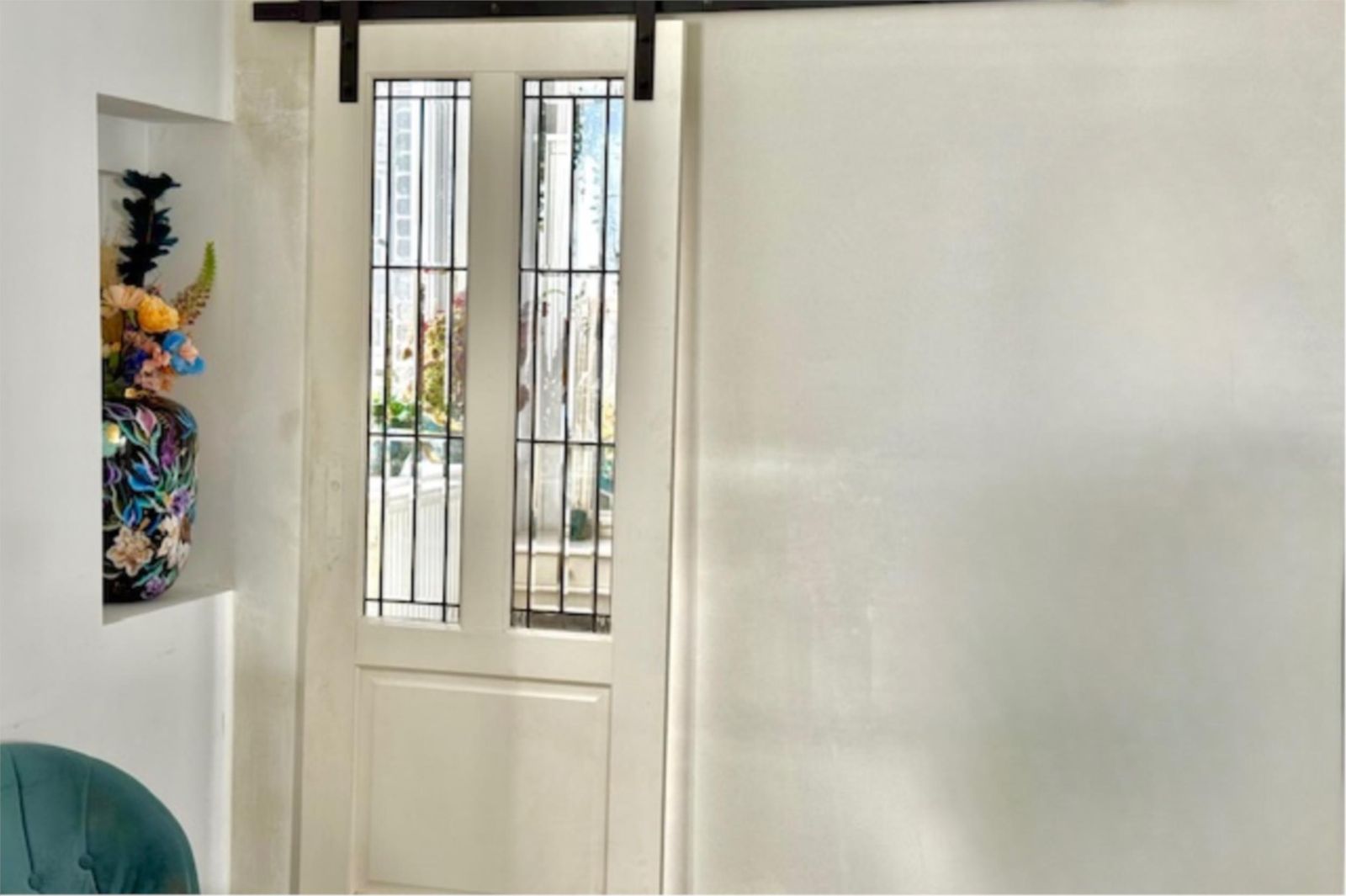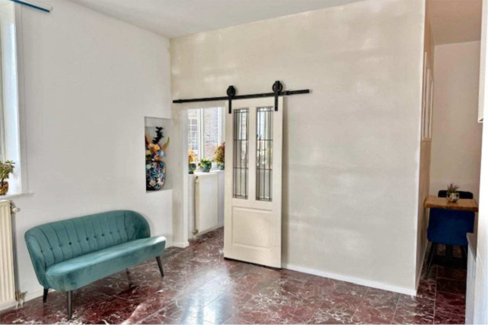 Recent is er een extra slaapkamer gerealiseerd, voorzien van prachtige glas-in-looddeuren en twee glas-in-loodramen met dubbel glas. Hierdoor blijft de geur uit de keuken buiten de slaapkamer en behoudt de ruimte een lichte, karaktervolle uitstraling. De wanden zijn volledig gestukt en gewit, en de kamer is voorzien van een moderne schuifdeur met zwarte accenten.