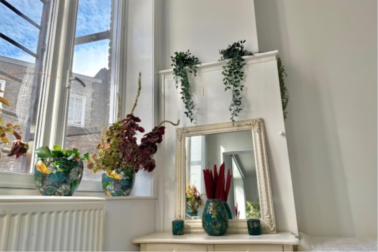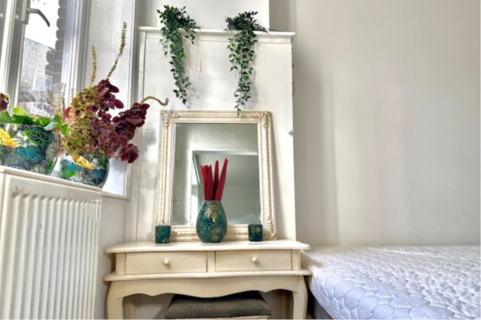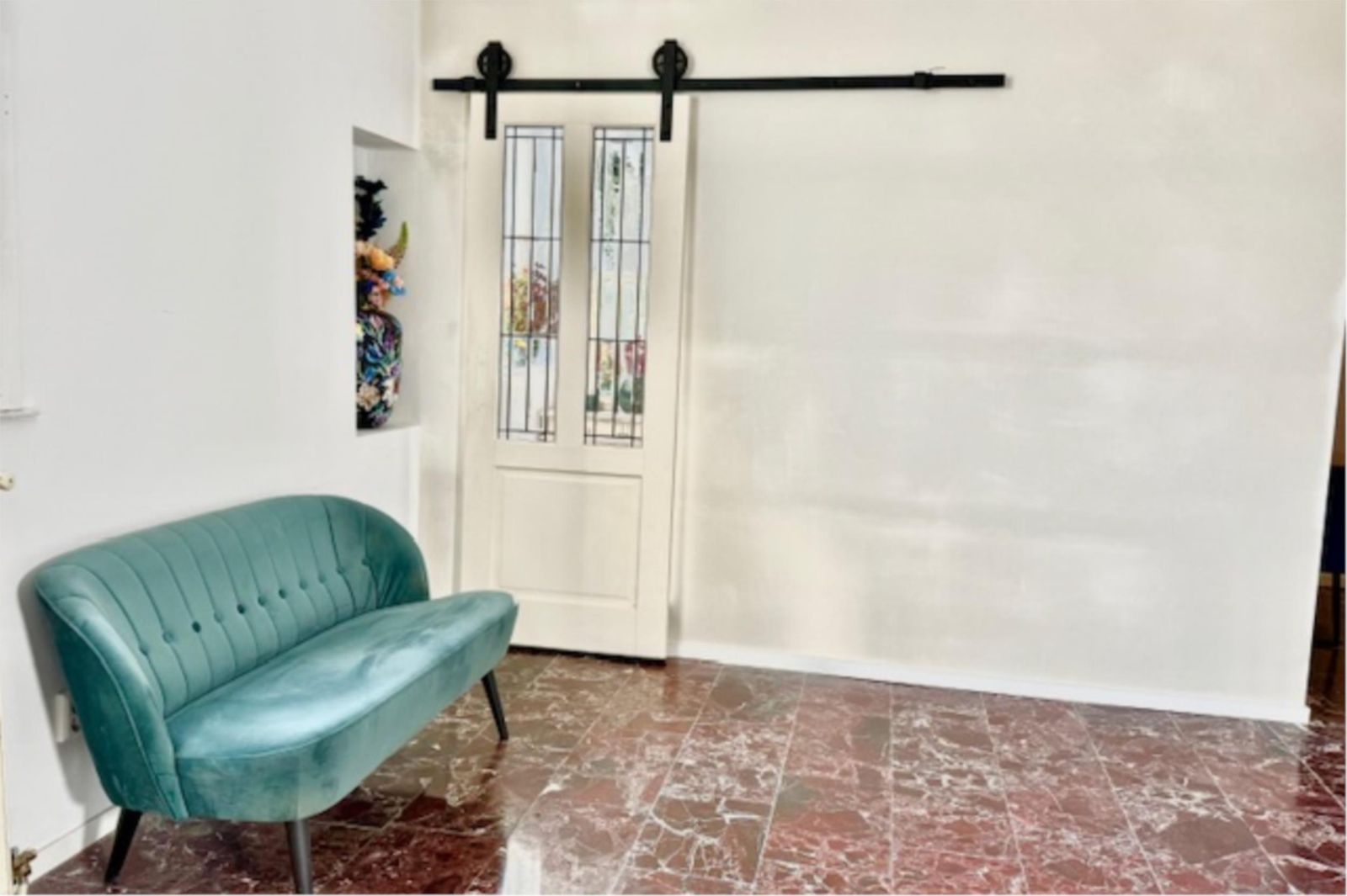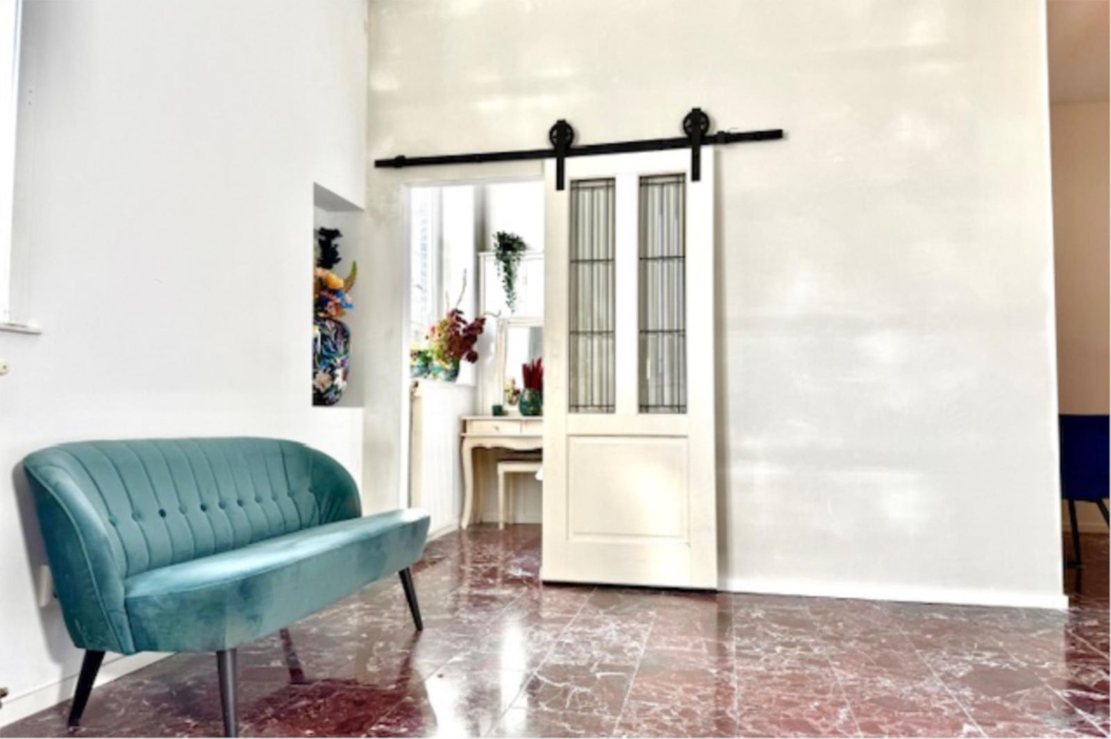 Recent is er een extra slaapkamer gerealiseerd, voorzien van prachtige glas-in-looddeuren en twee glas-in-loodramen met dubbel glas. Hierdoor blijft de geur uit de keuken buiten de slaapkamer en behoudt de ruimte een lichte, karaktervolle uitstraling. De wanden zijn volledig gestukt en gewit, en de kamer is voorzien van een moderne schuifdeur met zwarte accenten.