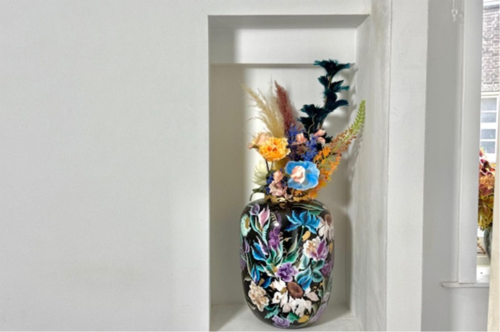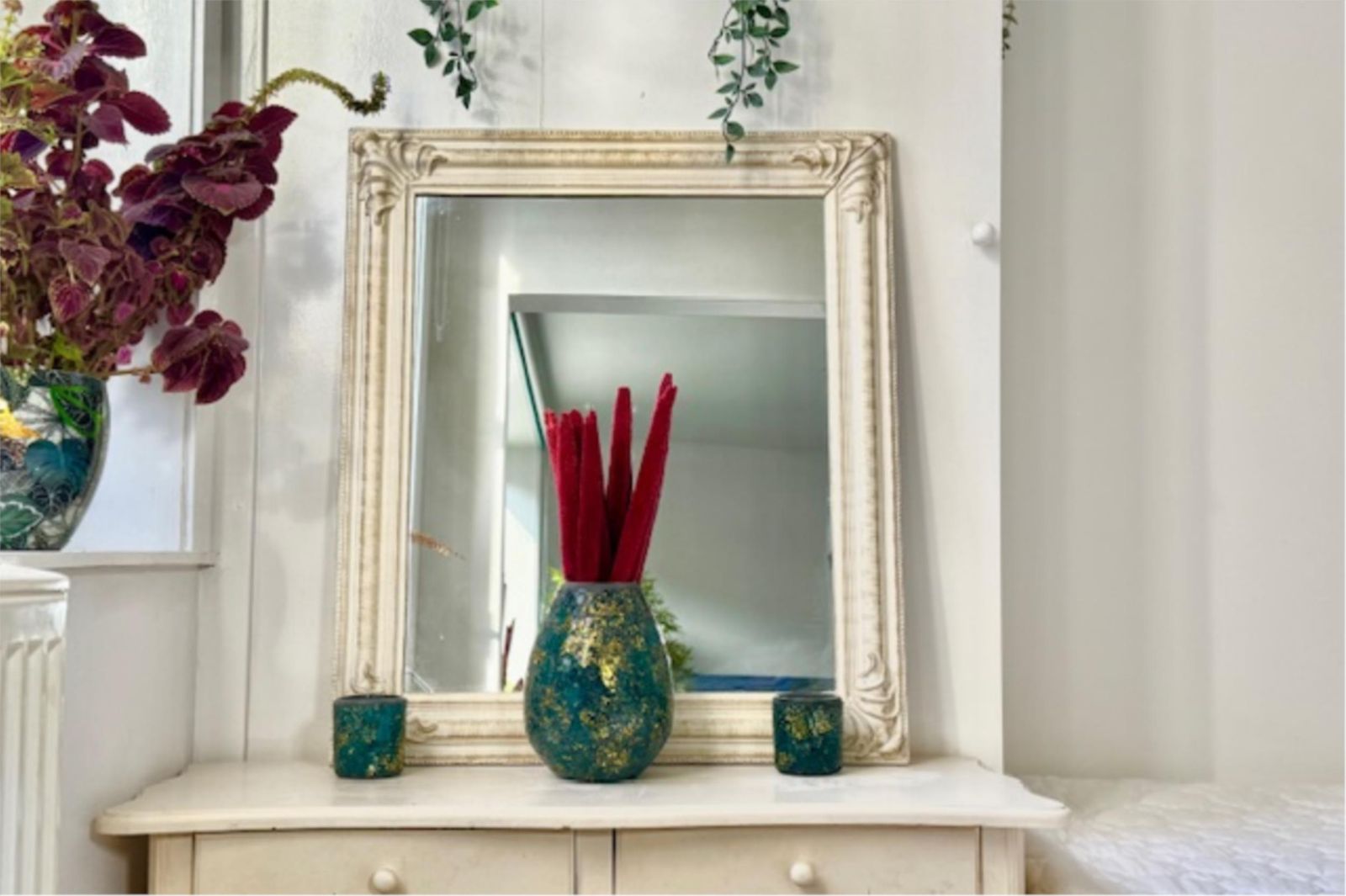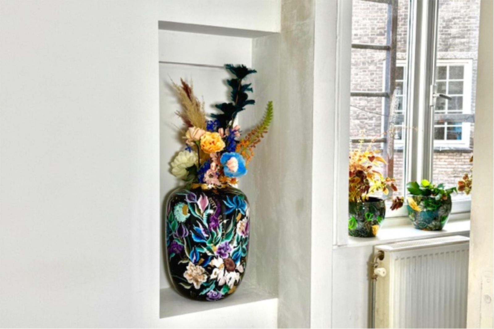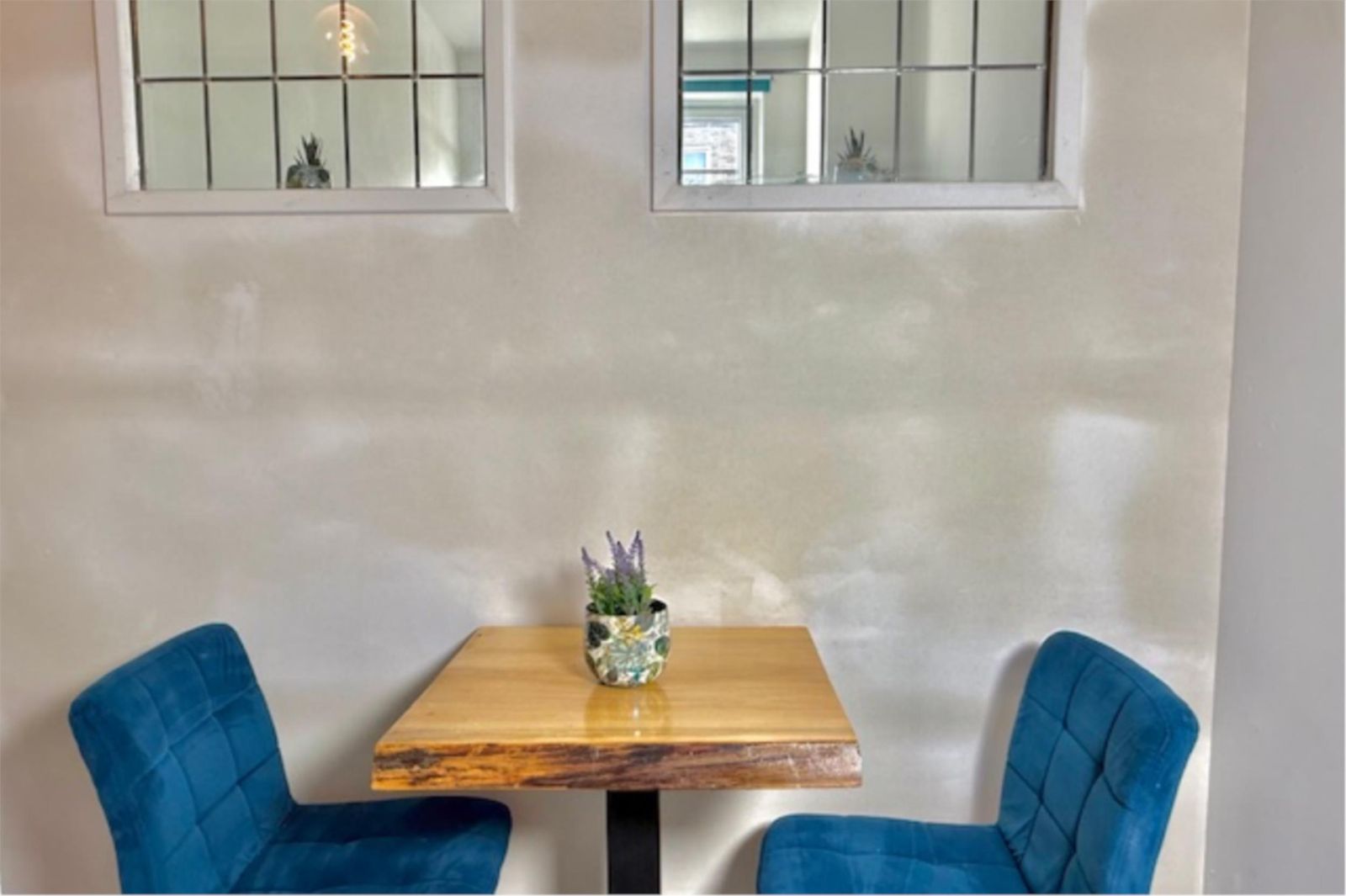 Recent is er een extra slaapkamer gerealiseerd, voorzien van prachtige glas-in-looddeuren en twee glas-in-loodramen met dubbel glas. Hierdoor blijft de geur uit de keuken buiten de slaapkamer en behoudt de ruimte een lichte, karaktervolle uitstraling. De wanden zijn volledig gestukt en gewit, en de kamer is voorzien van een moderne schuifdeur met zwarte accenten.