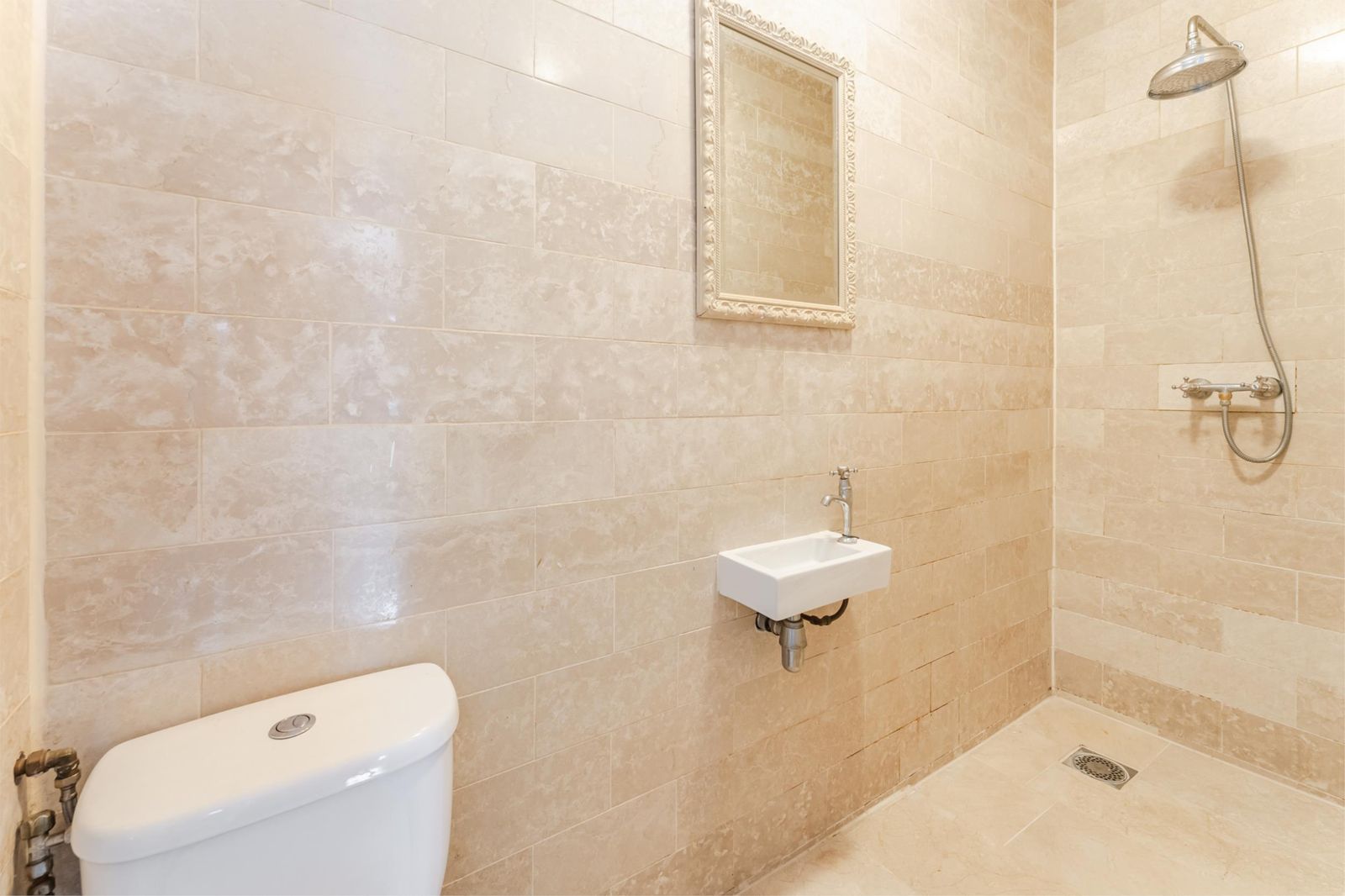 De keuken is voorzien van een wit keukenblok, gasfornuis met oven, afzuigkap en voldoende opbergruimte. De nieuwe slaapkamer biedt ruimte voor een tweepersoonsbed en nachtkastjes. De badkamer is modern afgewerkt met marmeren tegels en beschikt over een toilet, fontein en regendouche.
