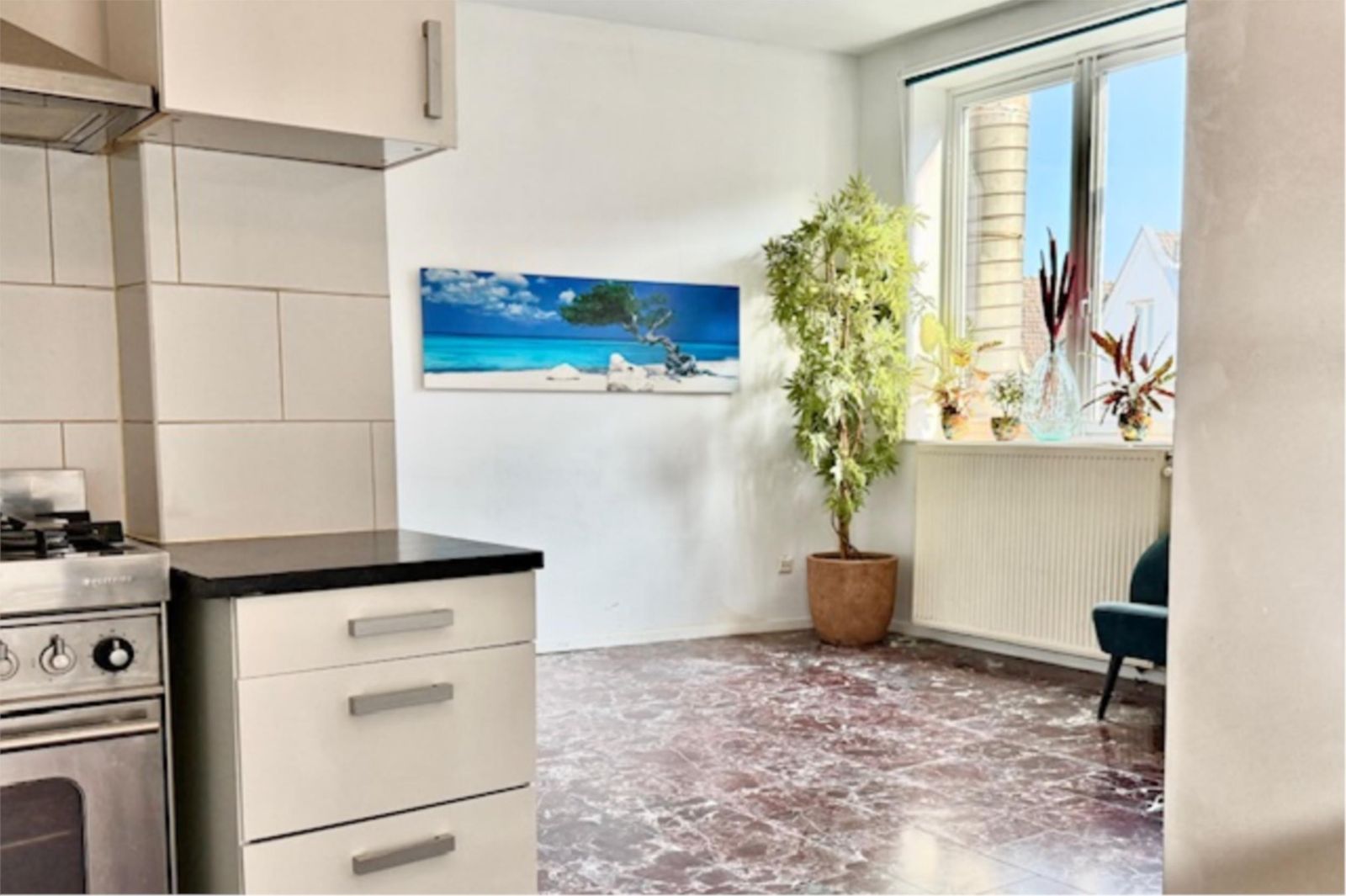 Via het goed onderhouden trappenhuis bereik je de eerste verdieping. De lichte woonkamer met open keuken vormt het hart van de woning.