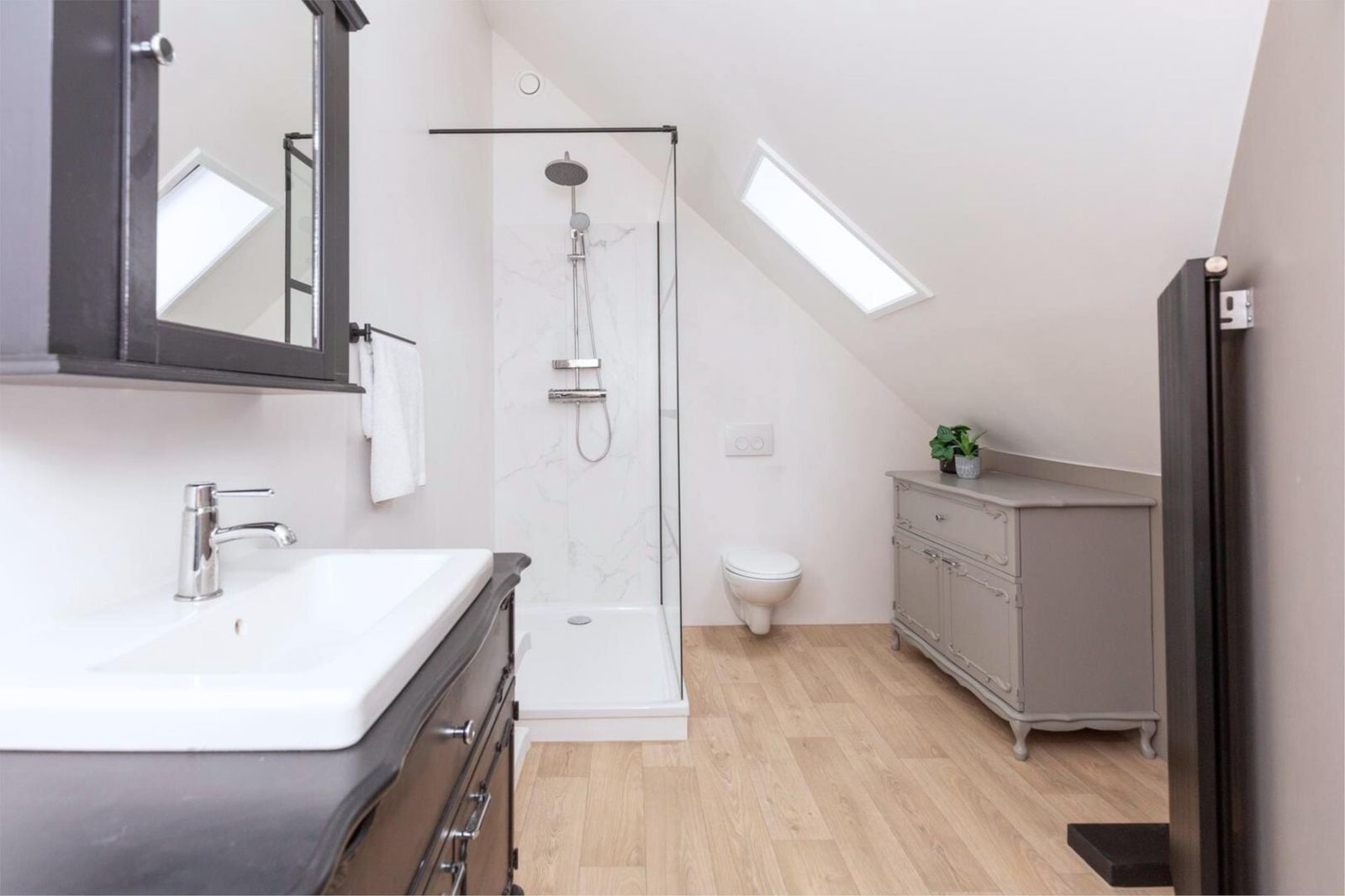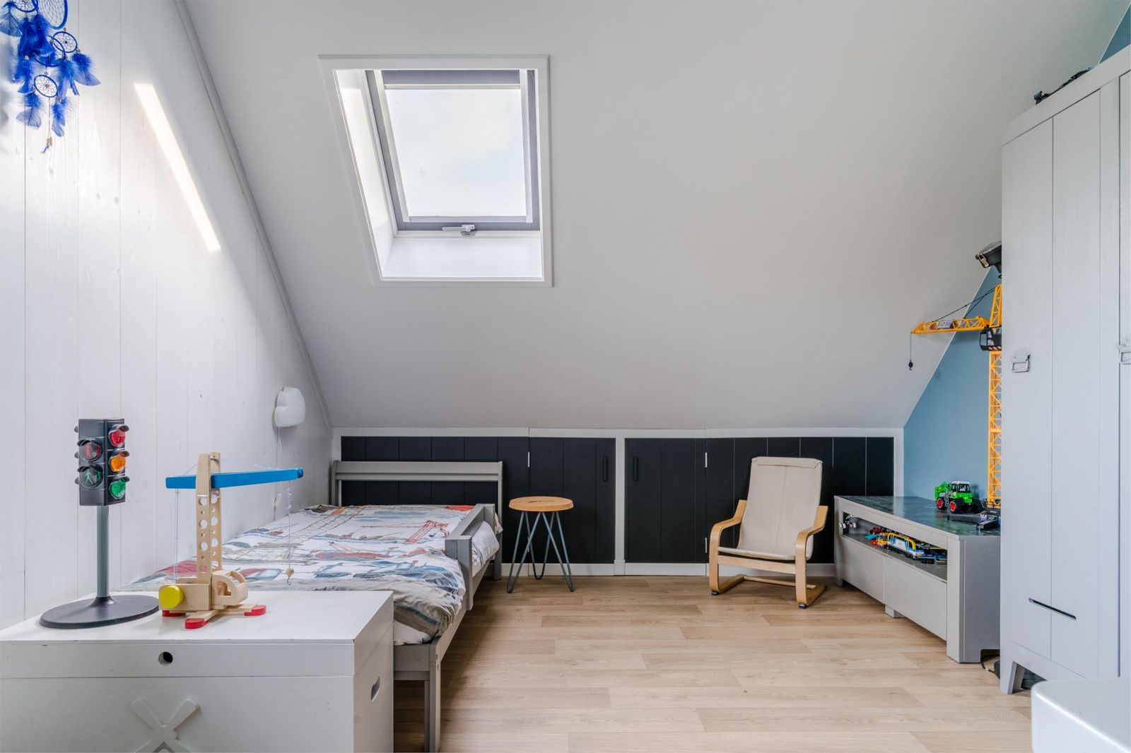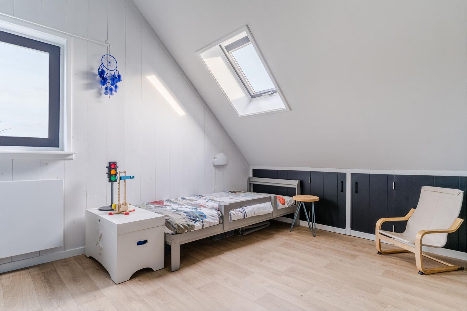 Eerste verdieping: overloop, ruime slaapkamer met extra privacy, inloopkast, wastafel, bergruimte en technische ruimte. Twee grote slaapkamers met speelse hoogte (waarvan één met gezellige kinderbedstede), tweede badkamer met douche, toilet en wastafelmeubel.
