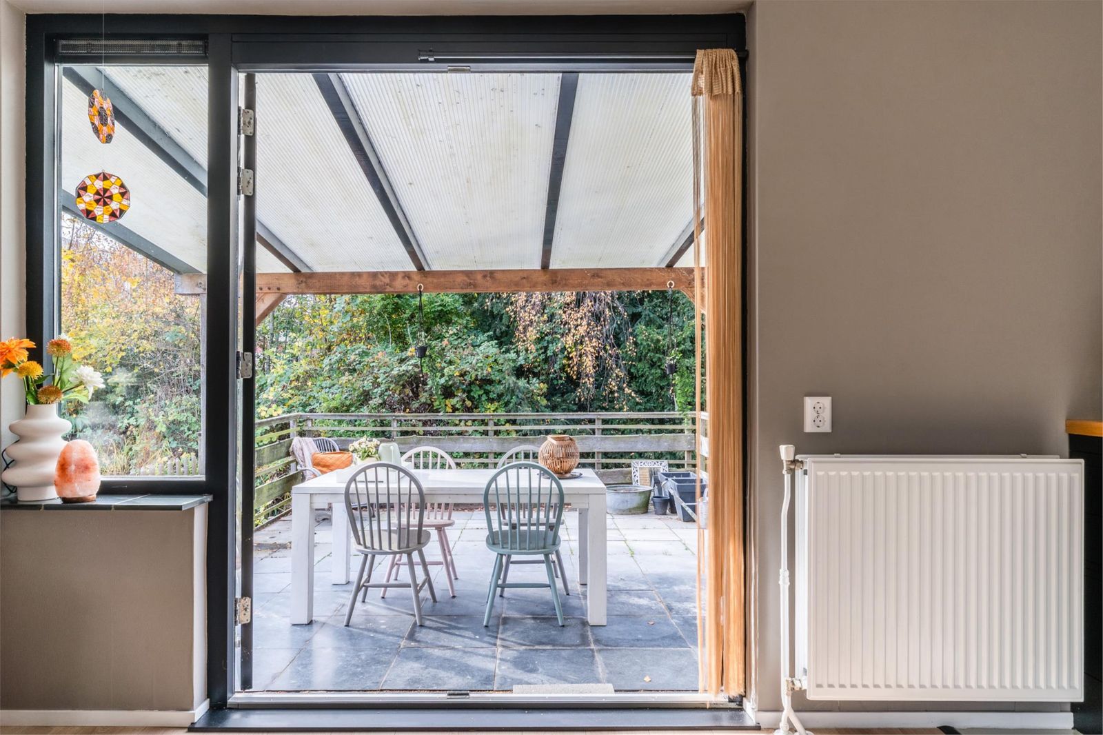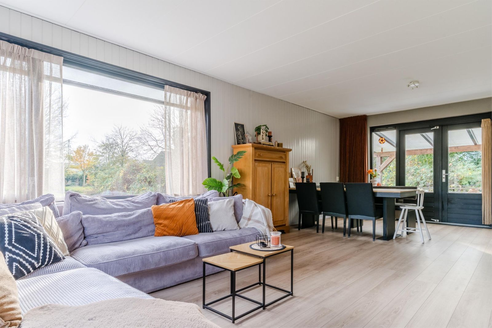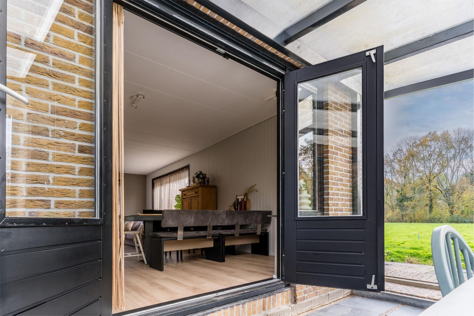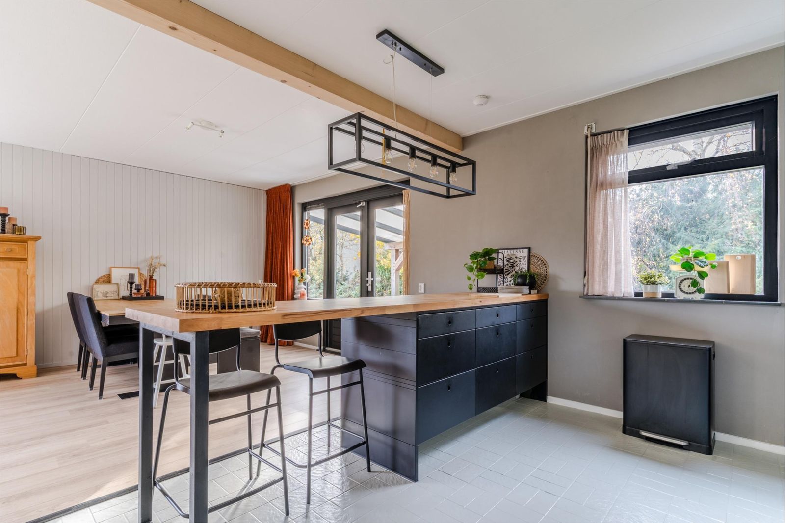 Binnen is het licht, sfeervol en comfortabel. De woonkamer met openslaande deuren naar de overkapping vormt samen met de open keuken met bar het hart van het huis. Hier leef je, kook je en geniet je, met de tuin altijd dichtbij via de openslaande deuren naar het terras.