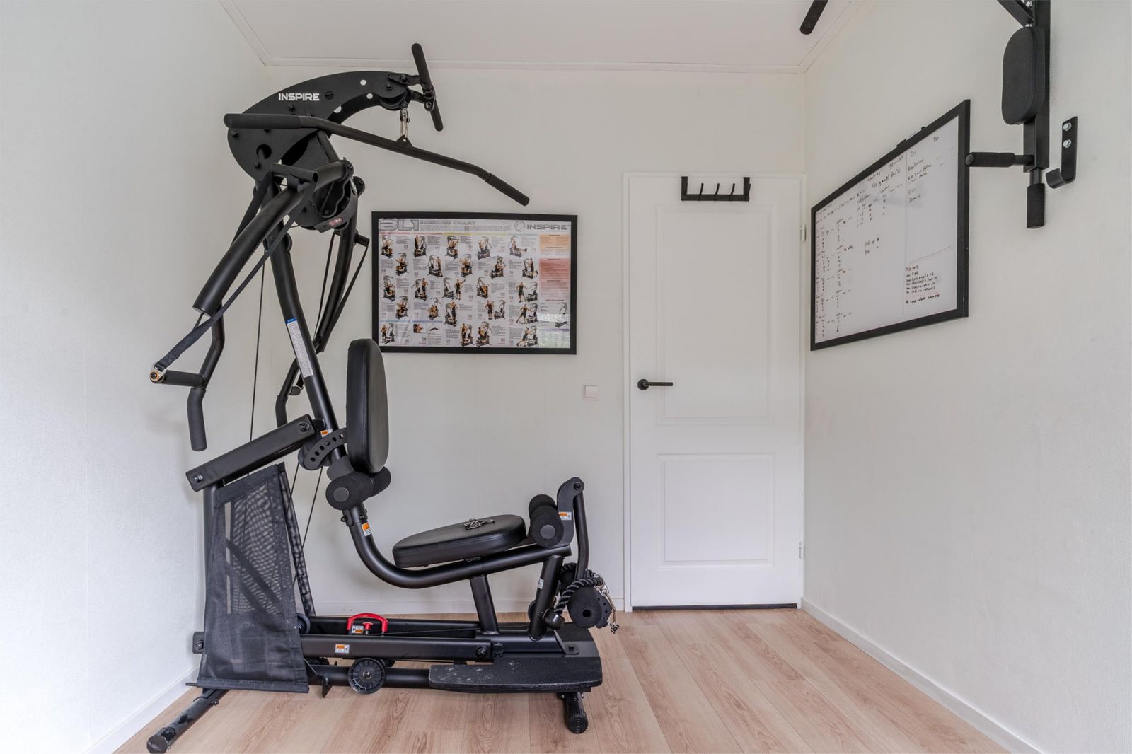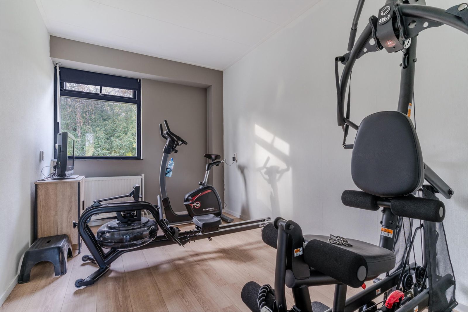 Begane grond: entree met fraaie spiltrap en meterkast, lichte woonkamer met dubbele tuindeuren en open keuken met bar. Gang met toegang tot drie slaapkamers, waarvan één nu ingericht als homegym, separaat toilet, badkamer met ligbad, douche en wastafel. Bijkeuken met aansluitingen voor wasmachine en droger, inpandig bereikbare garage met bergzolder.