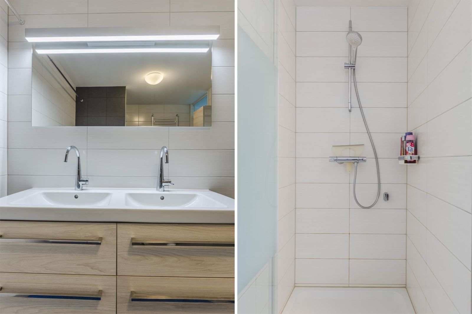 •Moderne badkamer met ruime douche, dubbele wastafel en tweede toilet