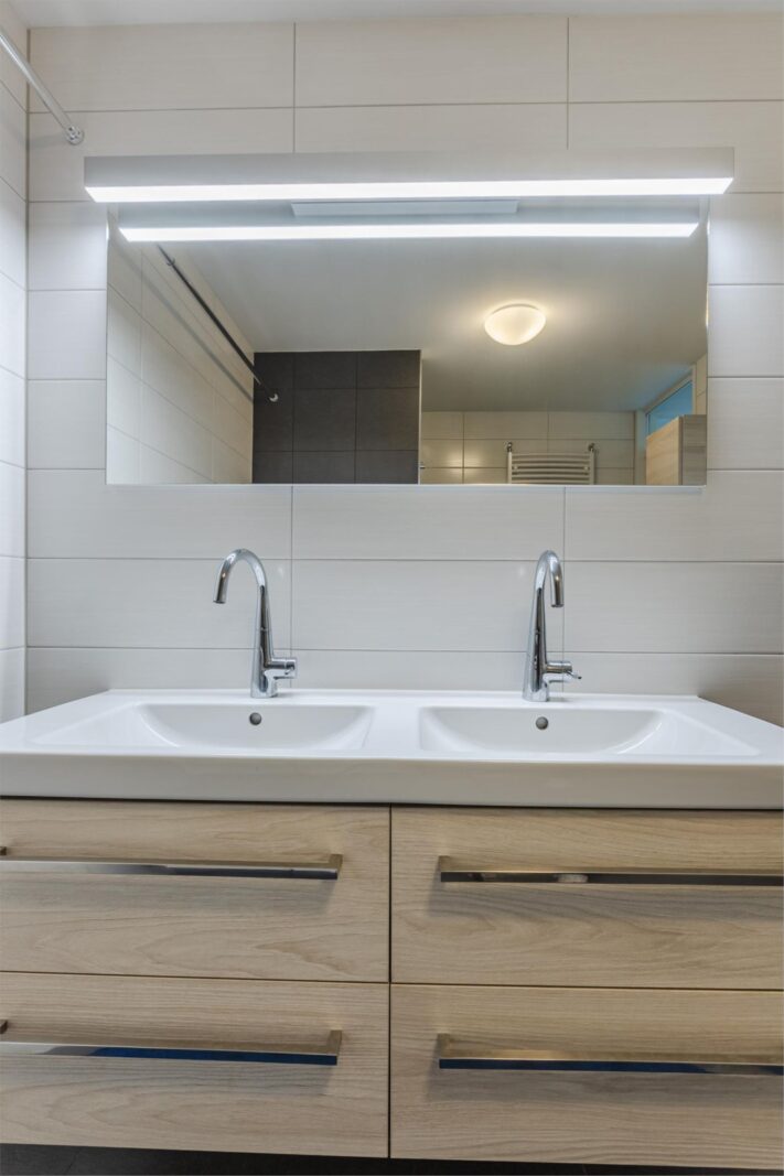 De moderne geheel betegelde badkamer is uitgerust met een douche met glazen deur. Het wastafelmeubel met dubbele wastafel, de 2 opberg meubelen en het tweede toilet zijn zwevend gemonteerd.