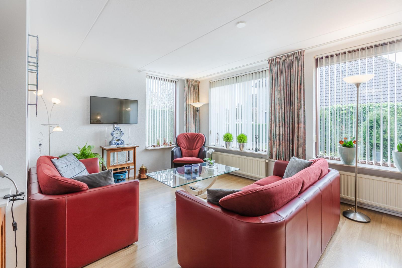 De L-vormige lichte woonkamer biedt, via een groot raam aan de achterzijde, uitzicht op het terras en de fraai aangelegde, zonnige tuin. De ramen aan de voorzijde zijn voorzien van sunscreens.
