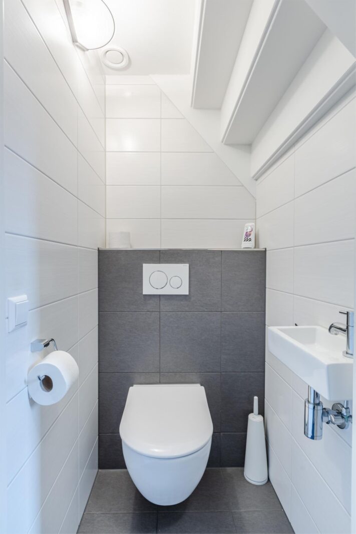 •Geheel betegeld toilet op de begane grond met zwevend closet en fonteintje