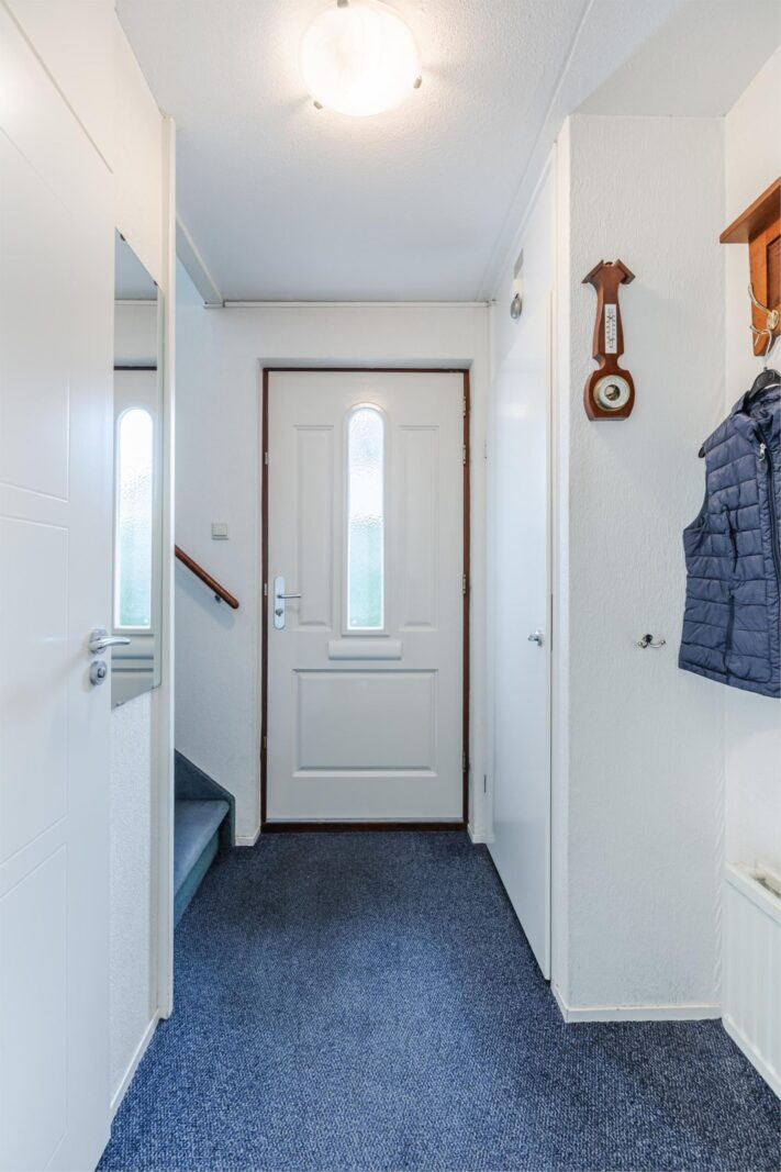 Binnenkomst in een verzorgde hal met meterkast (voorzien van extra groepen en aansluitingen voor de zonnepanelen, witgoed en het laadpunt) en modern volledig betegeld toilet met zwevend closet en fonteintje.