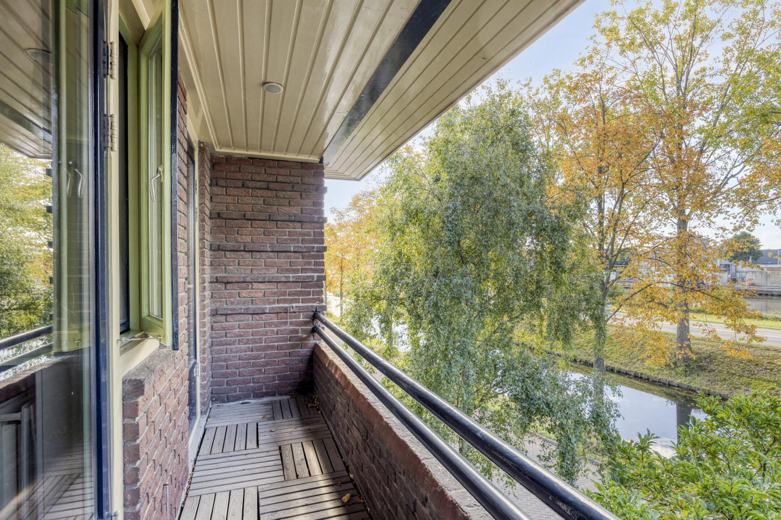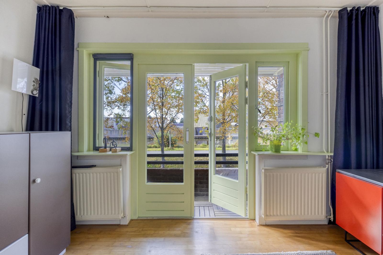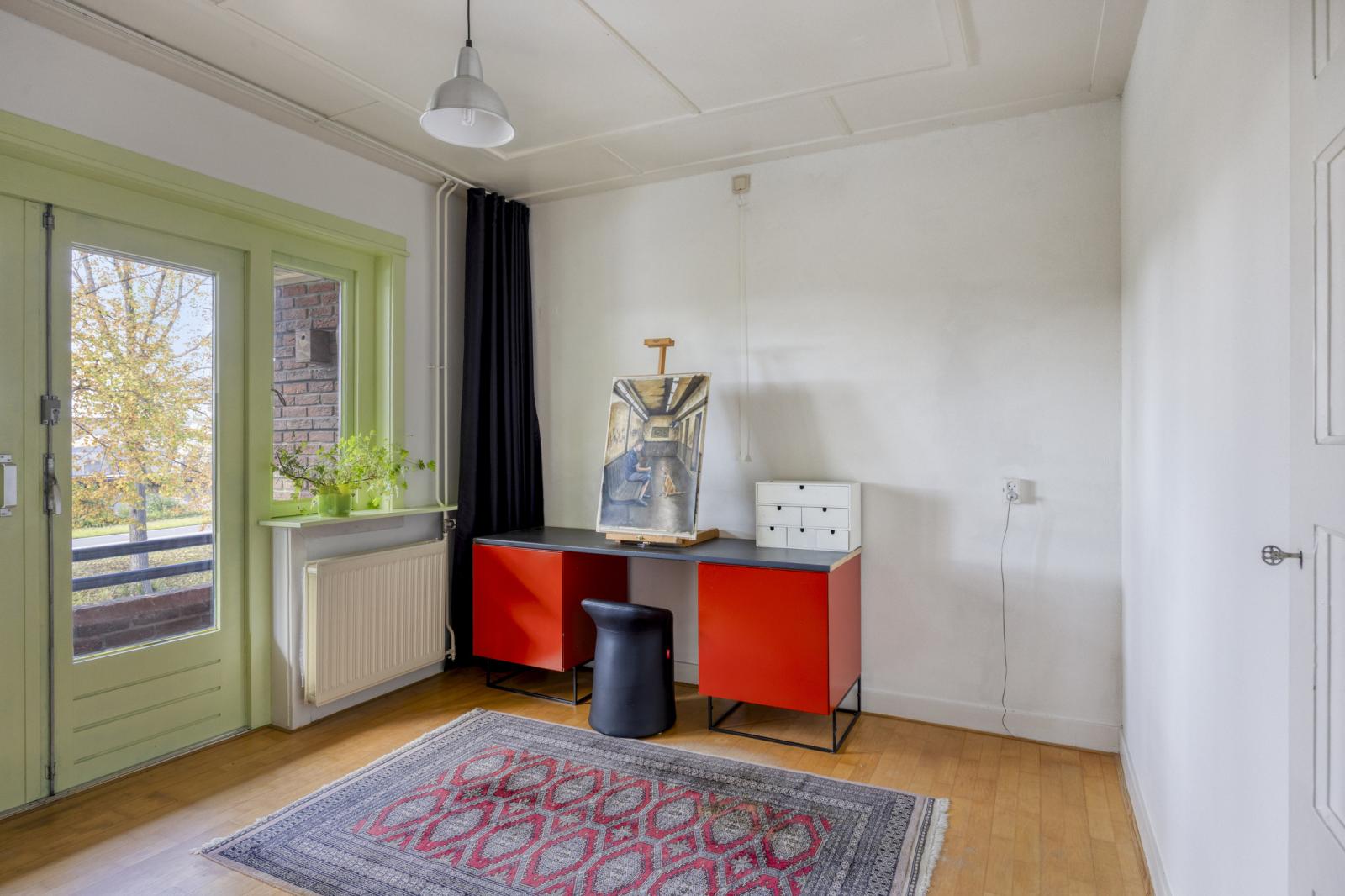 Access to the living room with lots of natural light (large windows) and unobstructed views of the Gouwe canal. Features include a fireplace with a natural stone finish, a beautiful oak wooden floor, and original details such as stained-glass upper windows.