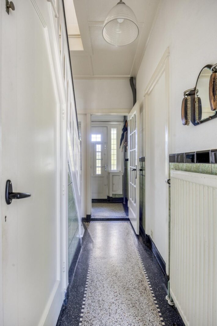 Uitnodigende chique jaren 30 entree/hal, originele granitovloer en wandtegelwerk, meterkast, trapopgang, trap naar het souterrain en toilet v.v. wandcloset met fontein.