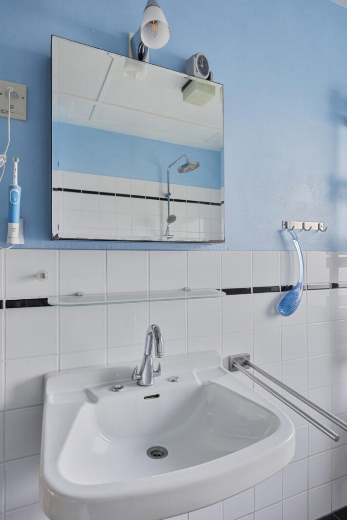 Inviting and chic 1930s-style entrance/hall, with original terrazzo flooring and wall tiles, utility closet, staircase to the upper floors, stairs to the basement, and toilet with wall-mounted closet and washbasin.